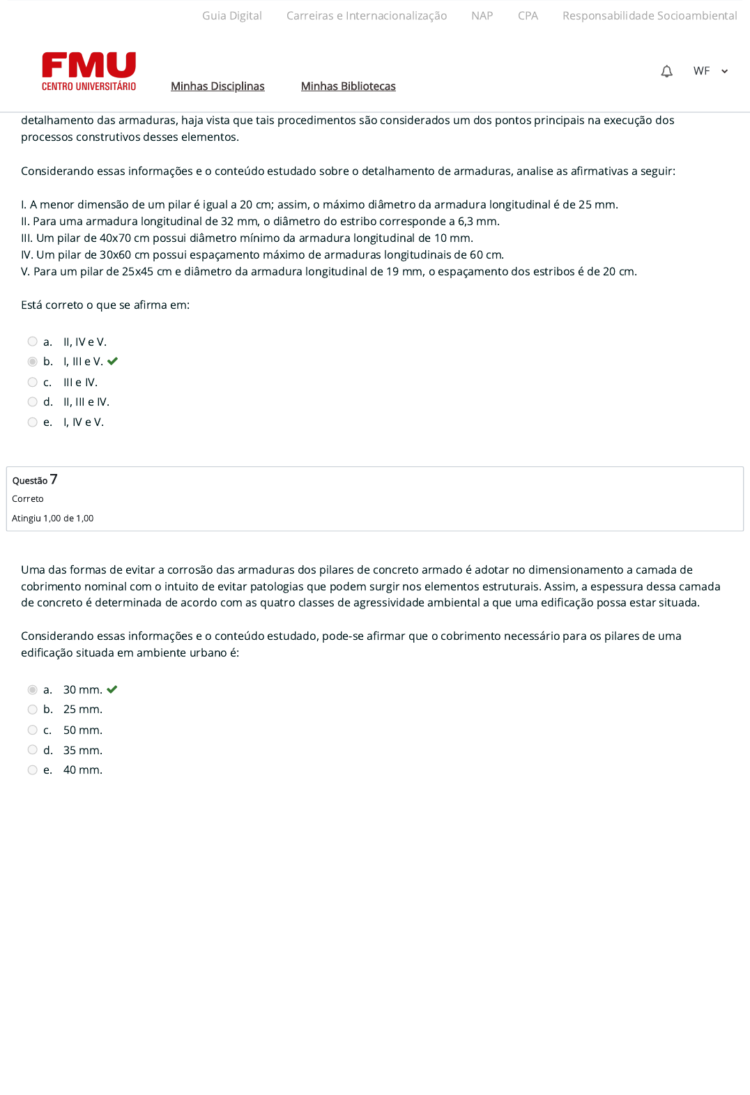 Guia Digital Carreiras e Internacionalização NAP CPA Responsabilidade Socioambiental FMU WF CENTRO UNIVERSITÁRIO Minhas Disciplinas Minhas Bibliotecas detalhamento das armaduras, haja vista que tais procedimentos são considerados um dos pontos principais na execução dos processos construtivos desses elementos. Considerando essas informações e conteúdo estudado sobre detalhamento de armaduras, analise as afirmativas a seguir: I. A menor dimensão de um pilar é igual a 20 cm; assim, máximo diâmetro da armadura longitudinal é de 25 mm. II. Para uma armadura longitudinal de 32 mm, diâmetro do estribo corresponde a 6,3 mm. III. Um pilar de 40x70 cm possui diâmetro mínimo da armadura longitudinal de 10 mm. IV. Um pilar de 30x60 cm possui espaçamento máximo de armaduras longitudinais de 60 cm. V. Para um pilar de 25x45 cm e diâmetro da armadura longitudinal de 19 mm, espaçamento dos estribos é de 20 cm. Está correto que se afirma em: a. II, b. C. III e IV. d. II, III e IV. e. I, Questão 7 Correto Atingiu 1,00 de 1,00 Uma das formas de evitar a corrosão das armaduras dos pilares de concreto armado é adotar no dimensionamento a camada de cobrimento nominal com intuito de evitar patologias que podem surgir nos elementos estruturais. Assim, a espessura dessa camada de concreto é determinada de acordo com as quatro classes de agressividade ambiental a que uma edificação possa estar situada. Considerando essas informações e conteúdo estudado, pode-se afirmar que cobrimento necessário para pilares de uma edificação situada em ambiente urbano é: a. 30 mm. b. 25 mm. C. 50 mm. d. 35 mm. e. 40 mm.