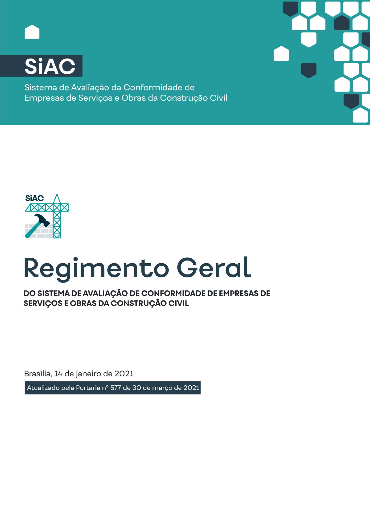 1 2 Presidente da República Jair Messias Bolsonaro Ministro de Estado do Desenvolvimento Regional Rogério Simonetti Marinho Secretário Nacional de Habitação Alfredo Eduardo dos Santos Coordenadora-Geral do PBQP-H Rhaiana Bandeira Santana Equipe Técnica Maick William Muniz Cariri José Sérgio dos Passos Oliveira Antônio Eurípedes Rosa Rafael Núbile de Moraes Fábio Martins de Lima Apoio Administrativo Luiza de Paula de Oliveira Botelho Raiane Julião da Silva Miranda Comitê Nacional de Desenvolvimento Tecnológico da Habitação Secretaria Nacional de Habitação do Ministério do Desenvolvimento Regional Secretaria de Desenvolvimento da Indústria, Comércio, Serviços e Inovação da Secretaria Especial de Produtividade, Emprego e Competitividade do Ministério da Economia Ministério da Ciência, Tecnologia, Inovações e Comunicações Ministério do Meio Ambiente Associação Brasileira de COHABs e Agentes Públicos de Habitação Associação Brasileira de Incorporadoras Imobiliárias Associação Nacional de Tecnologia do Ambiente Construído Associação Nacional dos Comerciantes de Material de Construção Banco do Brasil S.A. Caixa Econômica Federal Câmara Brasileira da Indústria da Construção Conselho de Arquitetura e Urbanismo do Brasil Conselho Federal de Engenharia e Agronomia Comitê Brasileiro da Construção Civil da Associação Brasileira de Normas Técnicas Conselho Brasileiro de Construção Sustentável Financiadora de Estudos e Projetos Fórum dos Gerentes de Programas Setoriais da Qualidade do PBQP-H Instituto Nacional de Metrologia, Qualidade e Tecnologia Serviço Brasileiro de Apoio às Micro e Pequenas Empresas Serviço Nacional de Aprendizagem Industrial Sindicato Nacional das Empresas de Arquitetura e Engenharia Consultiva 3 SUMÁRIO PORTARIA Nº 75, DE 14 DE JANEIRO DE 2021 .................................................................................................................................. 4 PORTARIA Nº 577, DE 30 DE MARÇO DE 2021 ................................................................................................................................. 6 REGIMENTO GERAL DO SIAC ........................................................................................................................................................... 7 CAPÍTULO I – Princípios e Objetivos ................................................................................................................................................................... 7 CAPÍTULO II –Definições ..................................................................................................................................................................................... 8 CAPÍTULO III – Normas e Documentação de Referência .................................................................................................................................. 12 CAPÍTULO IV – Estrutura e Atribuições dos Membros ....................................................................................................................................... 13 CAPÍTULO V – Procedimentos e Obrigações dos Organismos de Avaliação da Conformidade Autorizados .................................................... 15 CAPÍTULO VI – Incidência .................................................................................................................................................................................. 16 CAPÍTULO VII – Processo de Certificação........................................................................................................................................................... 17 CAPÍTULO VIII – Qualificação dos Auditores e da Equipe Técnica ..................................................................................................................... 18 CAPÍTULO IX – Sistema de Melhoria Contínua e Supervisão ............................................................................................................................. 18 CAPÍTULO X – Faltas, Sanções e Penalidades..................................................................................................................................................... 18 CAPÍTULO XI – Disposições Finais e Transitórias ............................................................................................................................................... 20 ANEXO 1 – REGIMENTO ESPECÍFICO DA ESPECIALIDADE TÉCNICA EXECUÇÃO DE OBRAS DO SIAC ................................................. 21 ANEXO 2 – REFERENCIAL NORMATIVO PARA NÍVEL “A” DA ESPECIALIDADE TÉCNICA EXECUÇÃO DE OBRAS DO SIAC ................... 34 1 – Objetivo ...................................................................................................................................................................................................... 34 2 – Referências Normativas .............................................................................................................................................................................. 38 3 – Termos e Definições .................................................................................................................................................................................... 39 4 – Contexto da Empresa Construtora .............................................................................................................................................................. 39 5 – Liderança ..................................................................................................................................................................................................... 41 6 – Planejamento .............................................................................................................................................................