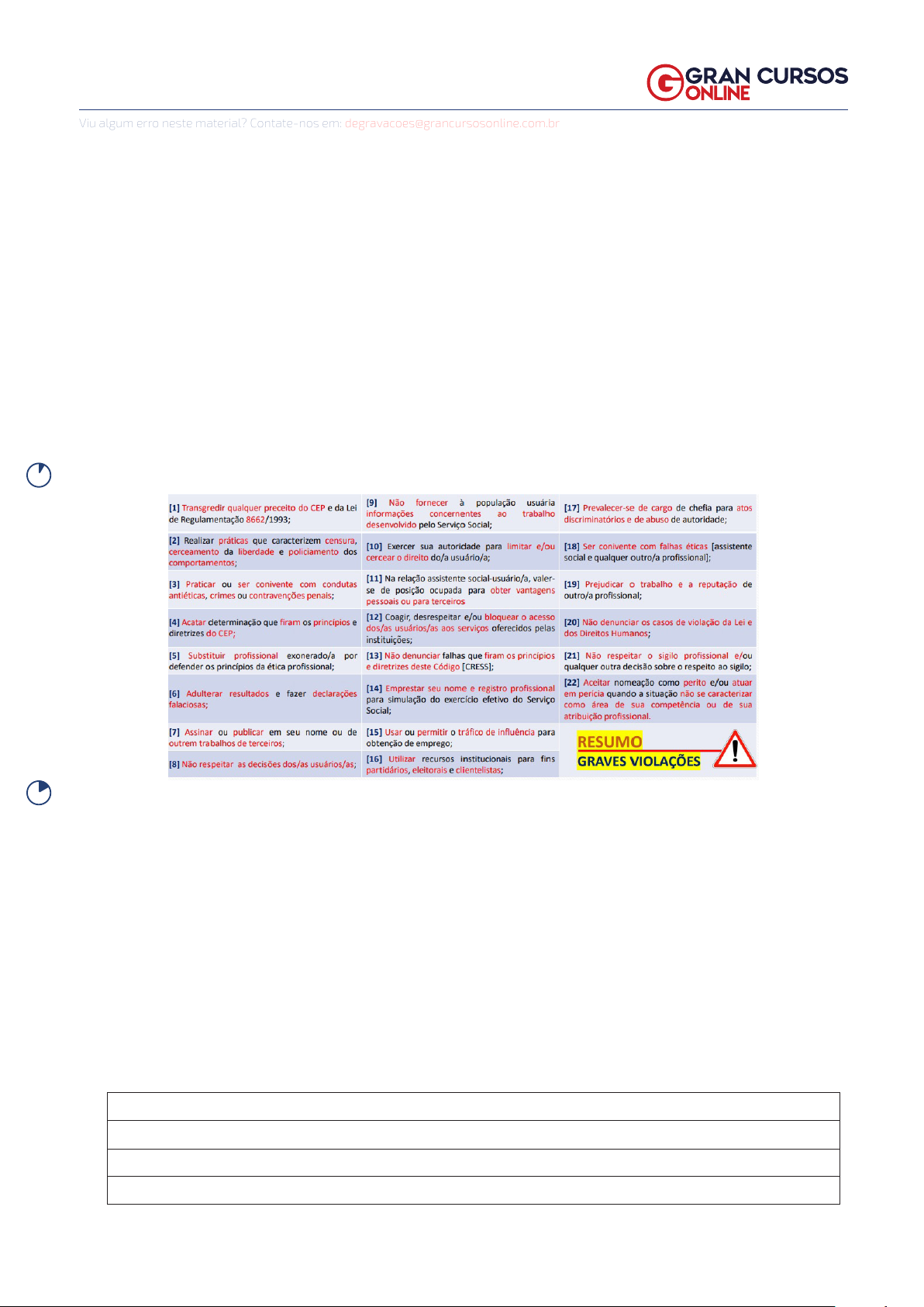 1 www.grancursosonline.com.br Viu algum erro neste material? Contate-nos em: degravacoes@grancursosonline.com.br Código de Ética do Assistente Social XI CÓDIGO DE ÉTICA DO SERVIÇO SOCIAL A N O TA ÇÕ ES CÓDIGO DE ÉTICA DO ASSISTENTE SOCIAL XI Art. 26. Serão considerados na aplicação das penas os antecedentes profissionais do/a infrator/a e as circunstâncias em que ocorreu a infração. Art. 27. Salvo nos casos de gravidade manifesta [observar o art. 28], que exigem aplicação de pe- nalidades mais rigorosas, a imposição das penas obedecerá à gradação estabelecida pelo artigo 24. Art. 28. Para efeito da fixação da pena serão considerados especialmente graves as violações que digam respeito às seguintes disposições [26]: [1] artigo 3º - alínea c; [2] artigo 4º - alínea a, b, c, g, i, j; [3] artigo 5º - alínea b, f; [4] artigo 6º - alínea a, b, c; [5] artigo 8º - alínea b; [6] e artigo 9º - alínea a, b, c; [7] artigo11 - alínea b, c, d; [8] artigo 13 - alínea b; [9] artigo 14; [10] artigo 16; [11] artigo 17; [12] Parágrafo único do artigo 18; [13] artigo 19 - alínea b; [14] artigo 20 - alínea a, b. Parágrafo único. As demais violações não previstas no caput, uma vez consideradas graves, auto- rizarão aplicação de penalidades mais severas, em conformidade com o artigo 26. • Maus antecedentes profissionais; • Circunstâncias desfavoráveis da ocorrência da infração. A advertência reservada ocorre entre o conselheiro e o acesso social denunciado. Art. 29. A advertência reservada, ressalvada a hipótese prevista no artigo 33, será confidencial, sendo que a advertência pública, suspensão e a cassação do exercício profissional serão efetivadas 5m 10m 2 www.grancursosonline.com.br Viu algum erro neste material? Contate-nos em: degravacoes@grancursosonline.com.br Código de Ética do Assistente Social XI CÓDIGO DE ÉTICA DO SERVIÇO SOCIAL A N O TA ÇÕ ES através de publicação em Diário Oficial e em outro órgão da imprensa, e afixado na sede do CRESS e/ou na Delegacia Seccional do CRESS da jurisdição de seu domicílio. Art. 33. Na execução da pena de advertência reservada, não sendo encontrado o/a penalizado/a ou se este/a, após duas convocações, não comparecer no prazo fixado para receber a penalidade, será ela tornada pública. Art. 30. Cumpre ao Conselho Regional a execução das decisões proferidas nos processos discipli- nares. Art. 31. Da imposição de qualquer penalidade caberá recurso com efeito suspensivo ao CFESS. (Remédio jurídico destinado a uma instância superior) Art. 32. A punibilidade do assistente social, por falta sujeita a processo ético e disciplinar, prescreve em 5 (cinco) anos, contados da data da verificação do fato respectivo. (Previsto no Art. 1º da Lei n. 6838, de 29 de outubro de 1980) Art. 33. Na execução da pena de advertência reservada não sendo encontrado o/a penalizado/a ou se este/a, após duas convocações, não comparecer [...] será ela tornada pública. § 1º. A pena de multa será publicada nos termos do artigo 29 [em Diário Oficial, outro órgão da imprensa, na sede do CRESS, na Delegacia Seccional do CRESS] deste Código, se não for devida- mente quitada no prazo de 30 (trinta) dias, sem prejuízo da cobrança judicial. § 2º. Em cassação do exercício profissional, além dos editais e das comunicações feitas às auto- ridades competentes interessadas no assunto, será apreendida a Carteira e Cédula de Identidade Profissional do/a infrator/a. Art. 34. A pena de multa variará entre o mínimo correspondente ao valor de uma anuidade e o má- ximo do seu décuplo. (Décuplo: 10 vezes mais o valor da anuidade à época da sua aplicação) Art. 35. As dúvidas na observância deste Código e os casos omissos serão resolvidos pelos CRESS ad referendum do CFESS, a quem cabe firmar jurisprudência. Art. 36. O presente Código entrará em vigor na data de sua publicação no Diário Oficial da União, revogando-se as disposições em contrário. (13 de março de 1993) DIRETO DO CONCURSO 1. (QUADRIX/2015/CRESS-PR/AGENTE FISCAL) De acordo com o Código de Ética Pro- fissional dos(as) Assistentes Sociais, as infrações ao Código acarretarão penalidades, na forma dos dispositivos legais ou regimentais. Sobre as penalidades previstas no Código de Ética Profissional dos(as) Assistentes Sociais, não é correto afirmar que: 15m 3 www.grancursosonline.com.br Viu algum erro neste material? Contate-nos em: degravacoes@grancursosonline.com.br Código de Ética do Assistente Social XI CÓDIGO DE ÉTICA DO SERVIÇO SOCIAL A N O TA ÇÕ ES a. a pena de suspensão acarreta ao(à) assistente social a interdição do exercício profis- sional em todo território nacional pelo prazo de 30 (trinta) dias a 2 (dois) anos. b. a suspensão por falta de pagamento de anuidades e taxas só cessará com satisfação do débito, podendo ser cassada a inscrição profissional após decorridos 3 (três) anos da suspensão. c. a pena de multa variará entre o mínimo correspondente ao valor de uma anuidade e o máximo de seu décuplo. d. da imposição de qualquer penalidade, caberá recurso com efeito suspensivo ao CRESS. e. na execução da advertência reservada, não sendo encontrado o(a) penalizado(a) ou se este(a), após duas convocações, não comparecer no prazo fixado para receber a penalidade, será ela tornada pública. 2. (FCM/2017/IF BAIANO/ASSISTENTE SOCIAL) Constituem penalidades aplicáveis às in- frações do Código de Ética do/a Assistente Social, EXCETO: a. Multa. b. Advertência pública. c. Advertência reservada. d. Suspensão do exercício profissional. e. Anulação do diploma de graduação. 3. (CESPE/2017/PREFEITURA DE SÃO LUIS/MA/TEC. MUN. DE NIVEL SUPERIOR) De acordo com o estabelecido no Código de Ética do Assistente Social, assinale a opção cor- reta, com relação às penalidades decorrentes de infrações. a. A penalidade de multa deve ser