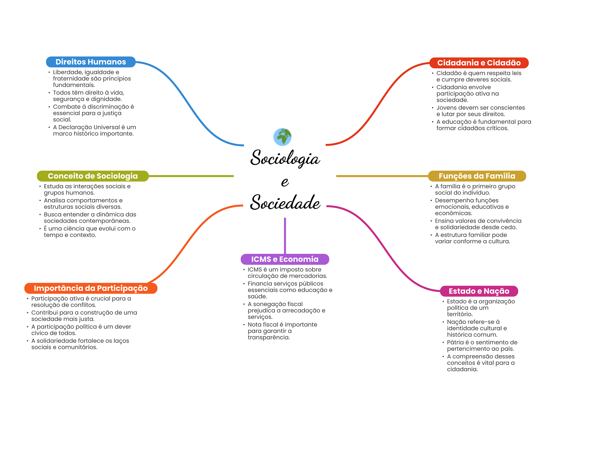 Direitos Humanos Cidadania e Cidadão Liberdade, igualdade e Cidadão é quem respeita leis fraternidade são princípios e cumpre deveres sociais. fundamentais. Cidadania envolve Todos têm direito à vida, participação ativa na segurança e dignidade. sociedade. Combate à discriminação é Jovens devem ser conscientes essencial para a justiça e lutar por seus direitos. social. A educação é fundamental para A Declaração Universal é um formar cidadãos críticos. marco histórico importante. Sociologia Conceito de Sociologia Funções da Família e Estuda as interações sociais e A família é primeiro grupo grupos humanos. social do indivíduo. Analisa comportamentos e estruturas sociais diversas. Sociedade Desempenha funções emocionais, educativas e Busca entender a dinâmica das econômicas. sociedades contemporâneas. Ensina valores de convivência É uma ciência que evolui com e solidariedade desde cedo. tempo e contexto. A estrutura familiar pode variar conforme a cultura. ICMS e Economia ICMS é um imposto sobre circulação de mercadorias. Financia serviços públicos Importância da Participação essenciais como educação e Estado e Nação Participação ativa é crucial para a saúde. resolução de conflitos. A sonegação fiscal Estado é a organização Contribui para a construção de uma prejudica a arrecadação e política de um território. sociedade mais justa. serviços. Nota fiscal é importante Nação refere-se à A participação política é um dever identidade cultural e cívico de todos. para garantir a histórica comum. A solidariedade fortalece laços transparência. Pátria é sentimento de sociais e comunitários. pertencimento ao país. A compreensão desses conceitos é vital para a cidadania.