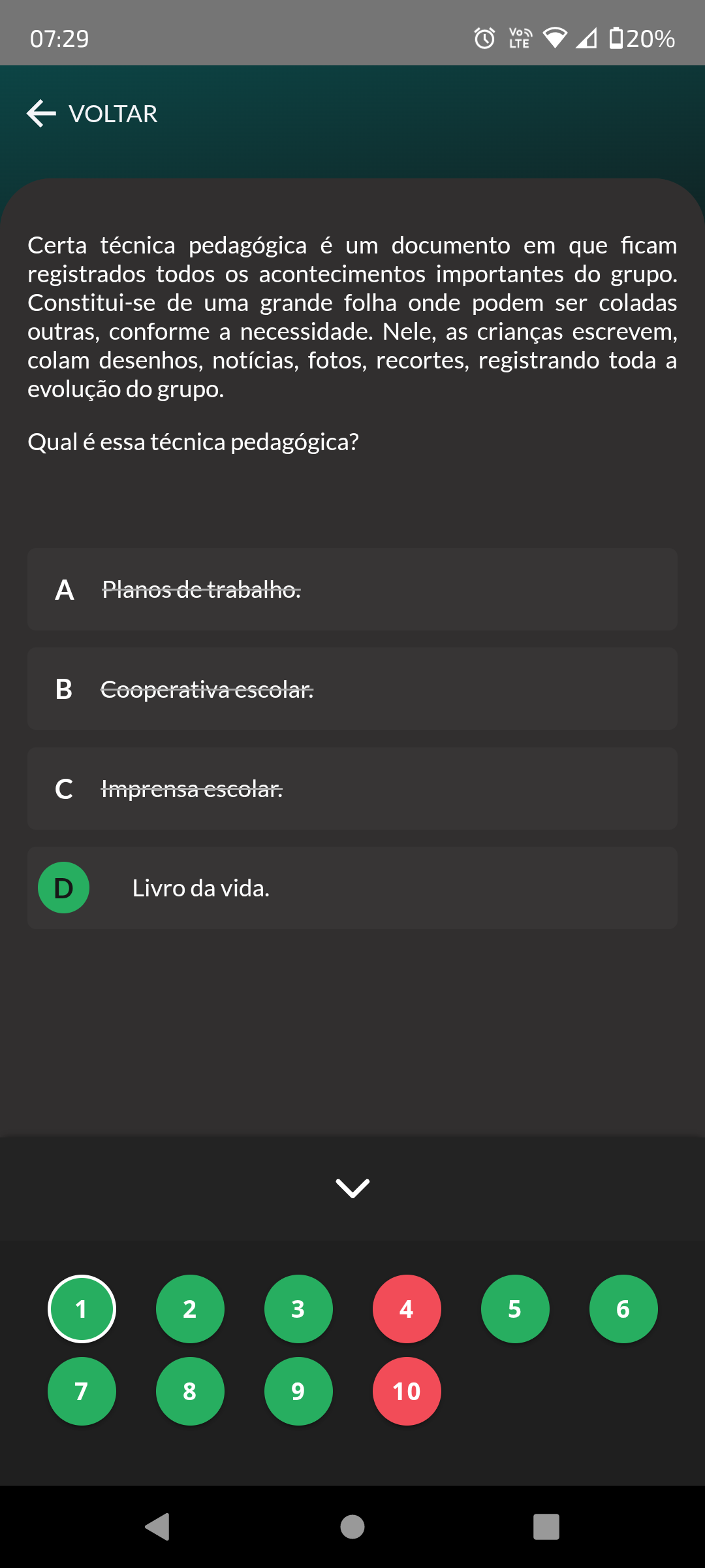 07:29 LTE 20% VOLTAR Certa técnica pedagógica é um documento em que ficam registrados todos os acontecimentos importantes do grupo. Constitui-se de uma grande folha onde podem ser coladas outras, conforme a necessidade. Nele, as crianças escrevem, colam desenhos, notícias, fotos, recortes, registrando toda a evolução do grupo. Qual é essa técnica pedagógica? A Planos de trabalho. Cooperativa escolar. c Imprensa escolar. D Livro da vida. 1 2 3 4 5 6 7 8 9 10