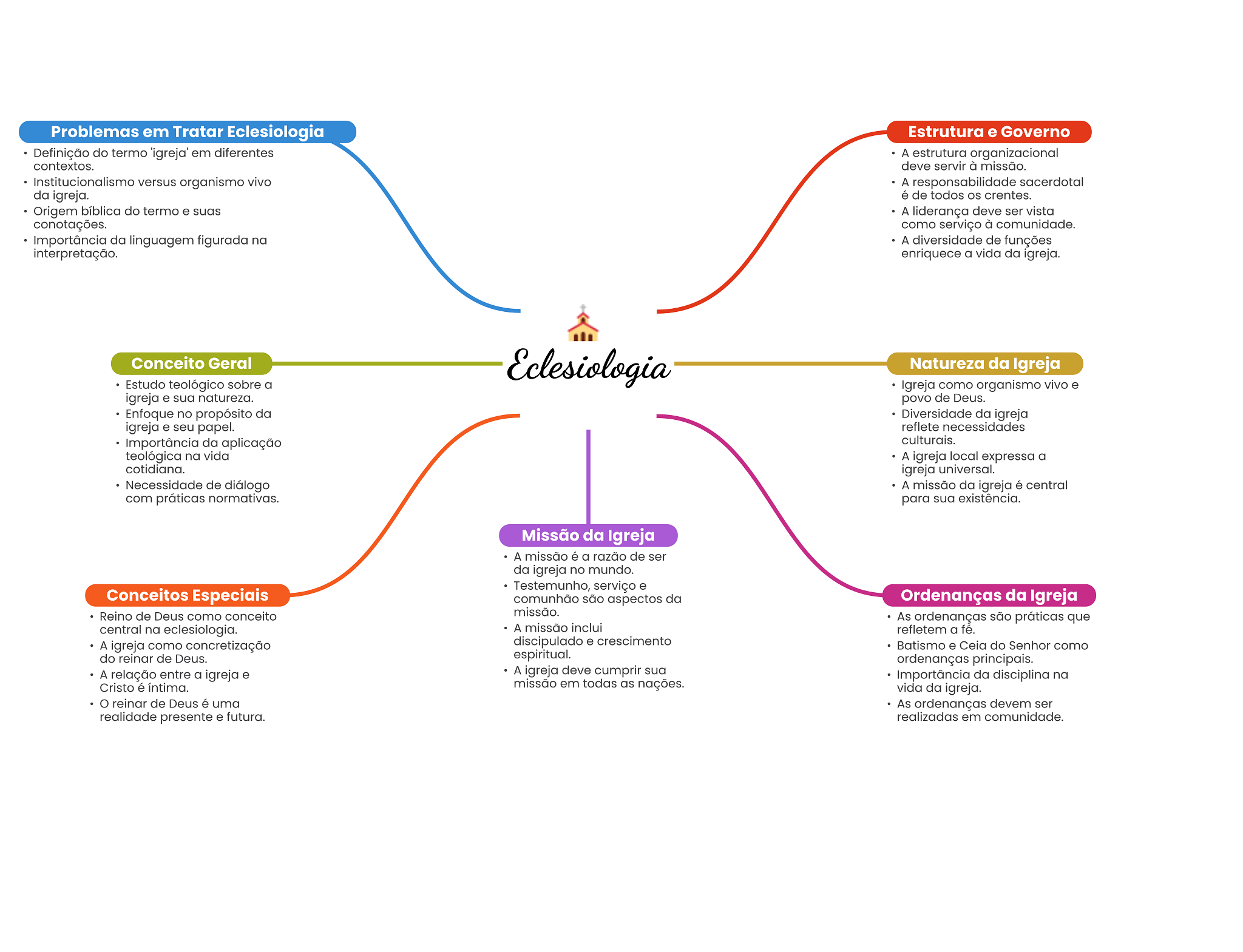 Problemas em Tratar Eclesiologia Estrutura e Governo Definição do termo em diferentes A estrutura organizacional contextos. deve servir à missão. Institucionalismo versus organismo vivo A responsabilidade sacerdotal da igreja. é de todos os crentes. Origem bíblica do termo e suas A liderança deve ser vista conotações. como serviço à comunidade. Importância da linguagem figurada na A diversidade de funções interpretação. enriquece a vida da igreja. Conceito Geral Eclesiologia Natureza da Igreja Estudo teológico sobre a Igreja como organismo vivo e igreja e sua natureza. povo de Deus. Enfoque no propósito da Diversidade da igreja igreja e seu papel. reflete necessidades Importância da aplicação culturais. teológica na vida A igreja local expressa a cotidiana. igreja universal. Necessidade de diálogo A missão da igreja é central com práticas normativas. para sua existência. Missão da Igreja A missão é a razão de ser da igreja no mundo. Testemunho, serviço e Conceitos Especiais comunhão são aspectos da Ordenanças da Igreja Reino de Deus como conceito missão. As ordenanças são práticas que central na eclesiologia. A missão inclui refletem a fé. A igreja como concretização discipulado e crescimento Batismo e Ceia do Senhor como do reinar de Deus. espiritual. ordenanças principais. A relação entre a igreja e A igreja deve cumprir sua Importância da disciplina na Cristo é íntima. missão em todas as nações. vida da igreja. reinar de Deus é uma As ordenanças devem ser realidade presente e futura. realizadas em comunidade.