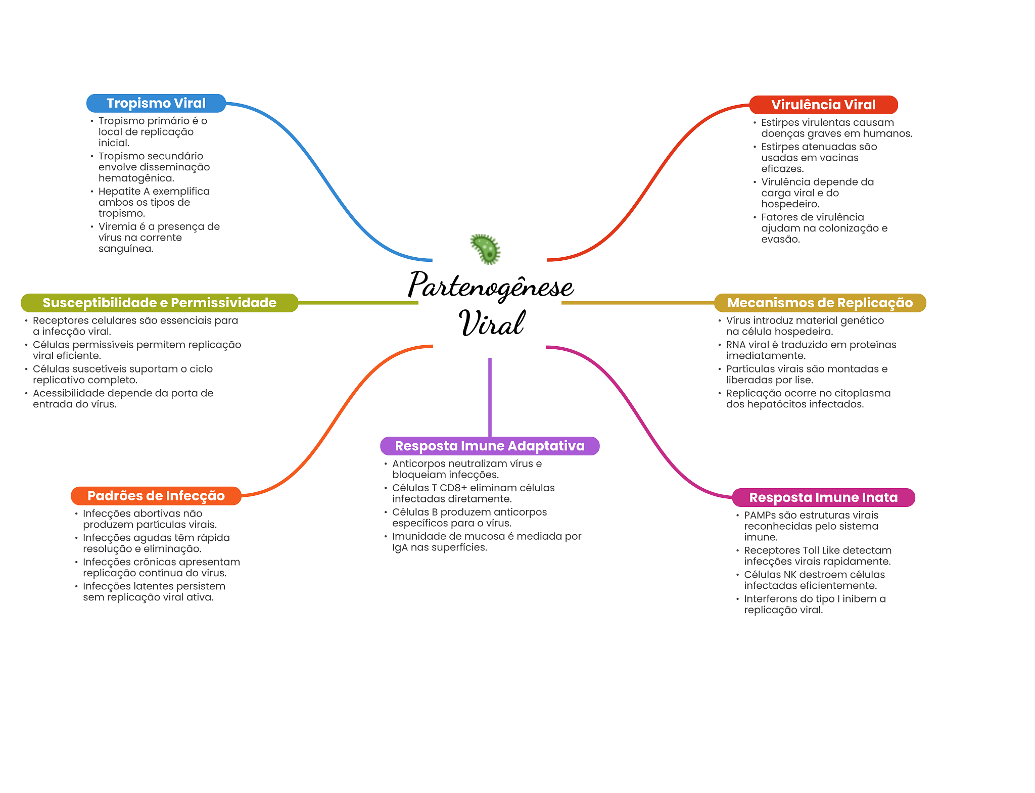 Tropismo Viral Virulência Viral Tropismo primário é Estirpes virulentas causam local de replicação doenças graves em humanos. inicial. Estirpes atenuadas são Tropismo secundário usadas em vacinas envolve disseminação eficazes. hematogênica. Virulência depende da Hepatite A exemplifica carga viral e do ambos tipos de hospedeiro. tropismo. Fatores de virulência Viremia é a presença de ajudam na colonização e vírus na corrente evasão. sanguínea. Partenogênese Susceptibilidade e Permissividade Mecanismos de Replicação Receptores celulares são essenciais para Viral Vírus introduz material genético a infecção viral. na célula hospedeira. Células permissíveis permitem replicação RNA viral é traduzido em proteínas viral eficiente. imediatamente. Células suscetíveis suportam ciclo Partículas virais são montadas e replicativo completo. liberadas por lise. Acessibilidade depende da porta de Replicação ocorre no citoplasma entrada do vírus. dos hepatócitos infectados. Resposta Imune Adaptativa Anticorpos neutralizam vírus e bloqueiam infecções. Células T CD8+ eliminam células Padrões de Infecção infectadas diretamente. Resposta Imune Inata Infecções abortivas não Células B produzem anticorpos PAMPs são estruturas virais produzem partículas virais. específicos para vírus. reconhecidas pelo sistema Infecções agudas têm rápida Imunidade de mucosa é mediada por imune. resolução e eliminação. IgA nas superfícies. Receptores Toll Like detectam Infecções crônicas apresentam infecções virais rapidamente. replicação contínua do vírus. Células NK destroem células Infecções latentes persistem infectadas eficientemente. sem replicação viral ativa. Interferons do tipo inibem a replicação viral.