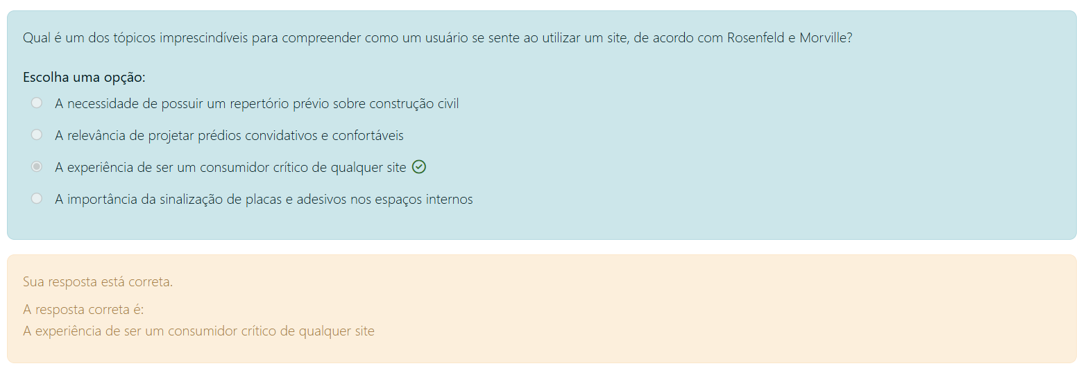 Qual é um dos tópicos para compreender como um usuário se sente ao utilizar um site, de acordo com Rosenfeld e Morville? Escolha uma opção: A necessidade de possuir um repertório prévio sobre construção civil A relevância de projetar prédios convidativos e confortáveis A experiência de ser um consumidor crítico de qualquer site A importância da sinalização de placas e adesivos nos espaços internos Sua resposta está correta. A resposta correta é: A experiência de ser um consumidor crítico de qualquer site