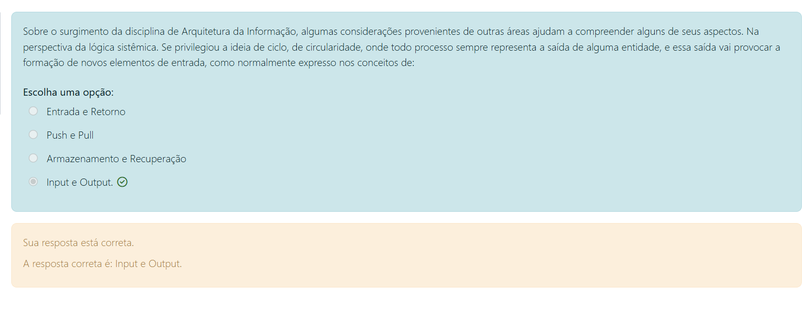 Sobre O surgimento da disciplina de Arquitetura da Informação, algumas considerações provenientes de outras áreas ajudam a compreender alguns de seus aspectos. Na perspectiva da lógica sistêmica. Se privilegiou a ideia de ciclo, de circularidade, onde todo processo sempre representa a saída de alguma entidade, e essa saída vai provocar a formação de novos elementos de entrada, como normalmente expresso nos conceitos de: Escolha uma opção: Entrada e Retorno Push e Pull Armazenamento e Recuperação Input e Output. Sua resposta está correta. A resposta correta é: Input e Output.