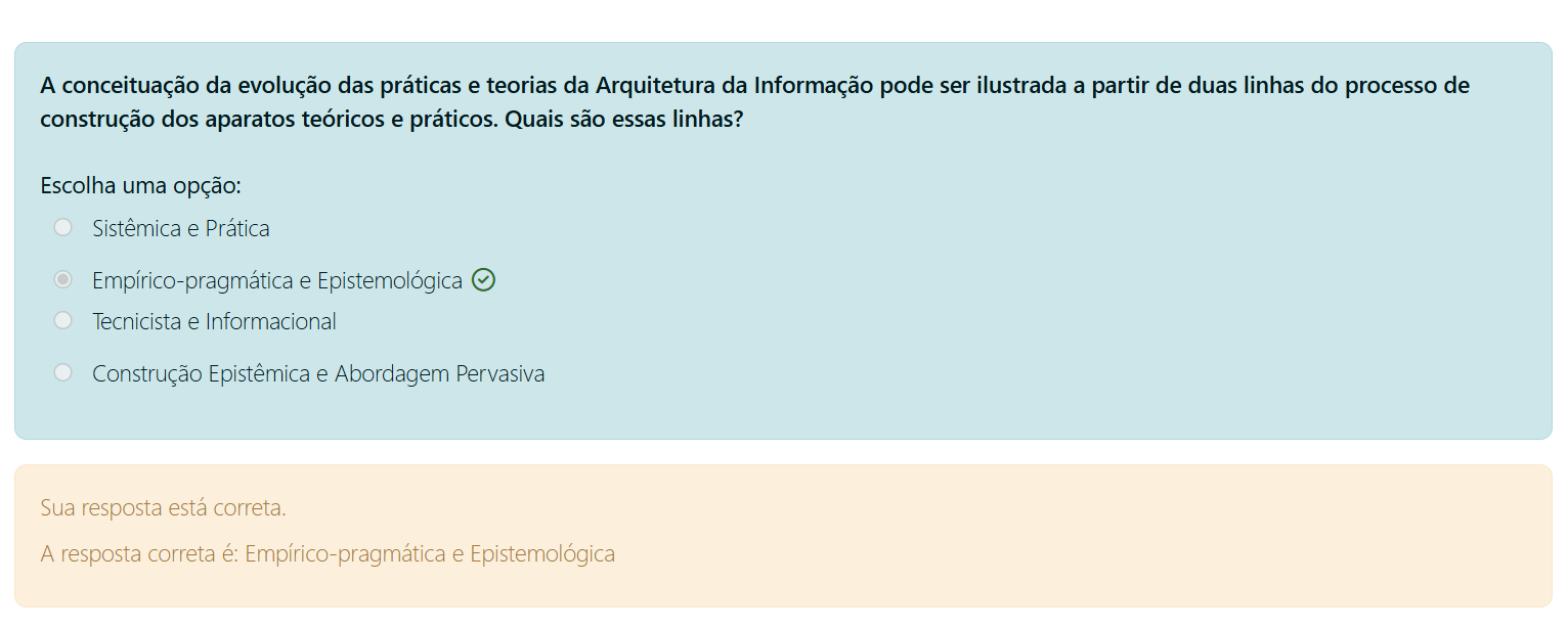 A conceituação da evolução das práticas e teorias da Arquitetura da Informação pode ser ilustrada a partir de duas linhas do processo de construção dos aparatos teóricos e práticos. Quais são essas linhas? Escolha uma opção: Sistêmica e Prática Empírico-pragmática e Epistemológica Tecnicista e Informacional Construção Epistêmica e Abordagem Pervasiva Sua resposta está correta. A resposta correta é: Empírico-pragmática e Epistemológica