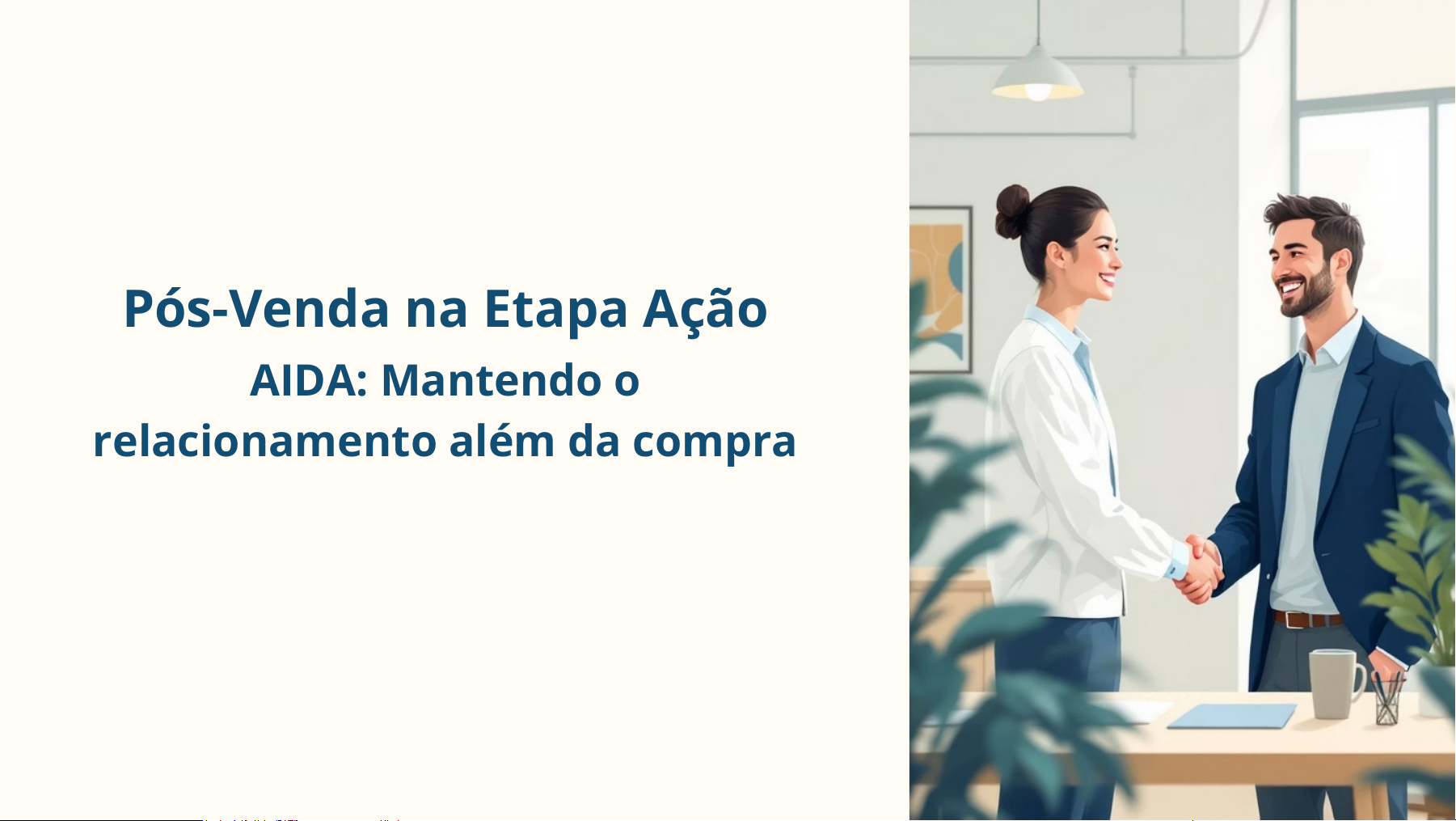 Pós-Venda na Etapa Ação AIDA: Mantendo o relacionamento além da compra A Etapa Ação: O Cliente Já Comprou Na etapa Ação da teoria AIDA, o cliente já realizou a compra e passa a gerar receita para a empresa. Este é o momento em que a transação se concretiza e os produtos ou serviços são entregues. Porém, o relacionamento com o cliente não termina nesse momento. Pelo contrário, é aqui que começa uma nova fase crucial para o sucesso a longo prazo do negócio. Por Que o Pós-Venda É Essencial? Manter Contato Continuar engajando o cliente após a compra para fortalecer a conexão Garantir Satisfação Assegurar que o cliente esteja contente com a experiência de compra Novas Compras Aumentar significativamente as chances de recompra e fidelização Agradecimento e Suporte Imediato Suporte Disponível Mensagem de Agradecimento Envie uma mensagem personalizada reconhecendo a confiança do cliente na sua empresa. Este simples gesto cria uma primeira impressão positiva pós-compra. impressão positivapós-compra. Disponibilize canais deatendimento para tirar dúvidas ou resolver possíveis problemas que possam surgir após a compra. Feedback e Ofertas Exclusivas Solicitar Opinião Benefícios Exclusivos Peçaao clienteque compartilhe sua experiência com o produto ou serviço. Sua opinião é valiosa para melhorias contínuas. Ofereça promoções especiais, descontos ou programas de fidelidade para recompensar a compra e incentivar a próxima. Fidelização: O Objetivo Final Cliente Fidelizado Indicações Naturais Relacionamento Fortalecido Conexões sólidas com os clientes através do atendimento excepcional Compradores que retornam e confiam consistentemente na marca Novas compras e indicações espontâneas para amigos e familiares Resumo: Etapa Ação do AIDA Ações de Pós-Venda Agradecimento, suporte, feedback e ofertas exclusivas fortalecem o relacionamento Cliente Realizou a Compra A etapa Ação é quando o cliente converte e gera receita para a empresa Fidelização Estas ações aumentam as chances de novas compras e indicações espontâneas Relacionamento Continua O pós-venda mantém o contato e garante satisfação após a transação