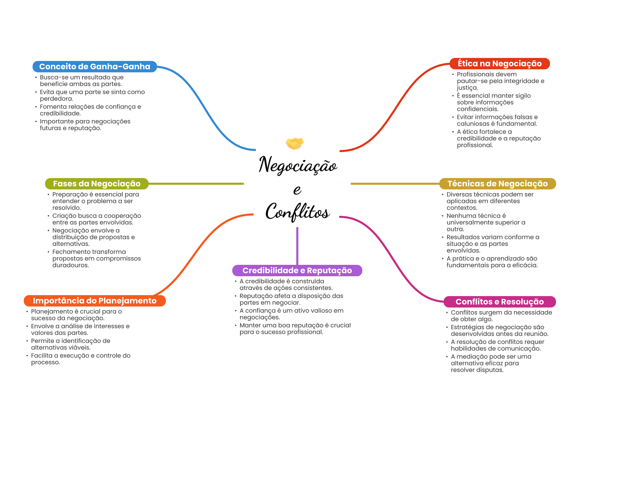 Conceito de Ganha-Ganha Ética na Negociação Profissionais devem Busca-se um resultado que beneficie ambas as partes. pautar-se pela integridade e justiça. Evita que uma parte se sinta como perdedora. É essencial manter sigilo sobre informações Fomenta relações de confiança e confidenciais. credibilidade. Evitar informações falsas e Importante para negociações caluniosas é fundamental. futuras e reputação. A ética fortalece a credibilidade e a reputação profissional. Negociação Fases da Negociação Técnicas de Negociação Preparação é essencial para e Diversas técnicas podem ser entender problema a ser aplicadas em diferentes resolvido. Conflitos contextos. Criação busca a cooperação Nenhuma técnica é entre as partes envolvidas. universalmente superior a Negociação envolve a outra. distribuição de propostas e Resultados variam conforme a alternativas. situação e as partes Fechamento transforma envolvidas. propostas em compromissos A prática e aprendizado são duradouros. fundamentais para a eficácia. Credibilidade e Reputação A credibilidade é construída através de ações consistentes. Reputação afeta a disposição das Importância do Planejamento partes em negociar. Conflitos e Resolução Planejamento é crucial para A confiança é um ativo valioso em Conflitos surgem da necessidade sucesso da negociação. negociações. de obter algo. Envolve a análise de interesses e Manter uma boa reputação é crucial Estratégias de negociação são valores das partes. para sucesso profissional. desenvolvidas antes da reunião. Permite a identificação de A resolução de conflitos requer alternativas viáveis. habilidades de comunicação. Facilita a execução e controle do A mediação pode ser uma processo. alternativa eficaz para resolver disputas.