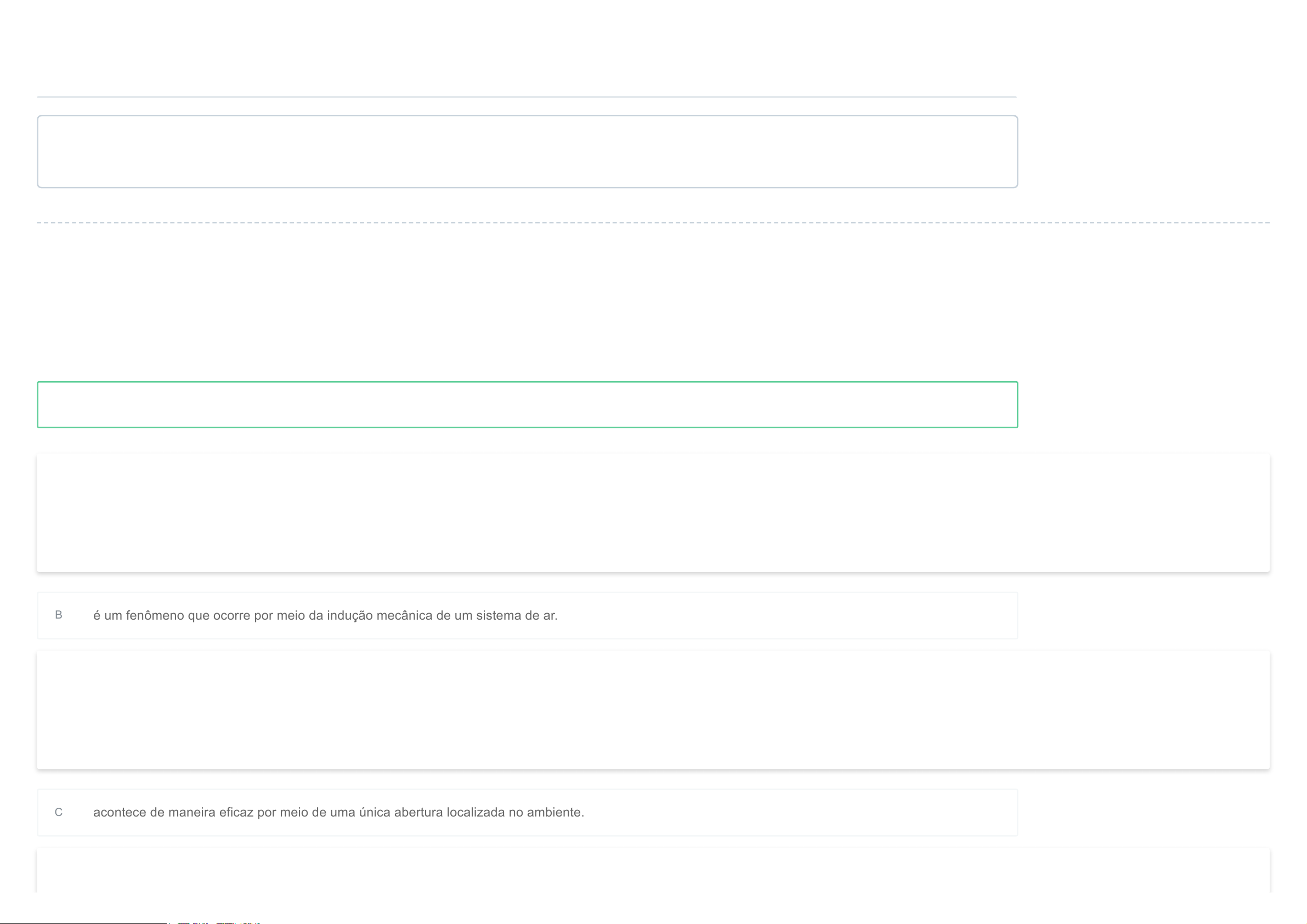 Exercícios Envio: 27/02/2026 - 09:35 Tentativa: 1 de 2 Acertos: 5/5 Questão 1 2/2 Selecione a resposta: A é um fenômeno que ocorre nos ambientes por meio da diferença da pressão de ar. Você acertou! Comentários da resposta A ventilação é um fenômeno que se refere à movimentação do ar sem a indução de um sistema mecânico, que ocorre por meio da diferença da pressão de ar. Essa diferença pode acontecer pela densidade do ar, a qual muda conforme a diferença da temperatura. Para que isso ocorra dentro de uma edificação e dos ambientes internos, é necessário que em cada espaço contenha aberturas, a fim de que o ar consiga fluir no local. A ventilação natural de um espaço interno só ocorre se houver abertura e diferença de pressão. Comentários da resposta A ventilação é um fenômeno que se refere à movimentação do ar sem a indução de um sistema mecânico, que ocorre por meio da diferença da pressão de ar. Essa diferença pode acontecer pela densidade do ar, a qual muda conforme a diferença da temperatura. Para que isso ocorra dentro de uma edificação e dos ambientes internos, é necessário que em cada espaço contenha aberturas, a fim de que o ar consiga fluir no local. A ventilação natural de um espaço interno só ocorre se houver abertura e diferença de pressão. Comentários da resposta Um condicionante no momento da realização de um projeto de interiores é a chamada ventilação natural, que está relacionado aos ventos dominantes no local. Sobre a ventilação natural, é correto afirmar que: B é um fenômeno que ocorre por meio da indução mecânica de um sistema de ar. C acontece de maneira eficaz por meio de uma única abertura localizada no ambiente. Detalhes da atividade Tentativas: 2 Tentativa válida: Maior nota Vale: 10 27/02/26, 09:36 :: Plataforma A https://eniac-edu.grupoa.education/plataforma/course/4214303/content/63200023 1/8 A ventilação é um fenômeno que se refere à movimentação do ar sem a indução de um sistema mecânico, que ocorre por meio da diferença da pressão de ar. Essa diferença pode acontecer pela densidade do ar, a qual muda conforme a diferença da temperatura. Para que isso ocorra dentro de uma edificação e dos ambientes internos, é necessário que em cada espaço contenha aberturas, a fim de que o ar consiga fluir no local. A ventilação natural de um espaço interno só ocorre se houver abertura e diferença de pressão. Comentários da resposta A ventilação é um fenômeno que se refere à movimentação do ar sem a indução de um sistema mecânico, que ocorre por meio da diferença da pressão de ar. Essa diferença pode acontecer pela densidade do ar, a qual muda conforme a diferença da temperatura. Para que isso ocorra dentro de uma edificação e dos ambientes internos, é necessário que em cada espaço contenha aberturas, a fim de que o ar consiga fluir no local. A ventilação natural de um espaço interno só ocorre se houver abertura e diferença de pressão. Comentários da resposta A ventilação é um fenômeno que se refere à movimentação do ar sem a indução de um sistema mecânico, que ocorre por meio da diferença da pressão de ar. Essa diferença pode acontecer pela densidade do ar, a qual muda conforme a diferença da temperatura. Para que isso ocorra dentro de uma edificação e dos ambientes internos, é necessário que em cada espaço contenha aberturas, a fim de que o ar consiga fluir no local. A ventilação natural de um espaço interno só ocorre se houver abertura e diferença de pressão. D é um fenômeno que ocorre por meio de pressões de ar iguais dentro do ambiente. E acontece da mesma maneira em ambientes e espaços com uma ou mais aberturas. Questão 2 2/2 Selecione a resposta: Comentários da resposta A ventilação natural é utilizada para qualificar as edificações, pois apresenta alguns benefícios para os projetos de interiores. Sobre esses benefícios, analise as assertivas a seguir: I. Colabora para a estagnação do ar do ambiente, tornando o espaço confortável termicamente. II. Colabora para a salubridade do espaço, evitando a proliferação de doenças. III. É um elemento que sua utilização é diretamente proporcional ao consumo de energia elétrica. Quais afirmativas estão corretas? A Apenas a afirmativa I está correta. 27/02/26, 09:36 :: Plataforma A https://eniac-edu.grupoa.education/plataforma/course/4214303/content/63200023 2/8 A ventilação natural apresenta diversos benefícios para os ambientes e seus usuários, são eles: torna o ambiente confortável termicamente, pois favorece às trocas de ar, evitando o ar estagnado; as trocas de ar colaboram para a salubridade do espaço, evitando o acúmulo de bactérias e a proliferação de doenças; quanto mais ventilação natural em um ambiente, menor a necessidade de utilizar condicionadores de ar mecânicos, ou seja, o uso da ventilação natural é inversamente proporcional ao consumo de energia elétrica. B Apenas a afirmativa II está correta. Você acertou! Comentários da resposta A ventilação natural apresenta diversos benefícios para os ambientes e seus usuários, são eles: torna o ambiente confortável termicamente, pois favorece às trocas de ar, evitando o ar estagnado; as trocas de ar colaboram para a salubridade do espaço, evitando o acúmulo de bactérias e a proliferação de doenças; quanto mais ventilação natural em um ambiente, menor a necessidade de utilizar condicionadores de ar mecânicos, ou seja, o uso da ventilação natural é inversamente proporcional ao consumo de energia elétrica. Comentários da resposta A ventilação natural apresenta diversos benefícios para os ambientes e seus usuários, são eles: torna o ambiente confortável termicamente, pois favorece às trocas de ar, evitando o ar estagnado; as trocas de ar colaboram para a salubridade do espaço, evitando o acúmulo de bactérias e a proliferação de doenças; quanto m
