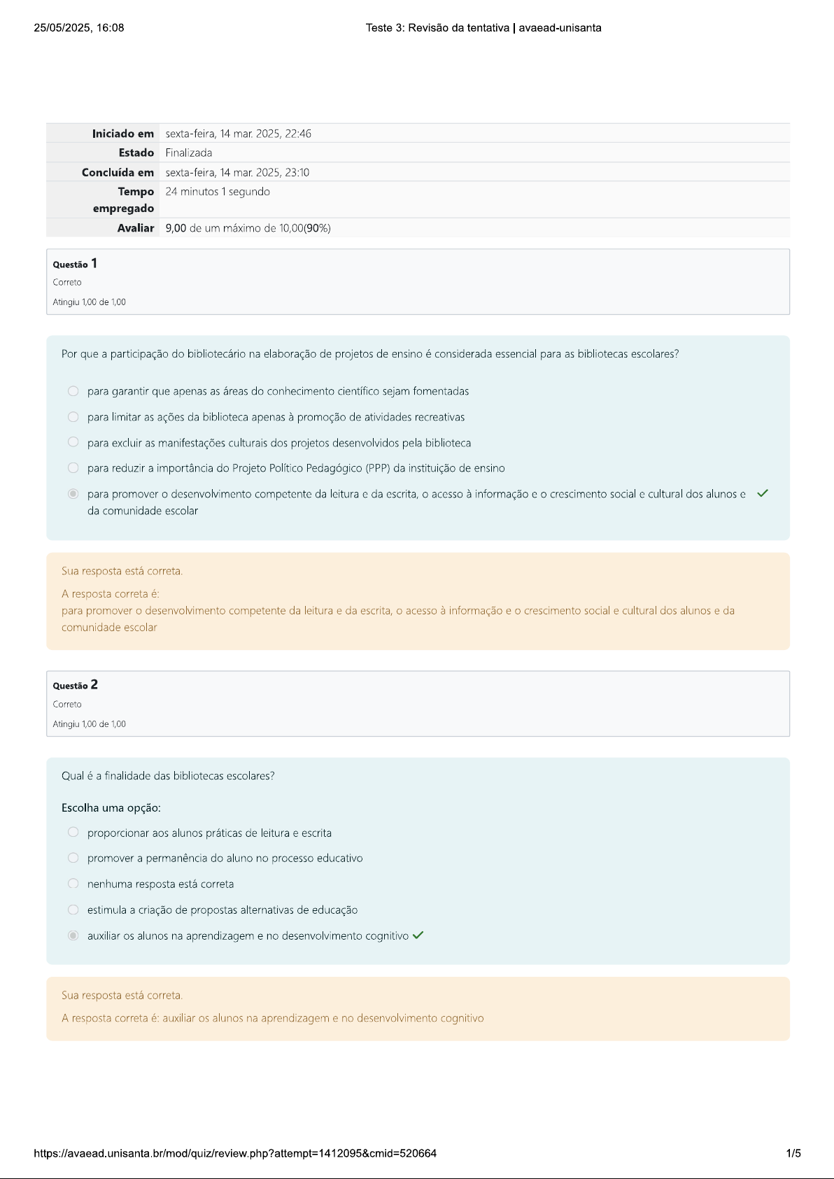 25/05/2025, 16:08 Teste 3: Revisão da tentativa avaead-unisanta Iniciado em sexta-feira, 14 mar. 2025, 22:46 Estado Finalizada Concluída em sexta-feira, 14 mar. 2025, 23:10 Tempo 24 minutos 1 segundo empregado Avaliar 9,00 de um máximo de 10,00(90%) Questão 1 Correto Atingiu 1,00 de 1,00 Por que a participação do bibliotecário na elaboração de projetos de ensino é considerada essencial para as bibliotecas escolares? para garantir que apenas as áreas do conhecimento científico sejam fomentadas para limitar as ações da biblioteca apenas à promoção de atividades recreativas para excluir as manifestações culturais dos projetos desenvolvidos pela biblioteca para reduzir a importância do Projeto Político Pedagógico (PPP) da instituição de ensino para promover desenvolvimento competente da leitura e da escrita, acesso à informação e crescimento social e cultural dos alunos e da comunidade escolar Sua resposta está correta. A resposta correta é: para promover desenvolvimento competente da leitura e da escrita, acesso à informação e crescimento social e cultural dos alunos e da comunidade escolar Questão 2 Correto Atingiu 1,00 de 1,00 Qual é a finalidade das bibliotecas escolares? Escolha uma opção: proporcionar aos alunos práticas de leitura e escrita promover a permanência do aluno no processo educativo nenhuma resposta está correta estimula a criação de propostas alternativas de educação auxiliar os alunos na aprendizagem e no desenvolvimento cognitivo Sua resposta está correta. A resposta correta é: auxiliar alunos na aprendizagem e no desenvolvimento cognitivo 1/525/05/2025, 16:08 Teste 3: Revisão da tentativa avaead-unisanta Questão 3 Correto Atingiu 1,00 de 1,00 Como devem ser constituídas as coleções e serviços da biblioteca pública? Escolha uma opção: devem ser por indicação política pois a biblioteca é pública e financiada pelo estado devem ser isentos de censura ideológica, política ou religiosa mas é necessário atender às pressões comerciais que financiam projetos públicos nenhuma resposta está correta deve haver seleção dos materiais de modo a atender os interesses da sociedade devem ser isentos de qualquer forma de censura ideológica, política ou religiosa e de pressões comerciais Sua resposta está correta. A resposta correta é: devem ser isentos de qualquer forma de censura ideológica, política ou religiosa e de pressões comerciais Questão 4 Correto Atingiu 1,00 de 1,00 Lanzi (2012) indica que os alunos devem ir ao menos uma vez por semana à biblioteca, por que? Escolha uma opção: para desenvolver um sentimento de pertencimento por parte do aluno todas as respostas estão corretas para viabilizar condições e desenvolver no aluno espírito de participação no cotidiano da biblioteca para motivar uma frequência espontânea e produtiva no uso do potencial e dos espaços da biblioteca para permitir sua adesão ao universo literário e de pesquisa Sua resposta está correta. A resposta correta é: todas as respostas estão corretas 2/525/05/2025, 16:08 Teste 3: Revisão da tentativa avaead-unisanta Questão 5 Correto Atingiu 1,00 de 1,00 De acordo com a Lei de Diretrizes e Bases da Educação Nacional (LDB), n° 9.394/96, como as bibliotecas escolares estão inseridas nas escolas? como parte integrante do processo educativo, promovendo a qualidade educacional, acesso e permanência do aluno, e a vinculação da educação com trabalho e práticas sociais como ambientes exclusivos para bibliotecários desenvolverem suas atividades como locais de armazenamento de materiais didáticos apenas como espaços de lazer para os alunos como centros de pesquisa disponíveis apenas para os professores Sua resposta está correta. A resposta correta é: como parte integrante do processo educativo, promovendo a qualidade educacional, acesso e permanência do aluno, vinculação da educação com trabalho e práticas sociais Questão 6 Correto Atingiu 1,00 de 1,00 Por que Edmir Perroti (apud Lanzi, 2012) considera que aluno deve ser autor (produzir documentos) para se sentir parte da biblioteca? Escolha uma opção: porque a biblioteca fica mais rica com assuntos de interesse individual nenhuma resposta está correta porque esse conhecimento pode ser divulgado nas redes sociais porque quando um estudante tem sua criação incorporada ao acervo, ele se vê como produtor de cultura porque acervo é um conjunto de documentos, mas não de significados Sua resposta está correta. A resposta correta é: porque quando um estudante tem sua criação incorporada ao acervo, ele se vê como produtor de cultura 3/525/05/2025, 16:08 Teste 3: Revisão da tentativa avaead-unisanta Questão 7 Incorreto Atingiu 0,00 de 1,00 Qual é objetivo da Competência em Informação nas bibliotecas universitárias? Escolha uma opção: é aprender a aprender e conhecer como está estruturado conhecimento é desenvolver habilidades para acesso ao universo informacional é saber localizar, avaliar e usar a informação de maneira ética todas as respostas estão corretas é converter usuários da biblioteca em usuários da informação tornando-os aprendizes independentes Sua resposta está incorreta. A resposta correta é: todas as respostas estão corretas Questão 8 Correto Atingiu 1,00 de 1,00 Quais são os temas que podem ser trabalhados nos programas de Competência em Informação em bibliotecas universitárias? Escolha uma opção: nenhuma resposta está correta questões quanto ao acesso, avaliação da informação, saber utilizar a informação bem como seu uso ético questões quanto à necessidade informacional, acesso e uso da informação, bem como seu uso ético questões quanto à necessidade informacional, acesso, avaliação da informação, saber utilizar a informação bem como seu uso ético questões quanto à necessidade informacional, avaliação da informação, saber utilizar a informação bem como seu uso ético Sua res