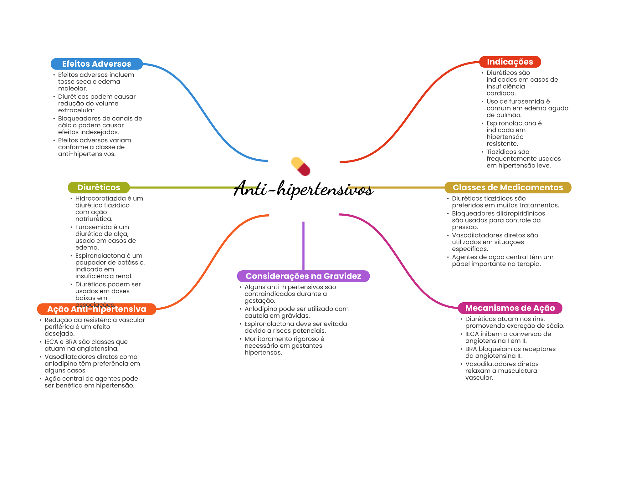 Efeitos Adversos Indicações Efeitos adversos incluem Diuréticos são tosse seca e edema indicados em casos de maleolar. insuficiência cardíaca. Diuréticos podem causar redução do volume Uso de furosemida é extracelular. comum em edema agudo Bloqueadores de canais de de pulmão. cálcio podem causar Espironolactona é efeitos indesejados. indicada em Efeitos adversos variam hipertensão resistente. conforme a classe de anti-hipertensivos. Tiazídicos são frequentemente usados em hipertensão leve. Diuréticos Anti-hipertensivos Classes de Medicamentos Hidrocorotiazida é um Diuréticos tiazídicos são diurético tiazídico preferidos em muitos tratamentos. com ação Bloqueadores diidropiridínicos natriurética. são usados para controle da Furosemida é um pressão. diurético de alça, Vasodilatadores diretos são usado em casos de utilizados em situações edema. específicas. Espironolactona é um Agentes de ação central têm um poupador de potássio, papel importante na terapia. indicado em insuficiência renal. Considerações na Gravidez Diuréticos podem ser Alguns anti-hipertensivos são usados em doses contraindicados durante a baixas em gestação. Ação Anti-hipertensiva Anlodipino pode ser utilizado com Mecanismos de Ação cautela em grávidas. Redução da resistência vascular Diuréticos atuam nos rins, periférica é um efeito Espironolactona deve ser evitada promovendo excreção de sódio. desejado. devido a riscos potenciais. IECA inibem a conversão de IECA e BRA são classes que Monitoramento rigoroso é angiotensina em II. atuam na angiotensina. necessário em gestantes hipertensas. BRA bloqueiam receptores Vasodilatadores diretos como da angiotensina II. anlodipino têm preferência em Vasodilatadores diretos alguns casos. relaxam a musculatura Ação central de agentes pode vascular. ser benéfica em hipertensão.