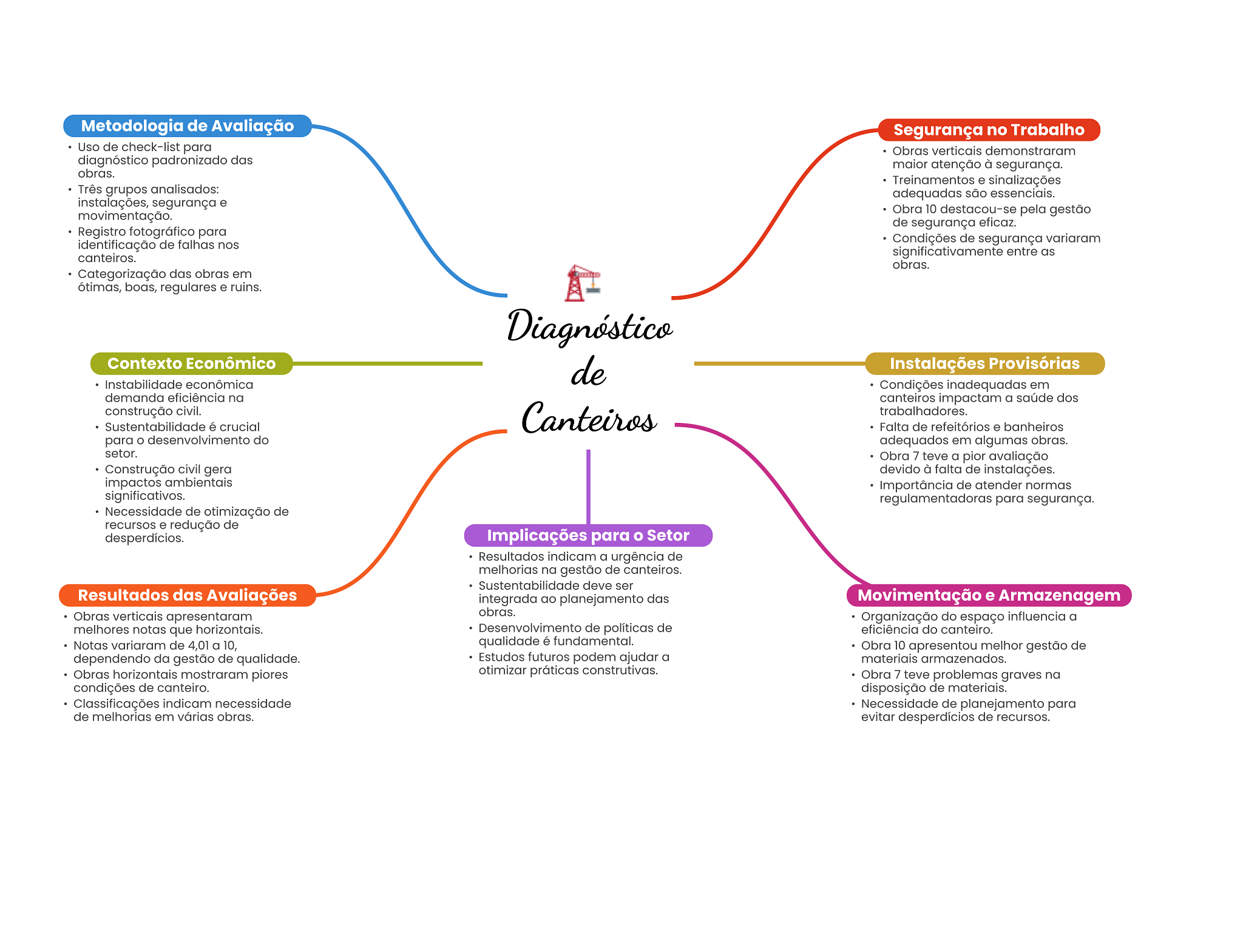 Metodologia de Avaliação Segurança no Trabalho Uso de check-list para Obras verticais demonstraram diagnóstico padronizado das maior atenção à segurança. obras. Treinamentos e sinalizações Três grupos analisados: adequadas são essenciais. instalações, segurança e movimentação. Obra 10 destacou-se pela gestão de segurança eficaz. Registro fotográfico para identificação de falhas nos Condições de segurança variaram canteiros. significativamente entre as obras. Categorização das obras em ótimas, boas, regulares e ruins. Diagnóstico Contexto Econômico de Instalações Provisórias Instabilidade econômica Condições inadequadas em demanda eficiência na canteiros impactam a saúde dos construção civil. Sustentabilidade é crucial Canteiros trabalhadores. Falta de refeitórios e banheiros para desenvolvimento do adequados em algumas obras. setor. Obra 7 teve a pior avaliação Construção civil gera devido à falta de instalações. impactos ambientais Importância de atender normas significativos. regulamentadoras para segurança. Necessidade de otimização de recursos e redução de desperdícios. Implicações para Setor Resultados indicam a urgência de melhorias na gestão de canteiros. Sustentabilidade deve ser Resultados das Avaliações integrada ao planejamento das Movimentação e Armazenagem Obras verticais apresentaram obras. Organização do espaço influencia a melhores notas que horizontais. Desenvolvimento de políticas de eficiência do canteiro. Notas variaram de 4,01 a 10, qualidade é fundamental. Obra 10 apresentou melhor gestão de dependendo da gestão de qualidade. Estudos futuros podem ajudar a materiais armazenados. Obras horizontais mostraram piores otimizar práticas construtivas. Obra 7 teve problemas graves na condições de canteiro. disposição de materiais. Classificações indicam necessidade Necessidade de planejamento para de melhorias em várias obras. evitar desperdícios de recursos.
