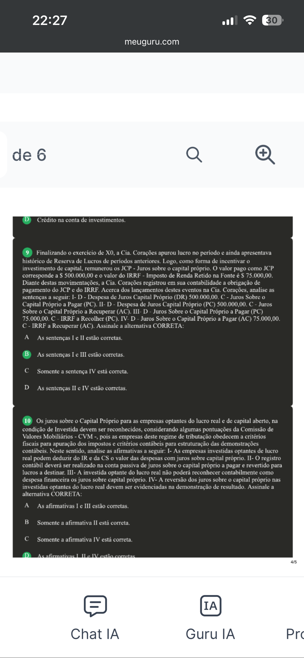 22:27 30 meuguru.com de 6 + Crédito na conta de investimentos. 9 Finalizando o exercício de X0, a Cia. Corações apurou lucro no período e ainda apresentava histórico de Reserva de Lucros de períodos anteriores. Logo, como forma de incentivar o investimento de capital, remunerou os JCP Juros sobre o capital próprio. valor pago como JCP corresponde a $ 500.000,00 e o valor do IRRF Imposto de Renda Retido na Fonte é $ 75.000,00. Diante destas movimentações, a Cia. Corações registrou em sua contabilidade a obrigação de pagamento do JCP e do IRRF. Acerca dos lançamentos destes eventos na Cia. Corações, analise as sentenças a seguir: I-D Despesa de Juros Capital Próprio (DR) 500.000,00. Juros Sobre o Capital Próprio a Pagar (PC). II- D Despesa de Juros Capital Próprio (PC) 500.000,00. C Juros Sobre o Capital Próprio a Recuperar (AC). III- D Juros Sobre o Capital Próprio a Pagar (PC) 75.000,00. C IRRF a Recolher (PC). IV- D Juros Sobre o Capital Próprio a Pagar (AC) 75.000,00. C IRRF a Recuperar (AC). Assinale a alternativa CORRETA: A As sentenças I e II estão corretas. As sentenças I e III estão corretas. C Somente a sentença IV está correta. D As sentenças II e IV estão corretas. 10 Os juros sobre o Capital Próprio para as empresas optantes do lucro real e de capital aberto, na condição de Investida devem ser reconhecidos, considerando algumas pontuações da Comissão de Valores Mobiliários CVM -, pois as empresas deste regime de tributação obedecem a critérios fiscais para apuração dos impostos e critérios contábeis para estruturação das demonstrações contábeis. Neste sentido, analise as afirmativas a seguir: I- As empresas investidas optantes de lucro real podem deduzir do IR e da CS valor das despesas com juros sobre capital próprio. II- o registro contábil deverá ser realizado na conta passiva de juros sobre capital próprio a pagar e revertido para lucros a destinar. III- A investida optante do lucro real não poderá reconhecer contabilmente como despesa financeira os juros sobre capital próprio. IV- A reversão dos juros sobre o capital próprio nas investidas optantes do lucro real devem ser evidenciadas na demonstração de resultado. Assinale a alternativa CORRETA: A As afirmativas I e III estão corretas. Somente a afirmativa II está correta. C Somente a afirmativa IV está correta. 4/5 IA Chat IA Guru IA
