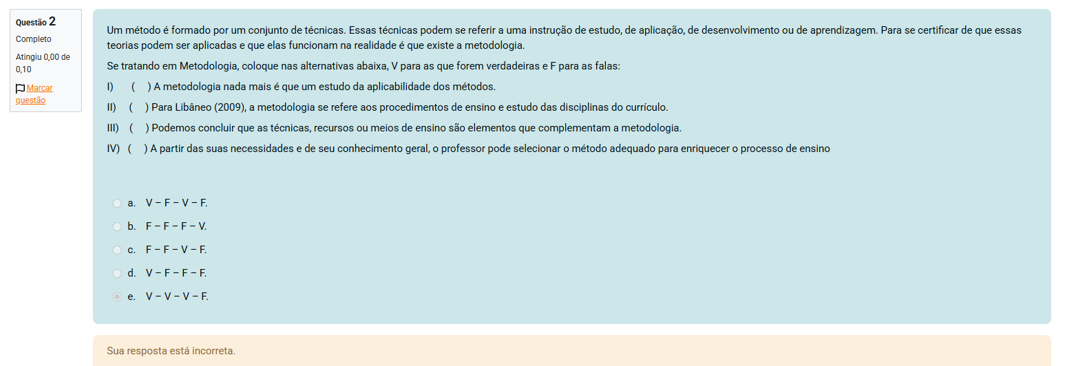 Questão 2 Um método é formado por um conjunto de técnicas. Essas técnicas podem se referir a uma instrução de estudo, de aplicação, de desenvolvimento ou de aprendizagem. Para se certificar de que essas Completo teorias podem ser aplicadas e que elas funcionam na realidade é que existe a metodologia. Atingiu 0,00 de 0,10 Se tratando em Metodologia, coloque nas alternativas abaixa, V para as que forem verdadeiras e F para as falas: Marcar I) ( ) A metodologia nada mais é que um estudo da aplicabilidade dos métodos. II) Para Libâneo (2009), a metodologia se refere aos procedimentos de ensino e estudo das disciplinas do currículo. III) Podemos concluir que as técnicas, recursos ou meios de ensino são elementos que complementam a metodologia. IV) A partir das suas necessidades e de seu conhecimento geral, O professor pode selecionar O método adequado para enriquecer O processo de ensino a. b. F-F-F-V. C. d. V-F-F-F. e. Sua resposta está incorreta.