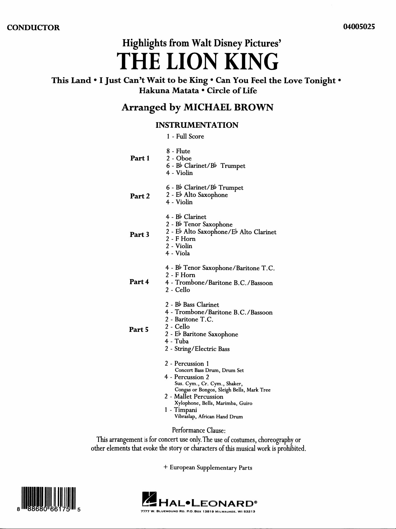 CONDUCTOR 04005025 Highlights from Walt Disney Pictures' THE LION KING This Land I Just Can't Wait to be King Can You Feel the Love Tonight Hakuna Matata Circle of Life Arranged by MICHAEL BROWN INSTRUMENTATION 1 - Full Score 8 Flute Part 1 2 Oboe 6 - Bb Clarinet/Bb Trumpet 4 Violin 6 - Bb Clarinet/Bb Trumpet Part 2 2 - - Eb Alto Saxophone 4 Violin 4 - Bb Clarinet 2 - - Bb Tenor Saxophone Part 3 2 - - Eb Alto Saxophone/Eb Alto Clarinet 2 F Horn 2 Violin 4 Viola 4 - Bb Tenor Saxophone/Baritone T.C. 2 - F Horn Part 4 4 - Trombone/Baritone B.C./Bassoon 2 - Cello 2 - Bb Bass Clarinet 4 - Trombone/Baritone B.C./Bassoon 2 - Baritone T.C. Part 5 2 Cello 2 - Eb Baritone Saxophone 4 Tuba 2 - String/Electric Bass 2 - Percussion 1 Concert Bass Drum, Drum Set 4 - Percussion 2 Sus. Cym., Cr. Cym., Shaker, Congas or Bongos, Sleigh Bells, Mark Tree 2 - Mallet Percussion Xylophone, Bells, Marimba, Guiro 1 - Timpani Vibraslap, African Hand Drum Performance Clause: This arrangement is for concert use only. The use of costumes, choreography or other elements that evoke the story or characters of this musical work is prohibited. + European Supplementary Parts HAL LEONARD® 8 88680 66175 5 7777 W. BLUEMOUND RD. 13819 MILWAUKEE, WI 53213HAL LEONARD Highlights from Walt Disney Pictures' FLEX-BAND SERIES THE LION KING This Land I Just Can't Wait to be King Can You Feel the Love Tonight Hakuna Matata Circle of Life Duration - ca. 4:35 Arranged by MICHAEL BROWN "This Land" Music by Hans Zimmer Slowly, with grandeur (J = 84) PART 1 Flute/Oboe mp B Clarinet/ Trumpet (-Tpt.) mp +Tpt. V Violin mp PART 2 B Clarinet/ Trumpet Alto Sax. Violin mf PART 3 T. Sx. B Clarinet/ B Tenor Sax. P Alto Alto Cl. P F Horn V Violin P V Viola P PART 4 Slowly, with grandeur (J = 84) Bb Tenor Sax. P F Horn P Cello/Trombone/ Baritone/Bassoon PART 5 P Bb Bass Clarinet Baritone Sax.) P Cello/Trombone/ Baritone/Bassoon P Tuba (Bass) P Concert Bass Drum Percussion 1 Cr. Cym. Percussion 2 Sus. Cym. P mf mp mp Mallet Perc. Timpani 1 2 3 4 mp 5 mp © 1994 Wonderland Music Company, Inc. 04005025 This arrangement © 2017 Wonderland Music Company, Inc. Highlights from The Lion King - 2 All Rights Reserved. Used by9 Calypso Swing (d = 96) = J PART 1 Fl/Ob. P CL/Tpt. P change bows as needed Vln. P PART 2 CL/Tpt. P A. Sx. P change bows as needed Vln. P PART 3 CL/T. Sx. P A. A. Cl. P Horn P change bows as needed Vln. P change bows as needed Viola P PART 4 9 Calypso Swing (d = 96) T. Sx. P Horn P Cello/Tbn./ Bar./Bsn. P PART 5 Bs. (B. Sx.) P Cello/Tbn./ Bar./Bsn. P Tuba (Bass) P Drum Set Cr. Toms ad lib. 7 Perc. 1 mf Shaker X X X X Perc. 2 of mp P mf Congas or Bongos ad lib. Mllt. Perc. Eb to Bb Vibraslap (opt.) Timp. 6 7 8 9 10 mp 11 mf 04005025 Highlights from The Lion King 3"I Just Can't Wait To Be King" Music by Elton John 17 Lyrics by Tim Rice PART 1 FL/Ob. ^ CL/Tpt. V V V Vln. PART 2 ^ CL/Tpt. ^ A. Sx. mf V V V V Vln. ^ PART 3 CL/T. Sx. A. A. Cl. ^ Horn V V V V V [ Vln. mf V V V V V Viola mf PART 4 17 ^ T. Sx. mf Horn m ^ Cello/Tbn./ Bar./Bsn. m mf PART 5 Bs. Cl. (B. Sx.) mf mf . Cello/Tbn./ Bar./Bsn. mf mf ^ Tuba (Bass) mf Wood Block Tom 7 7 Perc. 1 X X pd Perc. 2 Xylophone mf Perc. mf Timpani ^ dampen Timp. 6 12 13 14 15 mf 16 17 04005025 Highlights from The Lion King 4PART 1 Fl/Ob. CL/Tpt. m V V V Vln. PART 2 ^ CL/Tpt. A. Sx. V V ^ V Vln. PART 3 ^ Sx. ^ A. Horn V V V Vln. V V V Viola PART 4 T.Sx. Horn Cello/Tbn./ Bar./Bsn. PART 5 Bs. (B.Sx.) Cello/Tbn./ Bar./Bsn. Tuba (Bass) 2 7 7 Perc. 1 2 X X Perc. 2 of Mllt. Perc. Vibraslap Timp. 18 19 mf 20 21 22 04005025 Highlights from The Lion King 525 PART 1 FL/Ob. CL/Tpt. y V V Vln. PART 2 CL/Tpt. A. Sx. V V V ^ ^ Vln. ^ ^ PART 3 CL/T. Sx. ^ ^ A. A. ^ ^ Horn V V V ^ ^ Vln. V V ^ ^ Viola 25 PART 4 V V ^ ^ T. Sx. ^ ^ Horn V ^ ^ Cello/Tbn./ Bar./Bsn. PART 5 ^ Bs. (B. Sx.) ^ ^ Cello/Tbn./ Bar./Bsn. ^ ^ Tuba (Bass) fill fill 7 Perc. 1 Perc. 2 of Mllt. Perc. Timp. ^ ^ Timp. - 23 24 25 26 27 28 04005025 mf Highlights from The Lion King 629 PART 1 CL/Tpt. V change bows as needed Vln. PART 2 CL/Tpt. A. Sx. $ V V change bows as needed Vln. PART 3 Sx. A. Horn V V change bows as needed Vln. V V change bows as needed Viola PART 4 29 T. Sx. Horn Cello/Tbn./ Bar./Bsn. PART 5 Bs. Cl. (B. Sx.) Cello/Tbn./ Bar./Bsn. Tuba (Bass) fill 7 7 Perc. 1 2 X X X Perc. 2 Mllt. Perc. ^ ^ ^ ^ ^ Timp. 29 30 31 32 33 34 04005025 Highlights from The Lion King 7PART 1 ff CL/Tpt. ff Vln. ff PART 2 V CL/Tpt. ff A. Sx. ff > (V) V Vln. ff PART 3 CL/T. Sx. ff A. Sx./ A. ff Horn ff V V V V Vln. ff V V [ V Viola ff PART 4 T.Sx. ff Horn 7 ff Cello/Tbn./ Bar./Bsn. PART 5 ^ ^ Bs. (B. Sx.) ff V ^ ^ Cello/Tbn./ Bar./Bsn. ff ^ ^ Tuba (Bass) ff fill 7 Perc. 1 ff X Perc. 2 ff Mllt. Perc. 7 ff f dampen ^ ^ ^ Timp. 35 36 37 38 39 40 mf 04005025 ff Highlights from The Lion King 8Ballad = 80) 43 opt. Wws. & Strings only PART 1 a2 Fl/Ob. P ff CL/Tpt. (b) ff P Vln. P ff PART 2 ^ CL/Tpt. P A. Sx. ff P ^ Vln. P PART 3 CL/T. Sx. ff P ^ A. Sx./ A. Cl. P ^ Horn ff P ^ Vln. ff P ^ [ Viola ff P Ballad (J = 80) PART 4 43 ^ opt. Wws. & Strings only T. ff P ^ Horn ff P ^ Cello/Tbn./ Bar./Bsn. ff P PART 5 ^ Bs. (B. Sx.) P ^ Cello/Tbn./ Bar./Bsn. ff $ P ^ Tuba (Bass) ff P Light fill Perc. 1 mp ff Perc. 2 II Sus. Cym. ff V Bells Solo P ^ b Mllt. Perc. b to C Timp. b b 41 42 43 44 45 46 ff 04005025 P Highlights from The Lion King 947 "Can You Feel The Love Tonight" Music by Elton John Lyrics by Tim Rice PART 1 +Brass a2 mp CL/Tpt. mp Vln. mp PART 2 CL/Tpt. mp A. Sx. mp V V Vln. mp PART 3 CL/T. Sx. mp A. A. Cl. mp , Horn mp [ Vln. mp [ Viola mp 47 PART 4 +Brass T. Sx. mp Horn mp Cello/Tbn./ Bar./Bsn. mp PART 5 Bs. (B.Sx.) mp Cello/Tbn./ Bar./Bsn. mp Tuba (Bass) mp H.H. + S.D. Rim Knock Perc. 1 Sleigh Bells mp Perc. 2 mf P b Mllt. Perc. b mp Timp. b b 47 48 49 50 51 mp 04005025 Highlights from The Lion King 1052 PART 1 a2 mf [ mf V C [ Vln. mf PART 2 y A. Sx. mf Vln. mf PART 3 CL/T. Sx. mf A. Sx./ A. Cl. mf Horn mf [ mf [ Viola mf 52 PART 4 T. Sx. mf Horn Cello/Tbn./ Bar./