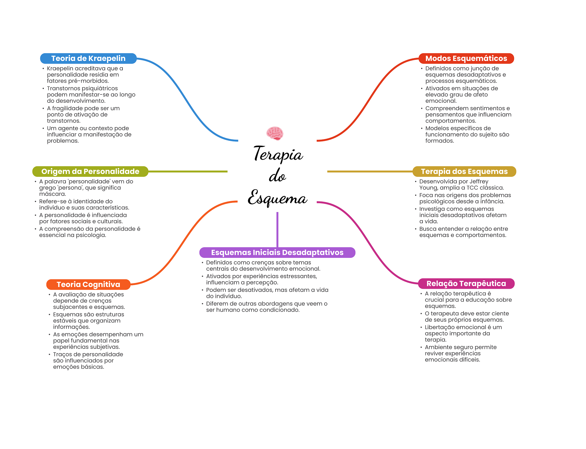 Teoria de Kraepelin Modos Esquemáticos Kraepelin acreditava que a Definidos como junção de personalidade residia em esquemas desadaptativos e fatores pré-morbidos. processos esquemáticos. Transtornos psiquiátricos Ativados em situações de podem manifestar-se ao longo elevado grau de afeto do desenvolvimento. emocional. A fragilidade pode ser um Compreendem sentimentos e ponto de ativação de pensamentos que influenciam transtornos. comportamentos. Um agente ou contexto pode Modelos específicos de influenciar a manifestação de funcionamento do sujeito são problemas. formados. Terapia Origem da Personalidade do Terapia dos Esquemas A palavra vem do Desenvolvida por Jeffrey grego 'persona', que significa Young, amplia a TCC clássica. máscara. Refere-se à identidade do Esquema Foca nas origens dos problemas psicológicos desde a infância. indivíduo e suas características. Investiga como esquemas A personalidade é influenciada iniciais desadaptativos afetam por fatores sociais e culturais. a vida. A compreensão da personalidade é Busca entender a relação entre essencial na psicologia. esquemas e comportamentos. Esquemas Iniciais Desadaptativos Definidos como crenças sobre temas centrais do desenvolvimento emocional. Ativados por experiências estressantes, Teoria Cognitiva influenciam a percepção. Relação Terapêutica Podem ser desativados, mas afetam a vida A avaliação de situações do indivíduo. A relação terapêutica é depende de crenças crucial para a educação sobre subjacentes e esquemas. Diferem de outras abordagens que veem esquemas. ser humano como condicionado. Esquemas são estruturas terapeuta deve estar ciente estáveis que organizam de seus próprios esquemas. informações. Libertação emocional é um As emoções desempenham um aspecto importante da papel fundamental nas terapia. experiências subjetivas. Ambiente seguro permite Traços de personalidade reviver experiências são influenciados por emocionais difíceis. emoções básicas.
