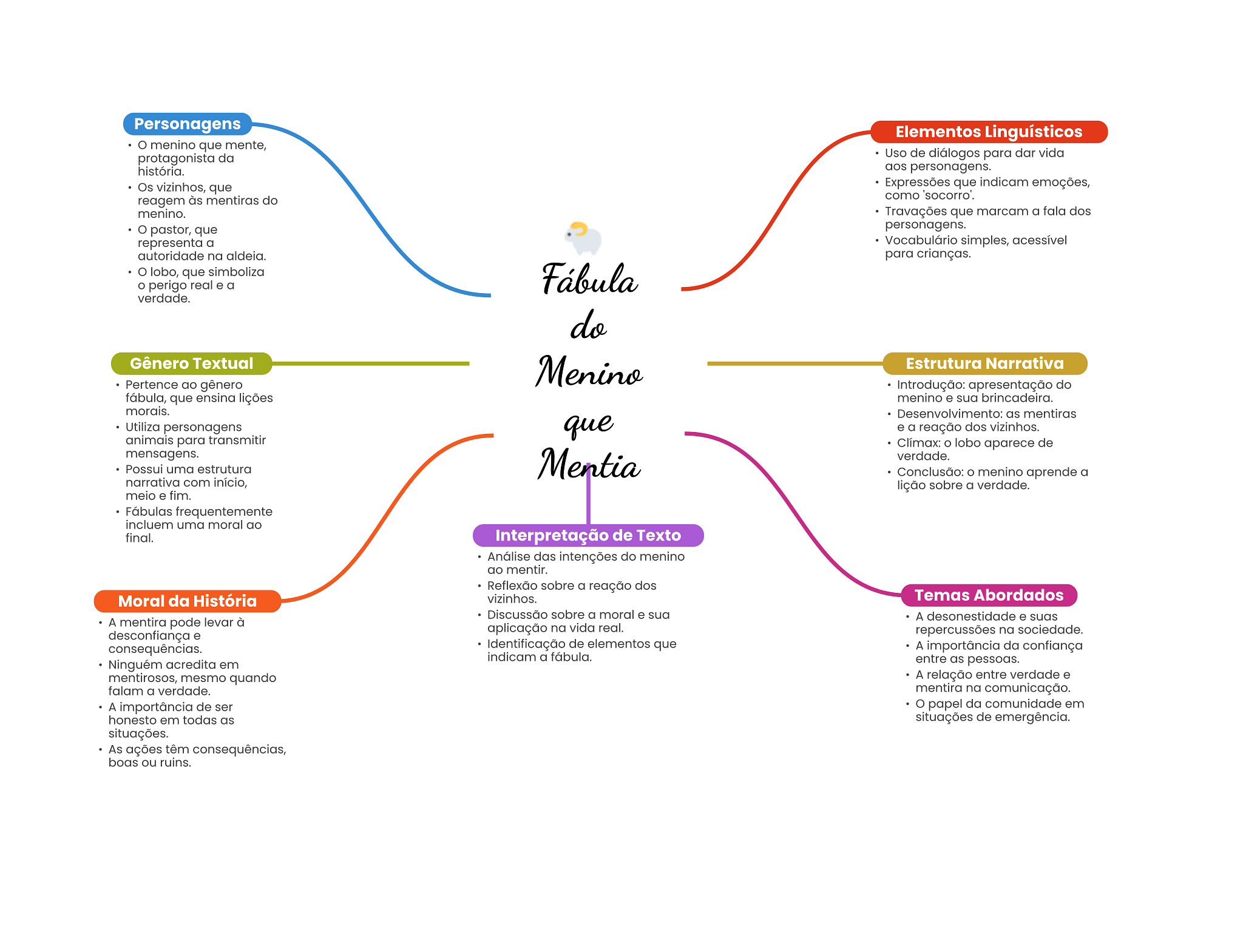 Personagens Elementos Linguísticos menino que mente, protagonista da Uso de diálogos para dar vida história. aos personagens. Os vizinhos, que Expressões que indicam emoções, reagem às mentiras do como 'socorro'. menino. Travações que marcam a fala dos pastor, que personagens. representa a Vocabulário simples, acessível autoridade na aldeia. para crianças. lobo, que simboliza perigo real e a Fábula verdade. do Gênero Textual Menino Estrutura Narrativa Pertence ao gênero Introdução: apresentação do fábula, que ensina lições menino e sua brincadeira. morais. Desenvolvimento: as mentiras Utiliza personagens que e a reação dos vizinhos. animais para transmitir Clímax: lobo aparece de mensagens. Mentia verdade. Possui uma estrutura Conclusão: O menino aprende a narrativa com início, lição sobre a verdade. meio e fim. Fábulas frequentemente incluem uma moral ao final. Interpretação de Texto Análise das intenções do menino ao mentir. Reflexão sobre a reação dos Moral da História vizinhos. Temas Abordados Discussão sobre a moral e sua A desonestidade e suas A mentira pode levar à aplicação na vida real. desconfiança e repercussões na sociedade. consequências. Identificação de elementos que A importância da confiança indicam a fábula. Ninguém acredita em entre as pessoas. mentirosos, mesmo quando A relação entre verdade e falam a verdade. mentira na comunicação. A importância de ser papel da comunidade em honesto em todas as situações de emergência. situações. As ações têm consequências, boas ou ruins.