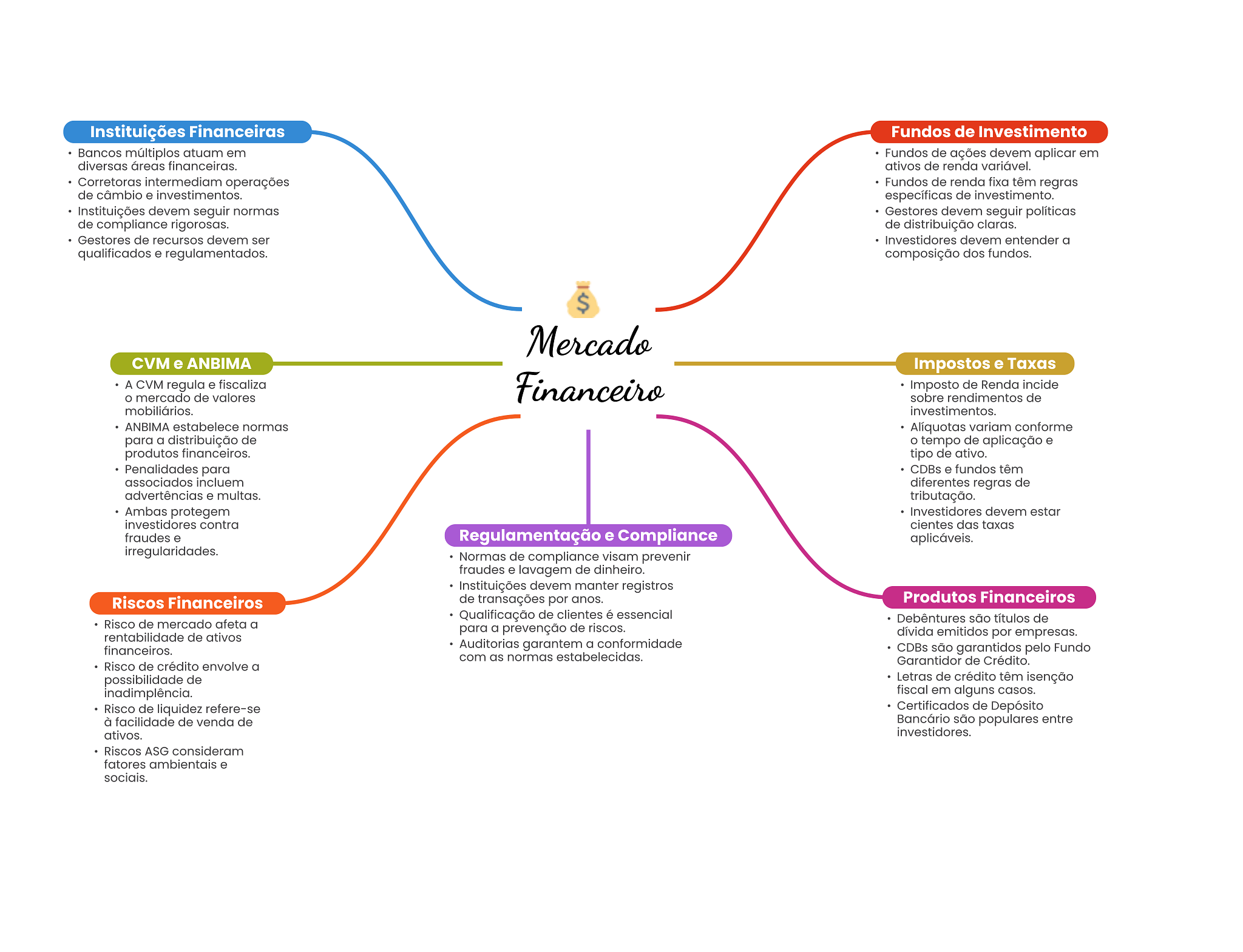 Instituições Financeiras Fundos de Investimento Bancos múltiplos atuam em Fundos de ações devem em diversas áreas financeiras. ativos de renda variável. Corretoras intermediam operações Fundos de renda fixa têm regras de câmbio e investimentos. específicas de investimento. Instituições devem seguir normas Gestores devem seguir políticas de compliance rigorosas. de distribuição claras. Gestores de recursos devem ser Investidores devem entender a qualificados e regulamentados. composição dos fundos. $ Mercado CVM e ANBIMA Impostos e Taxas A CVM regula e fiscaliza Financeiro Imposto de Renda incide mercado de valores sobre rendimentos de mobiliários. investimentos. ANBIMA estabelece normas Alíquotas variam conforme para a distribuição de tempo de aplicação e produtos financeiros. tipo de ativo. Penalidades para CDBs e fundos têm associados incluem diferentes regras de advertências e multas. tributação. Ambas protegem Investidores devem estar investidores contra cientes das taxas fraudes e Regulamentação e Compliance aplicáveis. irregularidades. Normas de compliance visam prevenir fraudes e lavagem de dinheiro. Instituições devem manter registros Riscos Financeiros de transações por anos. Produtos Financeiros Qualificação de clientes é essencial Risco de mercado afeta a Debêntures são títulos de para a prevenção de riscos. rentabilidade de ativos dívida emitidos por empresas. financeiros. Auditorias garantem a conformidade CDBs são garantidos pelo Fundo com as normas estabelecidas. Risco de crédito envolve a Garantidor de Crédito. possibilidade de Letras de crédito têm isenção inadimplência. fiscal em alguns casos. Risco de liquidez refere-se Certificados de Depósito à facilidade de venda de Bancário são populares entre ativos. investidores. Riscos ASG consideram fatores ambientais e sociais.