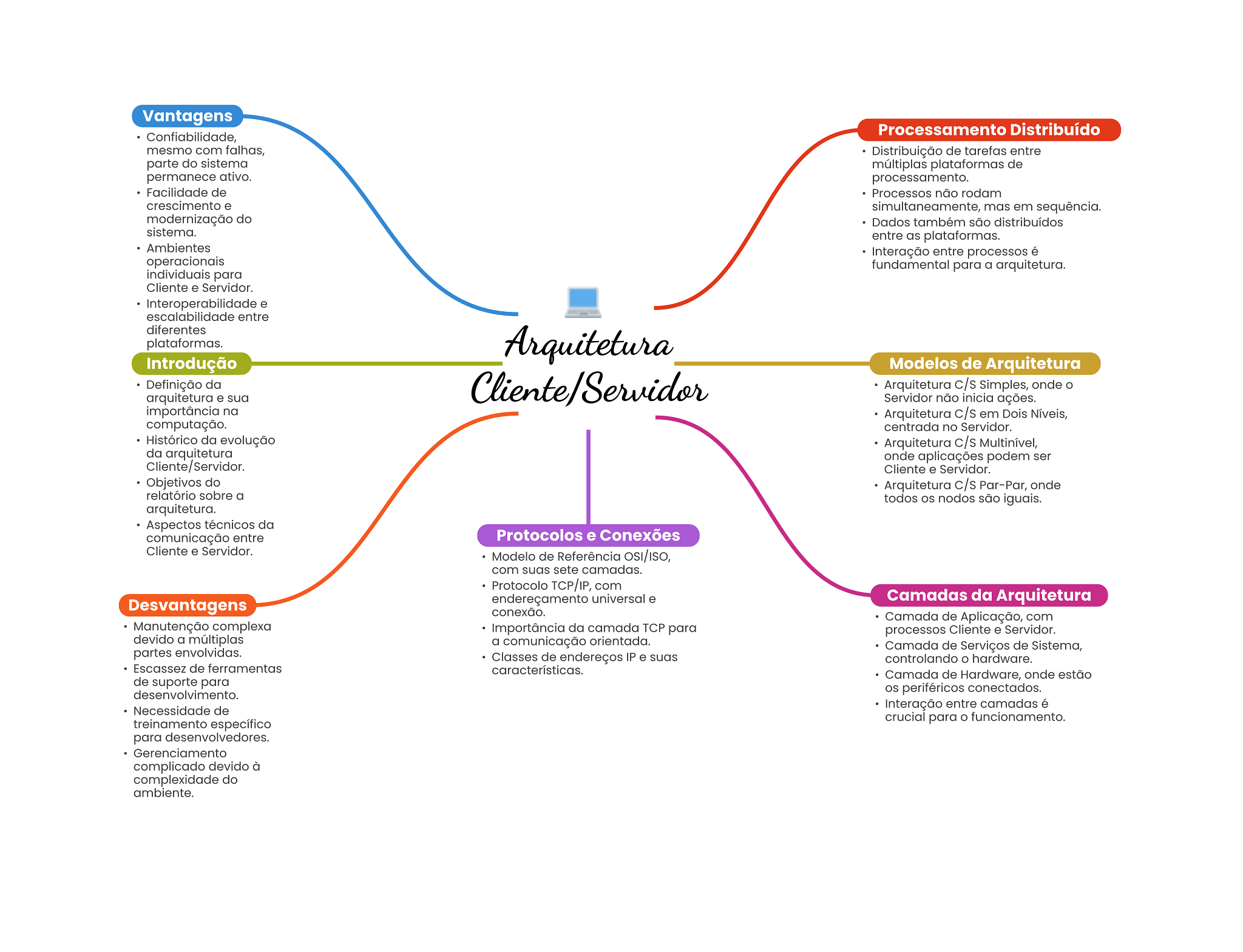 Vantagens Processamento Distribuído Confiabilidade, mesmo com falhas, Distribuição de tarefas entre parte do sistema múltiplas plataformas de permanece ativo. processamento. Facilidade de Processos não rodam crescimento e simultaneamente, mas em sequência. modernização do Dados também são distribuídos sistema. entre as plataformas. Ambientes Interação entre processos é operacionais fundamental para a arquitetura. individuais para Cliente e Servidor. Interoperabilidade e escalabilidade entre diferentes plataformas. Arquitetura Introdução Modelos de Arquitetura Definição da Cliente/Servidor Arquitetura c/s Simples, onde arquitetura e sua Servidor não ações. importância na Arquitetura c/s em Dois Níveis, computação. centrada no Servidor. Histórico da evolução Arquitetura c/s Multinível, da arquitetura onde aplicações podem ser Cliente/Servidor. Cliente e Servidor. Objetivos do Arquitetura c/s Par-Par, onde relatório sobre a todos nodos são iguais. arquitetura. Aspectos técnicos da comunicação entre Protocolos e Conexões Cliente e Servidor. Modelo de Referência OSI/ISO, com suas sete camadas. Protocolo TCP/IP, com Desvantagens endereçamento universal e Camadas da Arquitetura conexão. Camada de Aplicação, com Manutenção complexa Importância da camada TCP para processos Cliente e Servidor. devido a múltiplas a comunicação orientada. Camada de Serviços de Sistema, partes envolvidas. Classes de endereços IP e suas controlando hardware. Escassez de ferramentas características. Camada de Hardware, onde estão de suporte para desenvolvimento. periféricos conectados. Necessidade de Interação entre camadas é treinamento específico crucial para funcionamento. para desenvolvedores. Gerenciamento complicado devido à complexidade do ambiente.