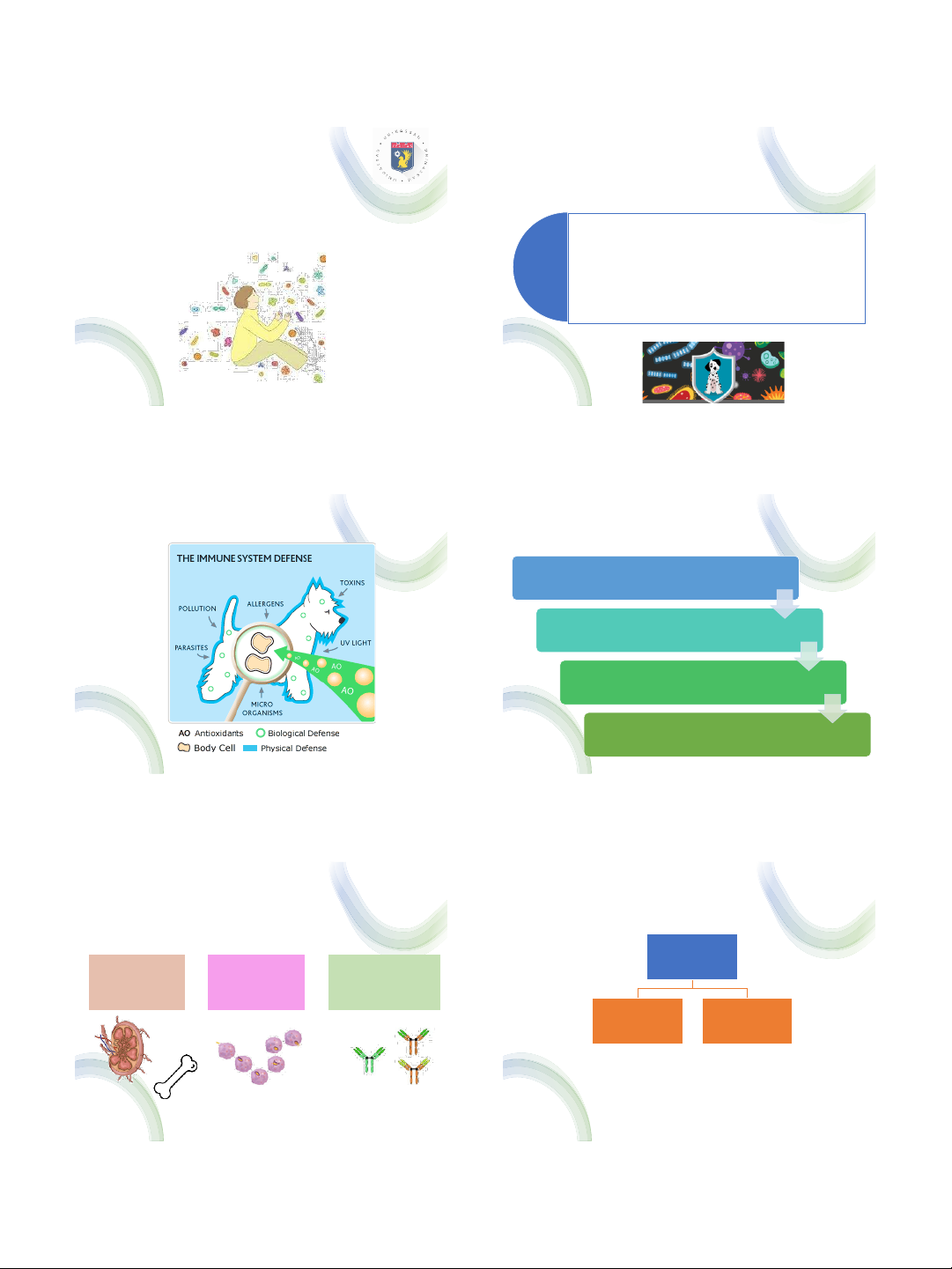 26/02/2026 1 CONCEITOS, FUNCIONAMENTO E COMPONENTES GERAIS DO SISTEMA IMUNE Profa. Stephanie Gueiros SISTEMA IMUNE Conjunto de moléculas, células tecidos e orgãos que trabalham juntos para defender o organismo contra a ação de agentes “estranhos” ou situações anormais em células e tecidos IMPORTÂNCIA DO SISTEMA IMUNE FUNÇÃO DO SISTEMA IMUNE Reconhecimento e eliminação de moléculas alteradas e células lesadas e/ou mortas do próprio organismo. Reconhecimento e eliminação de agentes infecciosos Reconhecimento e eliminação de células tumorais Reconhecimento e eliminação de células, tecidos e/ou órgãos de origem genética diferente QUEM COMPÕE O SISTEMA IMUNOLÓGICO? ÓRGÃOS CÉLULAS MOLÉCULAS ÓRGÃOS PRIMÁRIO SECUNDÁRIO 1 2 3 4 5 6 26/02/2026 2 PRIMÁRIO TIMO MEDULA ÓSSEA BURSA DE FABRICIUS ORIGINAM OU MATURAM LINFÓCITOS A MATURAÇÃO DE CÉLULAS IMUNES OCORRE NA AUSÊNCIA DE UM ANTÍGENO ESTRANHO TIMO • ÓRGÃO BILOBADO SITUADO NO MEDIASTINO ANTERIOR • LOCAL DE MATURAÇÃO DE LINFÓCITOS T MEDULA ÓSSEA • LOCAL DE GERAÇÃO DE CÉLULAS SANGUÍNEAS • HEMATOPOESE MEDULA ÓSSEA • HEMATOPOESE BURSA DE FABRICIUS • PRECUSSORES DE CÉLULAS B • APÓS INVOLUÇÃO, A MEDULA ASSUME A PRODUÇÃO DE CÉLULAS NA MEDULA ÓSSEA 7 8 9 10 11 12 26/02/2026 3 SECUNDÁRIO BAÇO LINFONODO TONSILAS PLACAS DE PEYER MALT ORIGANIZAM LEUCÓCITOS MONTAGEM DA RESPOSTA IMUNOLÓGICA LINFONODOS • AGREGADOS NODULARES DE TECIDO LINFÓIDE • SÃO FIRMES, DE SUPERFÍCIE LISA COM FORMA EM GERAL OVÓIDE OU DE FEIJÃO • LOCALIZAM-SE AO LONGO DAS VIAS LINFÁTICAS, EM UM PADRÃO QUE VARIA COM A ESPÉCIE E COM O INDIVÍDUO FUNÇÃO Filtração de partículas Local de captura e destruição de microorganismos Produção de linfócitos e anticorpos LINFONODOS CÉLULAS B CÉLULAS TZONA PARACORTICAL FOLÍCULO LINFÓIDE LINFONODOS LINFONODOS BAÇO • NÃO TEM LIGAÇÃO DIRETA COM VASOS LINFÁTICOS • LOCAL DE RESPOSTA IMUNOLÓGICA DE PATÓGENOS PROVENIENTE DO SANGUE CÉLULAS SANGUÍNEAS VELHAS E DANIFICADAS IMUNOCOMPLEXOS MICROORGANISMOS OPSONIZADOS REMOVE DA CIRCULAÇÃO 13 14 15 16 17 18 26/02/2026 4 TECIDO LINFÓIDE ASSOCIADO ÀS MUCOSAS (MALT) NASAL – NALT BRÔNQIOS – BALT INTESTINO – GALT CÉLULAS MÉDULA ÓSSEA SANGUE TECIDO CÉLULAS-TRONCO HEMATOPOÉTICAS HEMATOPOESE PROGENITOR MIELÓIDE PROGENITOR LINFÓIDE MÉDULA ÓSSEA SANGUE TECIDO CÉLULAS-TRONCO HEMATOPOÉTICAS PROGENITOR LINFÓIDE CÉLULA T CÉLULA B NATURAL KILLER (NK) ILC1 ILC2 ILC3 MÉDULA ÓSSEA SANGUE TECIDO CÉLULAS-TRONCO HEMATOPOÉTICAS PROGENITOR MIELÓIDE PROGENITOR MEGACARIÓCITO/ ERITRÓCITO PROGENITOR GRANULÓCITO/ MACROFÁGO PROGENITOR CÉLULA DENDRÍTICA MÉDULA ÓSSEA SANGUE TECIDO CÉLULAS-TRONCO HEMATOPOÉTICAS PROGENITOR MIELÓIDE PROGENITOR MEGACARIÓCITO/ ERITRÓCITO PLAQUETAS MEGACARÍOCITOS ERITROBLASTOS ERITRÓCITOS 19 20 21 22 23 24 26/02/2026 5 MÉDULA ÓSSEA SANGUE TECIDO CÉLULAS-TRONCO HEMATOPOÉTICAS PROGENITOR MIELÓIDE MONÓCITO PERCUSSOR MASTÓCITO BASÓFILO NEUTRÓFILO EOSINÓFILO PROGENITOR GRANULÓCITO/MACRO FÁGO MACRÓFAGO MASTÓCITO MÉDULA ÓSSEA SANGUE TECIDO CÉLULAS-TRONCO HEMATOPOÉTICAS PROGENITOR MIELÓIDE PROGENITOR CÉLULA DENDRÍTICA PRÉ- CÉLULA DENDRÍTICA CÉLULA DENDRÍTICA CD4+ CD8+ LINHAGEM LINFÓIDE DIFERENCICAÇÃO EM PLASMÓCITOS CÉLULA ASSASSINA NATURAL PRODUÇÃO DE ANTICORPOS 25 26 27 28 29 30 26/02/2026 6 MOLÉCULAS 31 32 Slide 1: CONCEITOS, FUNCIONAMENTO E COMPONENTES GERAIS DO SISTEMA IMUNE Slide 2: SISTEMA IMUNE Slide 3: IMPORTÂNCIA DO SISTEMA IMUNE Slide 4: FUNÇÃO DO SISTEMA IMUNE Slide 5: QUEM COMPÕE O SISTEMA IMUNOLÓGICO? Slide 6 Slide 7 Slide 8: TIMO Slide 9: MEDULA ÓSSEA Slide 10: MEDULA ÓSSEA Slide 11: BURSA DE FABRICIUS Slide 12 Slide 13 Slide 14: LINFONODOS Slide 15: LINFONODOS Slide 16: LINFONODOS Slide 17: LINFONODOS Slide 18: BAÇO Slide 19: TECIDO LINFÓIDE ASSOCIADO ÀS MUCOSAS (MALT) Slide 20: CÉLULAS Slide 21 Slide 22 Slide 23 Slide 24 Slide 25 Slide 26 Slide 27 Slide 28 Slide 29 Slide 30: LINHAGEM LINFÓIDE Slide 31 Slide 32: MOLÉCULAS