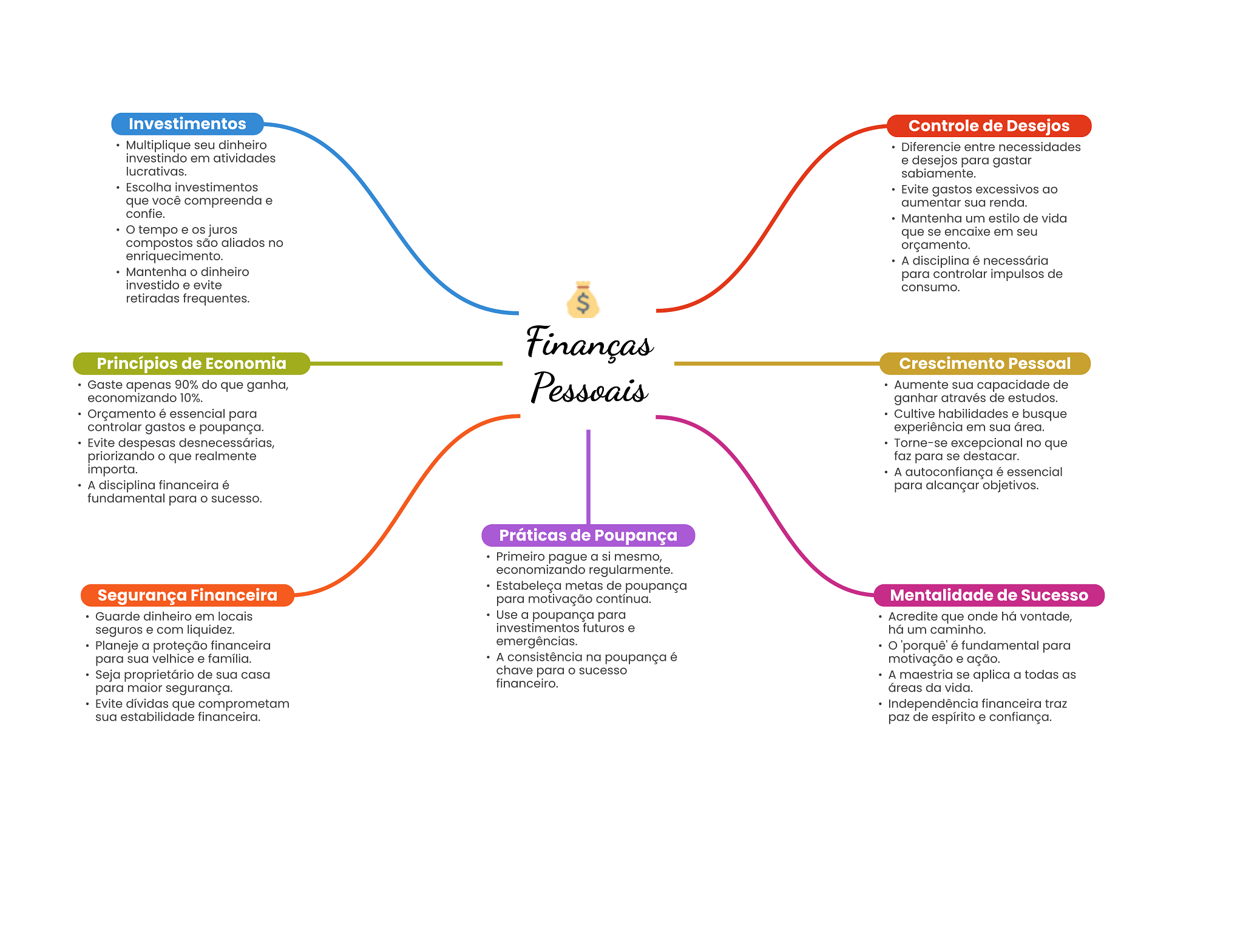 Investimentos Controle de Desejos Multiplique seu dinheiro Diferencie entre necessidades investindo em atividades e desejos para gastar lucrativas. sabiamente. Escolha investimentos Evite gastos excessivos ao que você compreenda e aumentar sua renda. confie. Mantenha um estilo de vida tempo e juros que se encaixe em seu compostos são aliados no orçamento. enriquecimento. A disciplina é necessária Mantenha dinheiro para controlar impulsos de investido e evite consumo. retiradas frequentes. $ Finanças Princípios de Economia Crescimento Pessoal Gaste apenas 90% do que ganha, Pessoais Aumente sua capacidade de economizando 10%. ganhar através de estudos. Orçamento é essencial para Cultive habilidades e busque controlar gastos e poupança. experiência em sua área. Evite despesas desnecessárias, Torne-se excepcional no que priorizando que realmente faz para se destacar. importa. A autoconfiança é essencial A disciplina financeira é para alcançar objetivos. fundamental para sucesso. Práticas de Poupança Primeiro pague a si mesmo, economizando regularmente. Estabeleça metas de poupança Segurança Financeira para motivação contínua. Mentalidade de Sucesso Guarde dinheiro em locais Use a poupança para Acredite que onde há vontade, seguros e com liquidez. investimentos futuros e há um caminho. Planeje a proteção financeira emergências. 'porquê' é fundamental para para sua velhice e família. A consistência na poupança é motivação e ação. Seja proprietário de sua casa chave para sucesso A maestria se aplica a todas as para maior segurança. financeiro. áreas da vida. Evite dívidas que comprometam Independência financeira traz sua estabilidade financeira. paz de espírito e confiança.