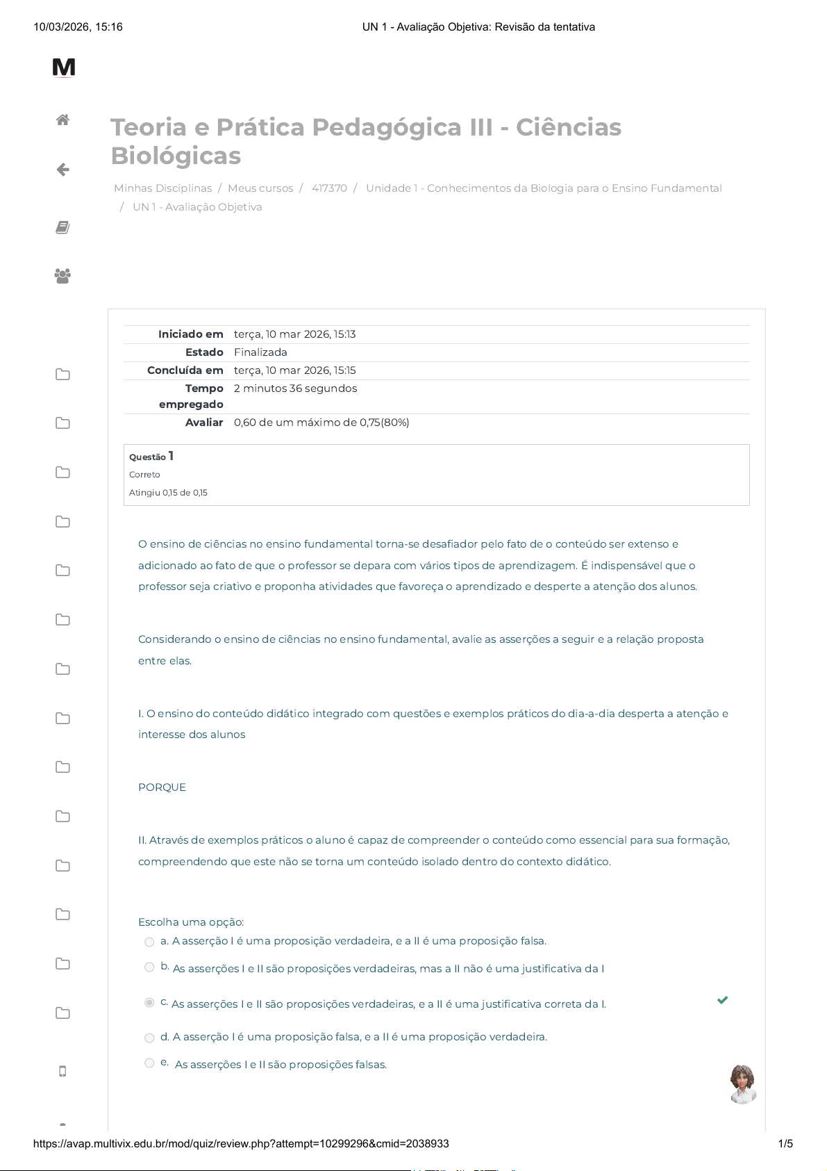 Minhas Disciplinas / Meus cursos / 417370 / Unidade 1 - Conhecimentos da Biologia para o Ensino Fundamental / UN 1 - Avaliação Objetiva Teoria e Prática Pedagógica III - Ciências Biológicas Iniciado em terça, 10 mar 2026, 15:13 Estado Finalizada Concluída em terça, 10 mar 2026, 15:15 Tempo empregado 2 minutos 36 segundos Avaliar 0,60 de um máximo de 0,75(80%) Questão 1 Correto Atingiu 0,15 de 0,15 O ensino de ciências no ensino fundamental torna-se desafiador pelo fato de o conteúdo ser extenso e adicionado ao fato de que o professor se depara com vários tipos de aprendizagem. É indispensável que o professor seja criativo e proponha atividades que favoreça o aprendizado e desperte a atenção dos alunos. Considerando o ensino de ciências no ensino fundamental, avalie as asserções a seguir e a relação proposta entre elas. I. O ensino do conteúdo didático integrado com questões e exemplos práticos do dia-a-dia desperta a atenção e interesse dos alunos PORQUE II. Através de exemplos práticos o aluno é capaz de compreender o conteúdo como essencial para sua formação, compreendendo que este não se torna um conteúdo isolado dentro do contexto didático. Escolha uma opção: a. A asserção I é uma proposição verdadeira, e a II é uma proposição falsa. b. As asserções I e II são proposições verdadeiras, mas a II não é uma justificativa da I c. As asserções I e II são proposições verdadeiras, e a II é uma justificativa correta da I. d. A asserção I é uma proposição falsa, e a II é uma proposição verdadeira. e. As asserções I e II são proposições falsas. 10/03/2026, 15:16 UN 1 - Avaliação Objetiva: Revisão da tentativa https://avap.multivix.edu.br/mod/quiz/review.php?attempt=10299296&cmid=2038933 1/5 https://avap.multivix.edu.br/my/ https://avap.multivix.edu.br/course/view.php?id=38493 https://avap.multivix.edu.br/course/view.php?id=38493§ion=2 https://avap.multivix.edu.br/mod/quiz/view.php?id=2038933 https://avap.multivix.edu.br/my/ https://avap.multivix.edu.br/course/view.php?id=38493 https://avap.multivix.edu.br/user/index.php?id=38493 https://avap.multivix.edu.br/course/view.php?id=38493§ion=1 https://avap.multivix.edu.br/course/view.php?id=38493§ion=2 https://avap.multivix.edu.br/course/view.php?id=38493§ion=3 https://avap.multivix.edu.br/course/view.php?id=38493§ion=4 https://avap.multivix.edu.br/course/view.php?id=38493§ion=5 https://avap.multivix.edu.br/course/view.php?id=38493§ion=6 https://avap.multivix.edu.br/course/view.php?id=38493§ion=7 https://avap.multivix.edu.br/course/view.php?id=38493§ion=8 https://avap.multivix.edu.br/course/view.php?id=38493§ion=9 https://avap.multivix.edu.br/course/view.php?id=38493§ion=10 https://avap.multivix.edu.br/course/view.php?id=38493§ion=11 https://avap.multivix.edu.br/course/view.php?id=38493§ion=12 https://avap.multivix.edu.br/course/view.php?id=38493§ion=13 https://avap.multivix.edu.br/course/view.php?id=38493§ion=14 https://avap.multivix.edu.br/hooks/portal/ https://avap.multivix.edu.br/mod/page/view.php?id=1252%2F%22%20target%3D%22_blank https://avap.multivix.edu.br/ https://avap.multivix.edu.br/ https://avap.multivix.edu.br/ https://avap.multivix.edu.br/ https://avap.multivix.edu.br/ https://avap.multivix.edu.br/ Questão 2 Correto Atingiu 0,15 de 0,15 Ferreira et al. (2010) relata a difícil tarefa de um professor identificar em cada turma as dificuldades individuais de cada aluno, o que consequentemente pode contribuir para falhas no aprendizado devido ao fato de que à medida que aumenta a complexidade de um conteúdo, o desempenho dos alunos pode diminuir, pois o déficit de aprendizagem de conceitos básicos interfere no aprendizado futuro. Em relação as dificuldades individuais dos alunos, analise as afirmativas a seguir. I. O autoconhecimento do professor a respeito de seu tipo de aprendizagem apresenta impacto em seu modo de ensinar II. Devido às particularidades de cada aluno a realização de propostas de aprendizagem em diferentes níveis propicia o aprendizado de forma mais homogênea III. O ensino personalizado é uma ferramenta essencial no processo ensino-aprendizagem. É correto o que se afirma em Escolha uma opção: a. I e II, apenas. b. I, II e III. c. I, apenas. d. II, apenas. e. I e III, apenas. 10/03/2026, 15:16 UN 1 - Avaliação Objetiva: Revisão da tentativa https://avap.multivix.edu.br/mod/quiz/review.php?attempt=10299296&cmid=2038933 2/5 https://avap.multivix.edu.br/my/ https://avap.multivix.edu.br/course/view.php?id=38493 https://avap.multivix.edu.br/user/index.php?id=38493 https://avap.multivix.edu.br/course/view.php?id=38493§ion=1 https://avap.multivix.edu.br/course/view.php?id=38493§ion=2 https://avap.multivix.edu.br/course/view.php?id=38493§ion=3 https://avap.multivix.edu.br/course/view.php?id=38493§ion=4 https://avap.multivix.edu.br/course/view.php?id=38493§ion=5 https://avap.multivix.edu.br/course/view.php?id=38493§ion=6 https://avap.multivix.edu.br/course/view.php?id=38493§ion=7 https://avap.multivix.edu.br/course/view.php?id=38493§ion=8 https://avap.multivix.edu.br/course/view.php?id=38493§ion=9 https://avap.multivix.edu.br/course/view.php?id=38493§ion=10 https://avap.multivix.edu.br/course/view.php?id=38493§ion=11 https://avap.multivix.edu.br/course/view.php?id=38493§ion=12 https://avap.multivix.edu.br/course/view.php?id=38493§ion=13 https://avap.multivix.edu.br/course/view.php?id=38493§ion=14 https://avap.multivix.edu.br/hooks/portal/ https://avap.multivix.edu.br/mod/page/view.php?id=1252%2F%22%20target%3D%22_blank https://avap.multivix.edu.br/ https://avap.multivix.edu.br/ https://avap.multivix.edu.br/ https://avap.multivix.edu.br/ https://avap.multivix.edu.br/ https://avap.multivix.edu.br/ Questão 3 Correto Atingiu 0,15 de 0,15 De acordo com o relatório Global Information Technology, publicado em 2016 pelo Fórum Econômico Mundial, os níveis da qualidade da educação em matemática e ciências no B