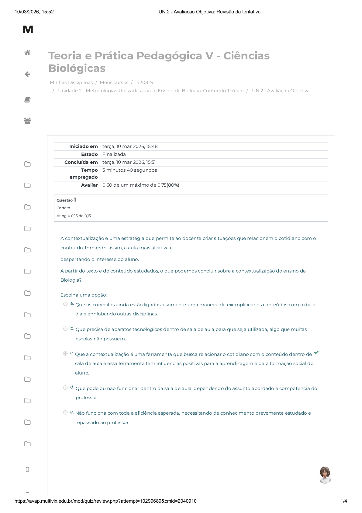 Minhas Disciplinas / Meus cursos / 420829 / Unidade 2 - Metodologias Utilizadas para o Ensino de Biologia: Conteúdo Teórico / UN 2 - Avaliação Objetiva Teoria e Prática Pedagógica V - Ciências Biológicas Iniciado em terça, 10 mar 2026, 15:48 Estado Finalizada Concluída em terça, 10 mar 2026, 15:51 Tempo empregado 3 minutos 40 segundos Avaliar 0,60 de um máximo de 0,75(80%) Questão 1 Correto Atingiu 0,15 de 0,15 A contextualização é uma estratégia que permite ao docente criar situações que relacionem o cotidiano com o conteúdo, tornando, assim, a aula mais atrativa e despertando o interesse do aluno. A partir do texto e do conteúdo estudados, o que podemos concluir sobre a contextualização do ensino da Biologia? Escolha uma opção: a. Que os conceitos ainda estão ligados a somente uma maneira de exemplificar os conteúdos com o dia a dia e englobando outras disciplinas. b. Que precisa de aparatos tecnológicos dentro de sala de aula para que seja utilizada, algo que muitas escolas não possuem. c. Que a contextualização é uma ferramenta que busca relacionar o cotidiano com o conteúdo dentro de sala de aula e essa ferramenta tem influências positivas para a aprendizagem e para formação social do aluno. d. Que pode ou não funcionar dentro da sala de aula, dependendo do assunto abordado e competência do professor e. Não funciona com toda a eficiência esperada, necessitando de conhecimento brevemente estudado e repassado ao professor. 10/03/2026, 15:52 UN 2 - Avaliação Objetiva: Revisão da tentativa https://avap.multivix.edu.br/mod/quiz/review.php?attempt=10299689&cmid=2040910 1/4 https://avap.multivix.edu.br/my/ https://avap.multivix.edu.br/course/view.php?id=38586 https://avap.multivix.edu.br/course/view.php?id=38586§ion=3 https://avap.multivix.edu.br/mod/quiz/view.php?id=2040910 https://avap.multivix.edu.br/my/ https://avap.multivix.edu.br/course/view.php?id=38586 https://avap.multivix.edu.br/user/index.php?id=38586 https://avap.multivix.edu.br/course/view.php?id=38586§ion=1 https://avap.multivix.edu.br/course/view.php?id=38586§ion=2 https://avap.multivix.edu.br/course/view.php?id=38586§ion=3 https://avap.multivix.edu.br/course/view.php?id=38586§ion=4 https://avap.multivix.edu.br/course/view.php?id=38586§ion=5 https://avap.multivix.edu.br/course/view.php?id=38586§ion=6 https://avap.multivix.edu.br/course/view.php?id=38586§ion=7 https://avap.multivix.edu.br/course/view.php?id=38586§ion=8 https://avap.multivix.edu.br/course/view.php?id=38586§ion=9 https://avap.multivix.edu.br/course/view.php?id=38586§ion=10 https://avap.multivix.edu.br/course/view.php?id=38586§ion=11 https://avap.multivix.edu.br/course/view.php?id=38586§ion=12 https://avap.multivix.edu.br/course/view.php?id=38586§ion=13 https://avap.multivix.edu.br/course/view.php?id=38586§ion=14 https://avap.multivix.edu.br/hooks/portal/ https://avap.multivix.edu.br/mod/page/view.php?id=1252%2F%22%20target%3D%22_blank https://avap.multivix.edu.br/ https://avap.multivix.edu.br/ https://avap.multivix.edu.br/ https://avap.multivix.edu.br/ https://avap.multivix.edu.br/ Questão 2 Incorreto Atingiu 0,00 de 0,15 Podem humanizar as ciências e aproximá-las dos interesses pessoais, éticos, culturais e políticos da comunidade; podem tornar as aulas de ciências mais desafiadoras e reflexivas, permitindo, desse modo, o desenvolvimento do pensamento crítico; podem contribuir para um entendimento mais integral de matéria científica, isto é, podem contribuir para a superação do “mar de falta de significação” que se diz ter inundado as salas de aula de ciências, onde fórmulas e equações são recitadas sem que muitos cheguem a saber o que significam; podem melhorar a formação de professores auxiliando o desenvolvimento de uma epistemologia da ciência mais rica e mais autêntica, ou seja, de uma maior compreensão da estrutura das ciências bem como do espaço que ocupam no sistema intelectual das coisas. Com base no texto acima e no conteúdo estudado responda: Qual a importância da abordagem histórica no ensino da Biologia? Escolha uma opção: a. Compreender que a produção do conhecimento científico não é linear, pois os livros didáticos e os livros universitários conservam até hoje este tipo de abordagem Histórica. b. A concepção das ciências como empresa coletiva e histórica e o entendimento das relações com a tecnologia, a cultura e a sociedade. c. Proporcionar uma compreensão maior da natureza do conhecimento científico; um melhor entendimento dos conceitos e teorias da física; uma compreensão dos obstáculos e possíveis dificuldades dos alunos d. Necessidade de adotar uma perspectiva histórica no ensino de Biologia sem que os instrumentos para que essa proposta seja levada a cabo de maneira satisfatória sejam desenvolvidos. e. Necessidade de demonstrar uma filiação contínua na construção do conhecimento, pois as teorias atuais não são necessariamente decorrentes das anteriores. Acreditamos que uma abordagem histórica deveria centrar-se nas rupturas epistemológicas. 10/03/2026, 15:52 UN 2 - Avaliação Objetiva: Revisão da tentativa https://avap.multivix.edu.br/mod/quiz/review.php?attempt=10299689&cmid=2040910 2/4 https://avap.multivix.edu.br/my/ https://avap.multivix.edu.br/course/view.php?id=38586 https://avap.multivix.edu.br/user/index.php?id=38586 https://avap.multivix.edu.br/course/view.php?id=38586§ion=1 https://avap.multivix.edu.br/course/view.php?id=38586§ion=2 https://avap.multivix.edu.br/course/view.php?id=38586§ion=3 https://avap.multivix.edu.br/course/view.php?id=38586§ion=4 https://avap.multivix.edu.br/course/view.php?id=38586§ion=5 https://avap.multivix.edu.br/course/view.php?id=38586§ion=6 https://avap.multivix.edu.br/course/view.php?id=38586§ion=7 https://avap.multivix.edu.br/course/view.php?id=38586§ion=8 https://avap.multivix.edu.br/course/view.php?id=38586§ion=9 https://avap.multivix.edu.br/course/view.php?id=3858