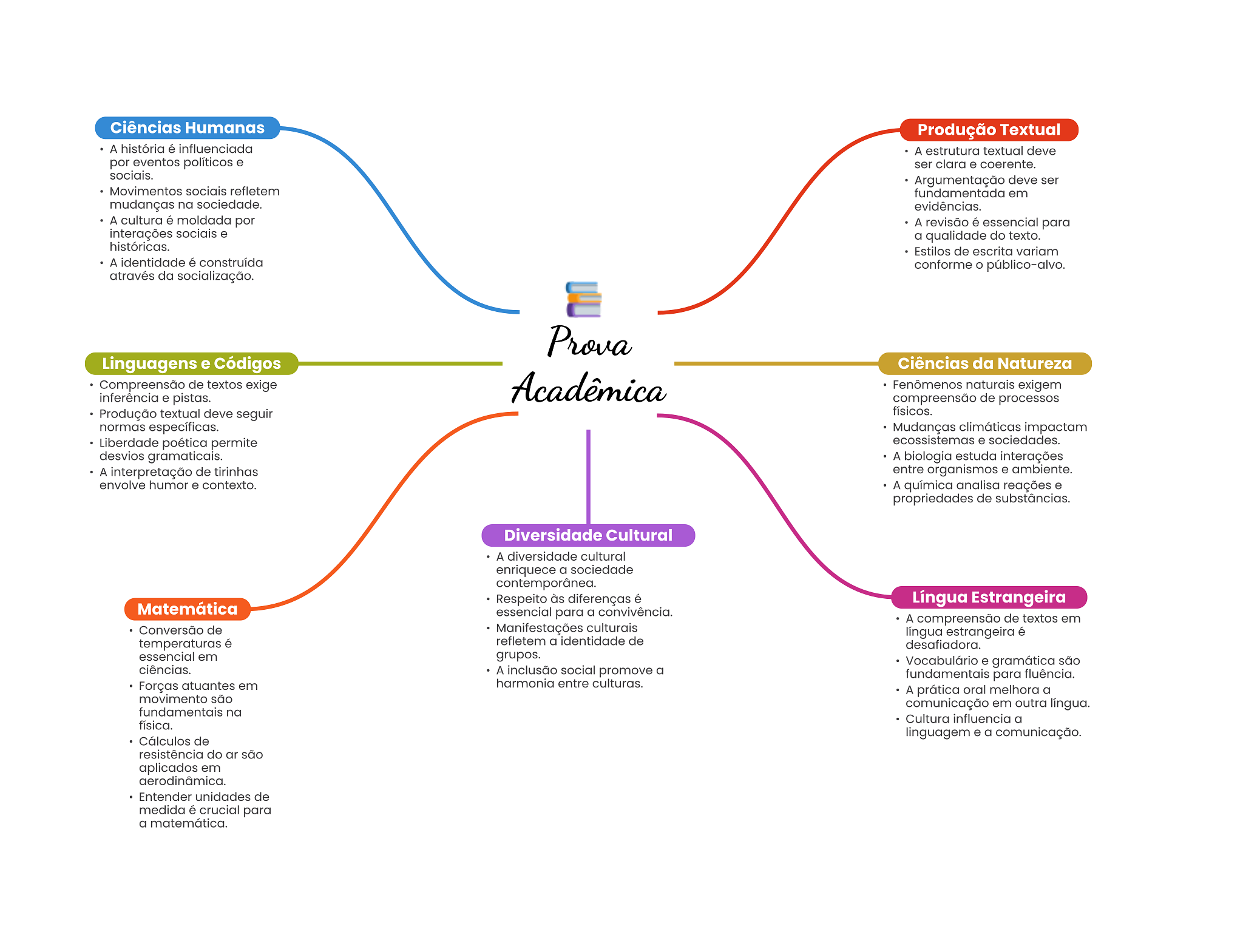 Ciências Humanas Produção Textual A história é influenciada A estrutura textual deve por eventos políticos e ser clara e coerente. sociais. Argumentação deve ser Movimentos sociais refletem fundamentada em mudanças na sociedade. evidências. A cultura é moldada por A revisão é essencial para interações sociais e a qualidade do texto. históricas. Estilos de escrita variam A identidade é construída conforme público-alvo. através da socialização. Prova Linguagens e Códigos Ciências da Natureza Compreensão de textos exige Acadêmica Fenômenos naturais exigem inferência e pistas. compreensão de processos Produção textual deve seguir físicos. normas específicas. Mudanças climáticas impactam Liberdade poética permite ecossistemas e sociedades. desvios gramaticais. A biologia estuda interações A interpretação de tirinhas entre organismos e ambiente. envolve humor e contexto. A química analisa reações e propriedades de substâncias. Diversidade Cultural A diversidade cultural enriquece a sociedade contemporânea. Respeito às diferenças é Língua Estrangeira Matemática essencial para a convivência. A compreensão de textos em Conversão de Manifestações culturais língua estrangeira é temperaturas é refletem a identidade de desafiadora. essencial em grupos. Vocabulário e gramática são ciências. A inclusão social promove a fundamentais para fluência. Forças atuantes em harmonia entre culturas. A prática oral melhora a movimento são comunicação em outra língua. fundamentais na Cultura influencia a física. linguagem e a comunicação. Cálculos de resistência do ar são aplicados em aerodinâmica. Entender unidades de medida é crucial para a matemática.