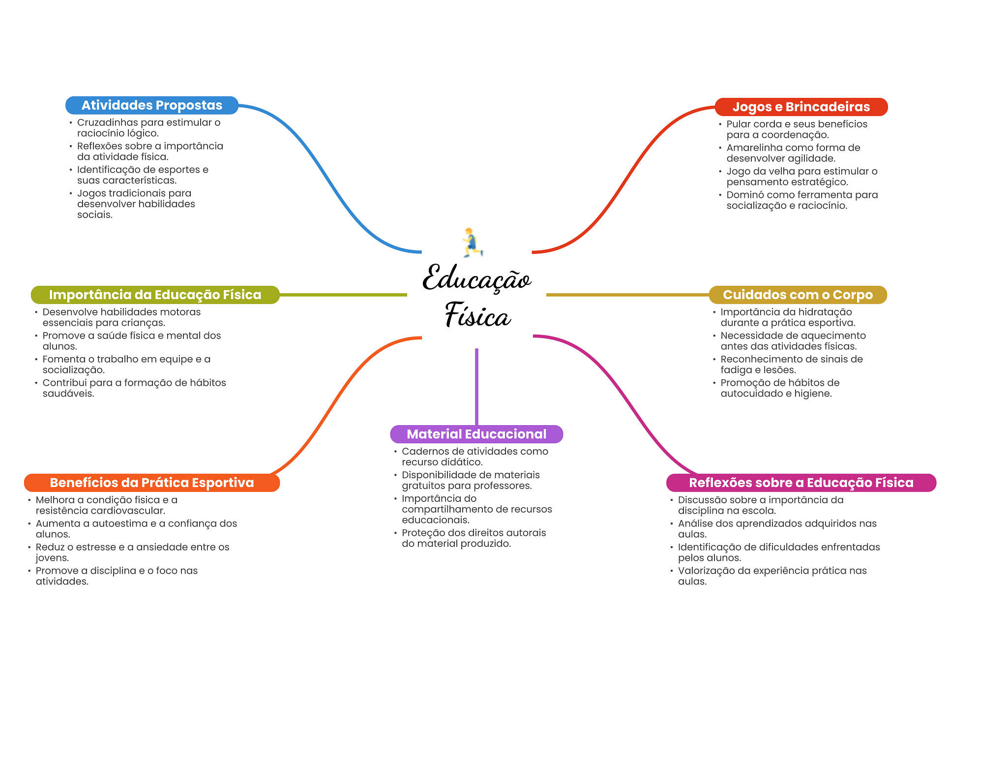 Atividades Propostas Jogos e Brincadeiras Cruzadinhas para estimular Pular corda e seus benefícios raciocínio lógico. para a coordenação. Reflexões sobre a importância Amarelinha como forma de da atividade física. desenvolver agilidade. Identificação de esportes e Jogo da velha para estimular suas características. pensamento estratégico. Jogos tradicionais para Dominó como ferramenta para desenvolver habilidades socialização e raciocínio. sociais. Educação Importância da Educação Física Cuidados com Corpo Desenvolve habilidades motoras Física Importância da hidratação essenciais para crianças. durante a prática esportiva. Promove a saúde física e mental dos Necessidade de aquecimento alunos. antes das atividades físicas. Fomenta O trabalho em equipe e a Reconhecimento de sinais de socialização. fadiga e lesões. Contribui para a formação de hábitos Promoção de hábitos de saudáveis. autocuidado e higiene. Material Educacional Cadernos de atividades como recurso didático. Disponibilidade de materiais Benefícios da Prática Esportiva gratuitos para professores. Reflexões sobre a Educação Física Melhora a condição física e a Importância do Discussão sobre a importância da resistência cardiovascular. compartilhamento de recursos disciplina na escola. Aumenta a autoestima e a confiança dos educacionais. Análise dos aprendizados adquiridos nas alunos. Proteção dos direitos autorais aulas. Reduz estresse e a ansiedade entre OS do material produzido. Identificação de dificuldades enfrentadas jovens. pelos alunos. Promove a disciplina e foco nas Valorização da experiência prática nas atividades. aulas.