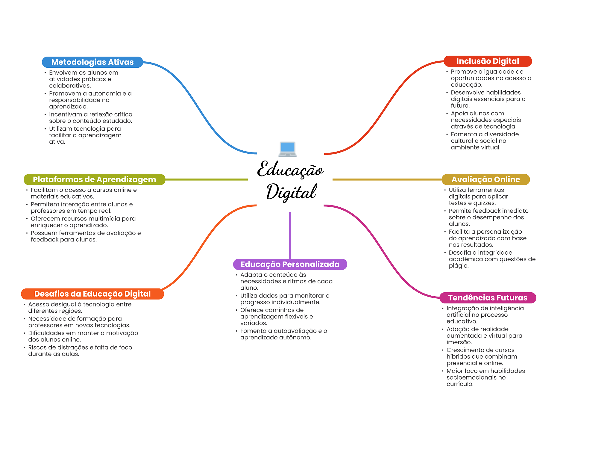 Metodologias Ativas Inclusão Digital Envolvem alunos em Promove a igualdade de atividades práticas e oportunidades no acesso à colaborativas. educação. Promovem a autonomia e a Desenvolve habilidades responsabilidade no digitais essenciais para o aprendizado. futuro. Incentivam a reflexão crítica Apoia alunos com sobre conteúdo estudado. necessidades especiais Utilizam tecnologia para através de tecnologia. facilitar a aprendizagem Fomenta a diversidade ativa. cultural e social no ambiente virtual. Educação Plataformas de Aprendizagem Avaliação Online Facilitam acesso a cursos online e Digital Utiliza ferramentas materiais educativos. digitais para aplicar Permitem interação entre alunos e testes e quizzes. professores em tempo real. Permite feedback imediato Oferecem recursos multimídia para sobre O desempenho dos enriquecer aprendizado. alunos. Possuem ferramentas de avaliação e Facilita a personalização feedback para alunos. do aprendizado com base nos resultados. Desafia a integridade acadêmica com questões de Educação Personalizada plágio. Adapta conteúdo às necessidades e ritmos de cada aluno. Desafios da Educação Digital Utiliza dados para monitorar O Tendências Futuras Acesso desigual à tecnologia entre progresso individualmente. diferentes regiões. Oferece caminhos de Integração de inteligência Necessidade de formação para aprendizagem e artificial no processo variados. educativo. professores em novas tecnologias. Fomenta a autoavaliação e Adoção de realidade Dificuldades em manter a motivação dos alunos online. aprendizado autônomo. aumentada e virtual para imersão. Riscos de distrações e falta de foco Crescimento de cursos durante as aulas. híbridos que combinam presencial e online. Maior foco em habilidades socioemocionais no currículo.