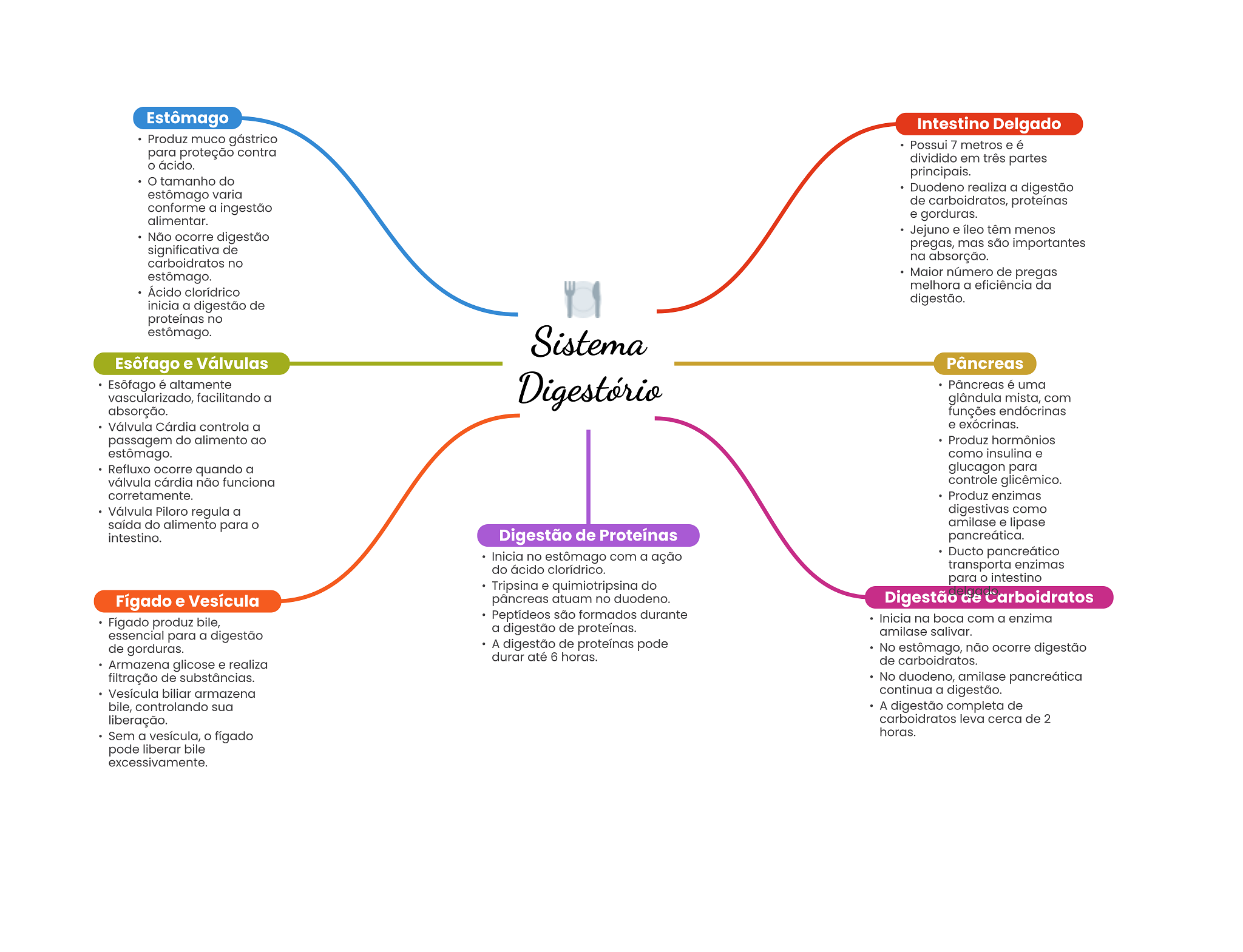 Estômago Intestino Delgado Produz muco gástrico Possui 7 metros e é para proteção contra ácido. dividido em três partes principais. tamanho do Duodeno realiza a digestão estômago varia de carboidratos, proteínas conforme a ingestão alimentar. e gorduras. Jejuno e íleo têm menos Não ocorre digestão pregas, mas são importantes significativa de carboidratos no na absorção. estômago. Maior número de pregas melhora a eficiência da Ácido clorídrico digestão. inicia a digestão de proteínas no estômago. Sistema Esôfago e Válvulas Pâncreas Esôfago é altamente vascularizado, facilitando a Digestório Pâncreas é uma glândula mista, com absorção. funções endócrinas Válvula Cárdia controla a e exócrinas. passagem do alimento ao Produz hormônios estômago. como insulina e Refluxo ocorre quando a glucagon para válvula cárdia não funciona controle glicêmico. corretamente. Produz enzimas Válvula Piloro regula a digestivas como saída do alimento para amilase e lipase intestino. Digestão de Proteínas Inicia no estômago com a ação Ducto pancreático do ácido clorídrico. transporta enzimas para intestino Tripsina e quimiotripsina do Fígado e Vesícula pâncreas atuam no duodeno. Digestão de Carboidratos Peptídeos são formados durante Fígado produz bile, Inicia na boca com a enzima a digestão de proteínas. essencial para a digestão amilase salivar. de gorduras. A digestão de proteínas pode No estômago, não ocorre digestão durar até 6 horas. Armazena glicose e realiza de carboidratos. filtração de substâncias. No duodeno, amilase Vesícula biliar armazena continua a digestão. bile, controlando sua A digestão completa de liberação. carboidratos leva cerca de 2 Sem a vesícula, fígado horas. pode liberar bile excessivamente.