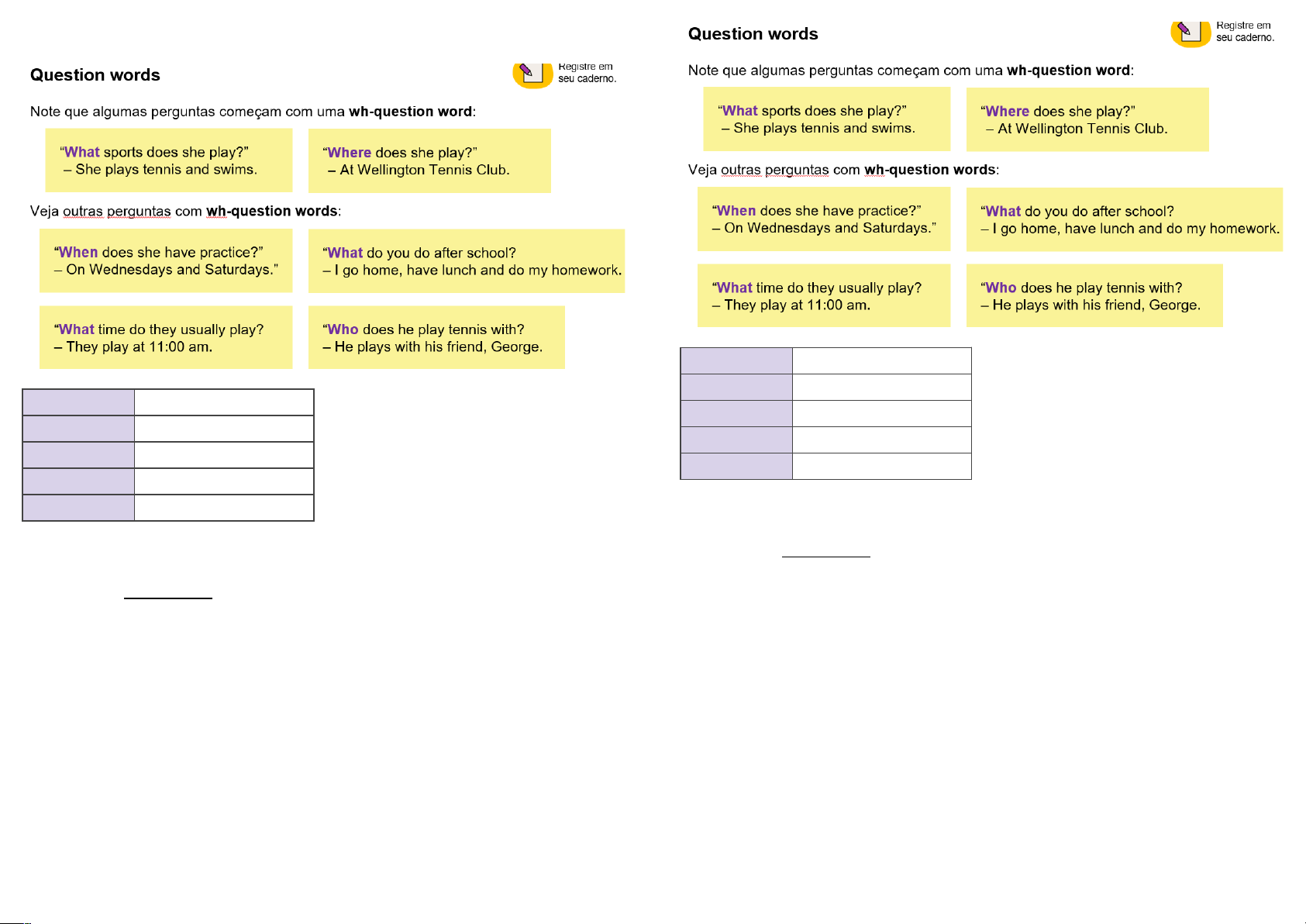 6 anos – Inglês - Marinês What Que / O que / Qual Where Onde When Quando Who Quem What time Que horas Agora, escreva questões para as respostas utilizando wh-question words. Exemplo: “What time does she get up? R:– She gets up at 7:00 am. (what time) 1. _________________________________________ – I have English classes on Tuesdays and Thursdays. (when) 2. _________________________________________ – She plays volleyball on Wednesdays. (what) 3._________________________________________ – I practice football at school. (where) 4. _________________________________________ – I usually have a sandwich for breakfast. (what) 5. __________________________________________________________ – My mom has lunch at noon. (what time) 6 anos – Inglês - Marinês What Que / O que / Qual Where Onde When Quando Who Quem What time Que horas Agora, escreva questões para as respostas utilizando wh-question words. Exemplo: “What time does she get up? R:– She gets up at 7:00 am. (what time) 1. _________________________________________ – I have English classes on Tuesdays and Thursdays. (when) 2. _________________________________________ – She plays volleyball on Wednesdays. (what) 3._________________________________________ – I practice football at school. (where) 4. _________________________________________ – I usually have a sandwich for breakfast. (what) 5. __________________________________________________________ – My mom has lunch at noon. (what time) image1.png