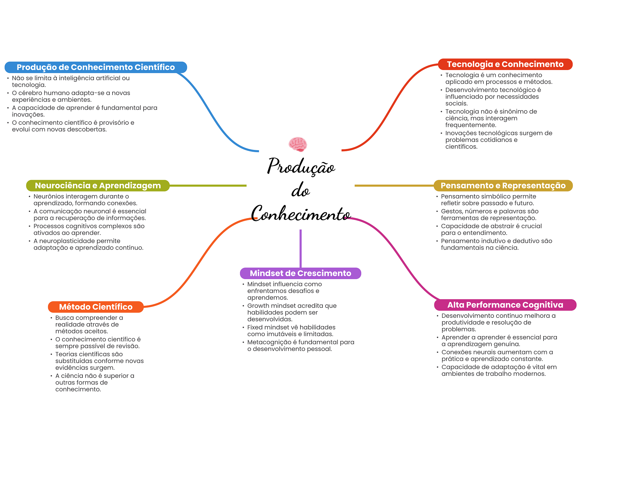 Produção de Conhecimento Científico Tecnologia e Conhecimento Não se limita à inteligência artificial ou Tecnologia é um conhecimento tecnologia. aplicado em processos e métodos. cérebro humano adapta-se a novas Desenvolvimento tecnológico é experiências e ambientes. influenciado por necessidades sociais. A capacidade de aprender é fundamental para inovações. Tecnologia não é sinônimo de ciência, mas interagem conhecimento científico é provisório e frequentemente. evolui com novas descobertas. Inovações tecnológicas surgem de problemas cotidianos e científicos. Produção Neurociência e Aprendizagem do Pensamento e Representação Neurônios interagem durante Pensamento simbólico permite aprendizado, formando conexões. refletir sobre passado e futuro. A comunicação neuronal é essencial Conhecimento Gestos, números e palavras são para a recuperação de informações. ferramentas de representação. Processos cognitivos complexos são Capacidade de abstrair é crucial ativados ao aprender. para entendimento. A neuroplasticidade permite Pensamento indutivo e dedutivo são adaptação e aprendizado contínuo. fundamentais na ciência. Mindset de Crescimento Mindset influencia como enfrentamos desafios e aprendemos. Método Científico Growth mindset acredita que Alta Performance Cognitiva habilidades podem ser Busca compreender a Desenvolvimento contínuo melhora a desenvolvidas. realidade através de produtividade e resolução de Fixed mindset vê habilidades métodos aceitos. problemas. como imutáveis e limitadas. conhecimento científico é Aprender a aprender é essencial para Metacognição é fundamental para sempre passível de revisão. a aprendizagem genuína. O desenvolvimento pessoal. Teorias científicas são Conexões neurais aumentam com a substituídas conforme novas prática e aprendizado constante. evidências surgem. Capacidade de adaptação é vital em A ciência não é superior a ambientes de trabalho modernos. outras formas de conhecimento.