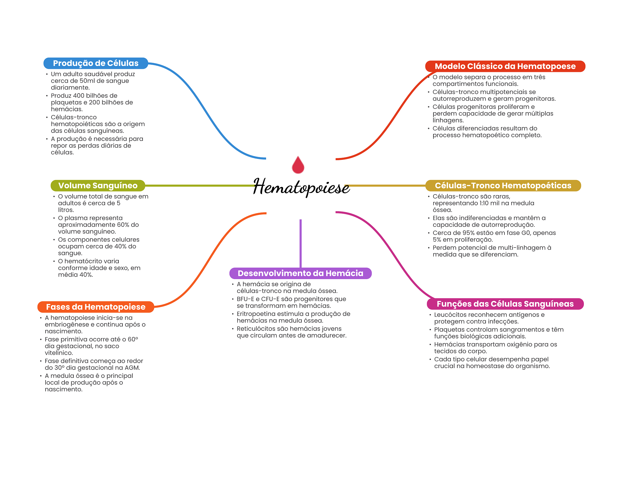 Produção de Células Modelo Clássico da Hematopoese Um adulto saudável produz modelo separa processo em três cerca de 50ml de sangue diariamente. compartimentos funcionais. Produz 400 bilhões de Células-tronco multipotenciais se plaquetas e 200 bilhões de autorreproduzem e geram progenitoras. hemácias. Células progenitoras proliferam e Células-tronco perdem capacidade de gerar múltiplas hematopoiéticas são a origem linhagens. das células sanguíneas. Células diferenciadas resultam do A produção é necessária para processo hematopoético completo. repor as perdas diárias de células. Volume Sanguíneo Hematopoiese Células-Tronco Hematopoéticas volume total de sangue em Células-tronco são raras, adultos é cerca de 5 representando 1:10 mil na medula litros. óssea. plasma representa Elas são indiferenciadas e mantêm a aproximadamente 60% do capacidade de autorreprodução. volume sanguíneo. Cerca de 95% estão em fase apenas Os componentes celulares 5% em proliferação. ocupam cerca de 40% do Perdem potencial de multi-linhagem à sangue. medida que se diferenciam. hematócrito varia conforme idade e sexo, em média 40%. Desenvolvimento da Hemácia A hemácia se origina de células-tronco na medula óssea. BFU-E e CFU-E são progenitores que Fases da Hematopoiese se transformam em hemácias. Funções das Células Sanguíneas Eritropoetina estimula a produção de A hematopoiese inicia-se na Leucócitos reconhecem antígenos e hemácias na medula óssea. embriogênese e continua após protegem contra infecções. nascimento. Reticulócitos são hemácias jovens Plaquetas controlam sangramentos e têm que circulam antes de amadurecer. Fase primitiva ocorre até 60° funções biológicas adicionais. dia gestacional, no saco Hemácias transportam oxigênio para os vitelínico. tecidos do corpo. Fase definitiva começa ao redor Cada tipo celular desempenha papel do 30° dia gestacional na AGM. crucial na homeostase do organismo. A medula óssea é principal local de produção após nascimento.