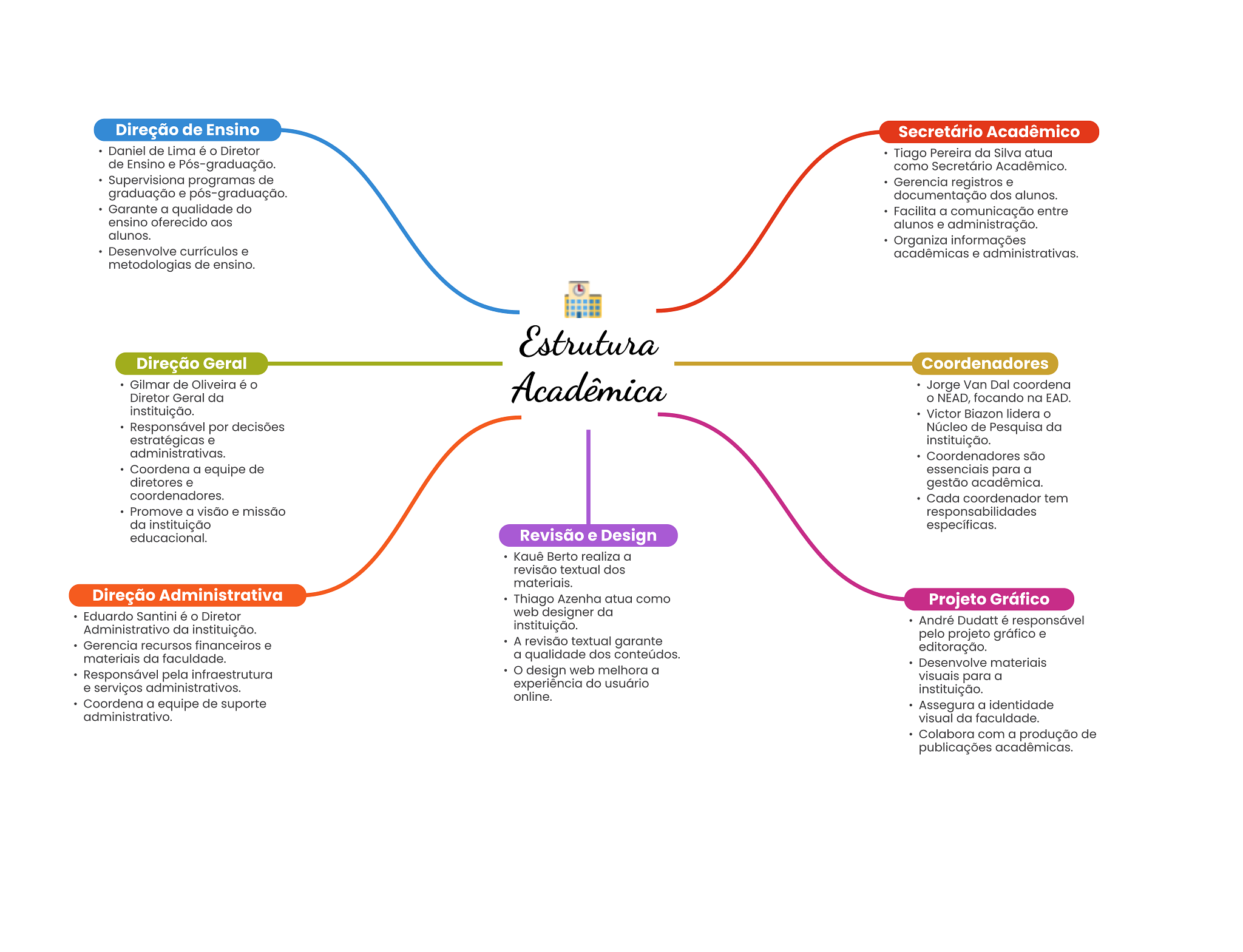 Direção de Ensino Secretário Acadêmico Daniel de Lima é Diretor Tiago Pereira da Silva atua de Ensino e Pós-graduação. como Secretário Acadêmico. Supervisiona programas de Gerencia registros e graduação e pós-graduação. documentação dos alunos. Garante a qualidade do Facilita a comunicação entre ensino oferecido aos alunos e administração. alunos. Organiza informações Desenvolve currículos e acadêmicas e administrativas. metodologias de ensino. Estrutura Direção Geral Coordenadores Gilmar de Oliveira é Diretor Geral da Acadêmica Jorge Van Dal coordena NEAD, focando na EAD. instituição. Victor Biazon lidera Responsável por decisões Núcleo de Pesquisa da estratégicas e instituição. administrativas. Coordenadores são Coordena a equipe de essenciais para a diretores e gestão acadêmica. coordenadores. Cada coordenador tem Promove a visão e missão responsabilidades da instituição específicas. educacional. Revisão e Design Kauê Berto realiza a revisão textual dos materiais. Direção Administrativa Thiago Azenha atua como Projeto Gráfico Eduardo Santini é Diretor web designer da Administrativo da instituição. instituição. André Dudatt é responsável pelo projeto gráfico e Gerencia recursos financeiros e A revisão textual garante editoração. materiais da faculdade. a qualidade dos conteúdos. Desenvolve materiais Responsável pela infraestrutura design web melhora a visuais para a e serviços administrativos. experiência do usuário online. instituição. Coordena a equipe de suporte Assegura a identidade administrativo. visual da faculdade. Colabora com a produção de publicações acadêmicas.