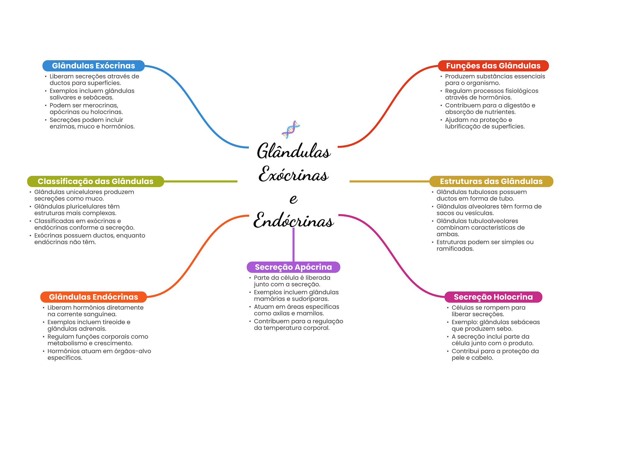 Glândulas Exócrinas Funções das Glândulas Liberam secreções através de Produzem substâncias essenciais ductos para superfícies. para O organismo. Exemplos incluem glândulas Regulam processos fisiológicos salivares e sebáceas. através de hormônios. Podem ser merocrinas, Contribuem para a digestão e apócrinas ou holocrinas. absorção de nutrientes. Secreções podem incluir Ajudam na proteção e enzimas, muco e hormônios. lubrificação de superfícies. Glândulas Exócrinas Classificação das Glândulas Estruturas das Glândulas Glândulas unicelulares produzem Glândulas tubulosas possuem secreções como muco. e ductos em forma de tubo. Glândulas pluricelulares têm Glândulas alveolares têm forma de estruturas mais complexas. sacos ou vesículas. Classificadas em exócrinas e Endócrinas Glândulas tubuloalveolares endócrinas conforme a secreção. combinam características de Exócrinas possuem ductos, enquanto ambas. endócrinas não têm. Estruturas podem ser simples ou ramificadas. Secreção Apócrina Parte da célula é liberada junto com a secreção. Exemplos incluem glândulas Glândulas Endócrinas mamárias e Secreção Holocrina Liberam hormônios diretamente Atuam em áreas específicas Células se rompem para na corrente sanguínea. como axilas e mamilos. liberar secreções. Exemplos incluem tireoide e Contribuem para a regulação Exemplo: glândulas sebáceas glândulas adrenais. da temperatura corporal. que produzem sebo. Regulam funções corporais como A secreção inclui parte da metabolismo e crescimento. célula junto com O produto. Hormônios atuam em órgãos-alvo Contribui para a proteção da específicos. pele e cabelo.