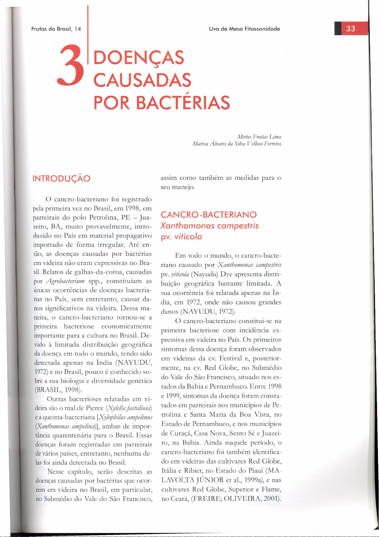 DOENÇAS CAUSADAS , POR BACTERIAS Frutas do Brasil, 14 Uva de Mesa Fitossanidade INTRODUÇÃO o cancro-bacteriano foi registrado pela primeira vez no Brasil, em 1998, em parreirais do polo Petrolina, PE - ]ua- zeiro, BA, muito provavelmente, intro- duzido no País em material propagativo importado de forma irregular. Até en- tão, as doenças causadas por bactérias em videira não eram expressivas no Bra- sil.Relatos de galhas-da-coroa, causadas por Agrobacterium spp., constituíam as únicas ocorrências de doenças bactéria- nas no País, sem entretanto, causar da- nos significativos na videira. Dessa ma- neira, o cancro-bacteriano tornou-se a primeira bacteriose economicamente importante para a cultura no Brasil. De- vido à limitada distribuição geográfica da doença em todo o mundo, tendo sido detectada apenas na Índia (NAYUDU, 1972) e no Brasil, pouco é conhecido so- bre a sua biologia e diversidade genética (BRASIL, 1998). Outras bacterioses relatadas em vi- deirasão o mal de Pierce (XJlella fastidiosa) ea queima-bacteriana [XJlophilus ampelinus (Xanthomonas ampelina)], ambas de impor- tância quarentenária para o Brasil. Essas doenças foram registradas em parreirais devários países, entretanto, nenhuma de- las foi ainda detectada no Brasil. Nesse capítulo, serão descritas as doenças causadas por bactérias que ocor- rem em videira no Brasil, em particular, no Submédio do Vale do São Francisco, Mirtes Frei/as Lima Marisa Alvares da Silva Vel/oso Ferreira assim como também as medidas para o seu maneJo. CANCRO-BACTERIANO Xanthomonas campestris pv, vitico/a Em todo o mundo, o cancro-bacte- riano causado por Xanthomonas campestris pv. viticola (Nayudu) Dye apresenta distri- buição geográfica bastante limitada. A sua ocorrência foi relatada apenas na Ín- dia, em 1972, onde não causou grandes danos (NAYUDU, 1972). O cancro-bacteriano constitui-se na primeira bacteriose com incidência ex- pressiva em videira no País. Os primeiros sintomas dessa doença foram observados em videiras da cv. Festival e, posterior- mente, na cv. Red Globe, no Submédio do Vale do São Francisco, situado nos es- tados da Bahia e Pernambuco. Entre 1998 e 1999, sintomas da doença foram consta- tados em parreirais nos municípios de Pe- trolina e Santa Maria da Boa Vista, no Estado de Pernambuco, e nos municípios de Curaçá, Casa Nova, Sento Sé e ]uazei- ro, na Bahia. Ainda naquele período, o cancro-bacteriano foi também identifica- do em videiras das cultivares Red Globe, Itália e Ribier, no Estado do Piauí (MA- LAVOLTA ]ÚNIOR et al., 1999a), e nas cultivares Red Globe, Superior e Flame, no Ceará, (FREIRE; OLIVEIRA, 2001). Uva de Mesa Fitossanidade Mais recentemente, a doença foi detecta- da em mudas do porta-enxerto IAC 572, em Goiás QUNQUEIRA et al., 2006), e em videiras, em Roraima (HALFELD- VIEIRA; NECHET, 2006). Agente causal No Brasil, a bactéria X. campestris pv. viticola foi isolada de videiras exibindo sin- tomas típicos da doença e identificada em laboratório por meio de testes bioquími- cos, nutricionais e fisiológicos, além de testes de patogenicidade em plantas da cv. Red Globe, que confirmaram ser a bactéria o agente causal da doença (LIMA et al., 1999; MALAVOLTA J' IOR et al., 1999b). A classificação dessa bactéria ainda não está totalmente escla- recida. O estudo taxonórnico do gênero Xanthomonas, realizado por Vauterin et al. (1995), que propôs a reclassificação do gênero em 20 espécies, não incluiu a pv. viticola entre os isolados analisados. Assim, até que novos trabalhos mais detalhados sejam realizados, o patógeno pode ser re- ferido também como X. sp. pv viticola (Nayudu) (VAUTERIN et aI., 1995). A bactéria produz colônias de cor creme-esbranquiçada, arredondadas, con- vexas, brilhantes e de bordos lisos. É gram-negativa, possui metabolismo aeróbico, sendo capaz de crescer in vitro, entre 48h e 72h, a temperaturas de 28°C a 33°C. A ausência do pigmento amare- lo xanthomonadina, particular à grande maioria das espécies do gênero Xanthomonas, é uma característica mar- cante do pv. viticola, quando isolado em meio de cultura. O estudo comparativo por meio de técnicas moleculares entre isolados de X. campestris pv. viticola, coletados de 1998 a 2001, na região de ocorrência da doença no Brasil, e o isolado tipo dessa bactéria, originalmente descrito na Índia, e no qual a descrição dessa bactéria se baseou, indi- caram alta similaridade genética entre os Frutas do Brasil, 14 isolados brasileiros e o isolado indiano, sugerindo uma origem comum entre os dois grupos (TRINDADE et al., 2005). Sintomatologia e epidemiologia Sintomas do cancro-bacteriano sur- gem em ramos, folhas e frutos de videira. Em folhas de plantas afetadas pela doen- ça, observam-se manchas pequenas, de 1 mm a 2 mm de diâmetro, circundadas ou não por um halo amarelado (Figura la), que podem estar localizadas em todo o limbo foliar ou ao longo das nervuras primárias e secundárias, as quais delimi- tam as lesões, tornando-as angulares (Fi- gura 1b). Posteriormente, coalescem, cau- sando a morte de extensas áreas da folha (Figura 1c). Manchas de coloração parda e em forma de "V" também podem sur- gir a partir dos bordos da folha (Figura 1d). Ainda nas folhas, manchas escureci- das e alongadas que evoluem a cancros podem surgir nas nervuras primárias e secundárias e também em pecíolos (Figu- ras 1e e lf). Em ramos verdes e maduros, há o desenvolvimento de cancros, que são fen- dilhamentos longitudinais e de coloração negra (Figuras 2a, 2b e 2c). Com o agra- vamento da infecção, esses, gradualmen- te, alargam-se expondo os tecidos inter- nos. esses cancros, a bactéria permanece latente durante o período seco do ano, mas durante o período chuvoso, há exsu- dação de pus bacteriano. A infecção pode atingir o sistema vascular da planta e a descoloração vascular pode ser verificada em uma pequena extensão, a partir de cor