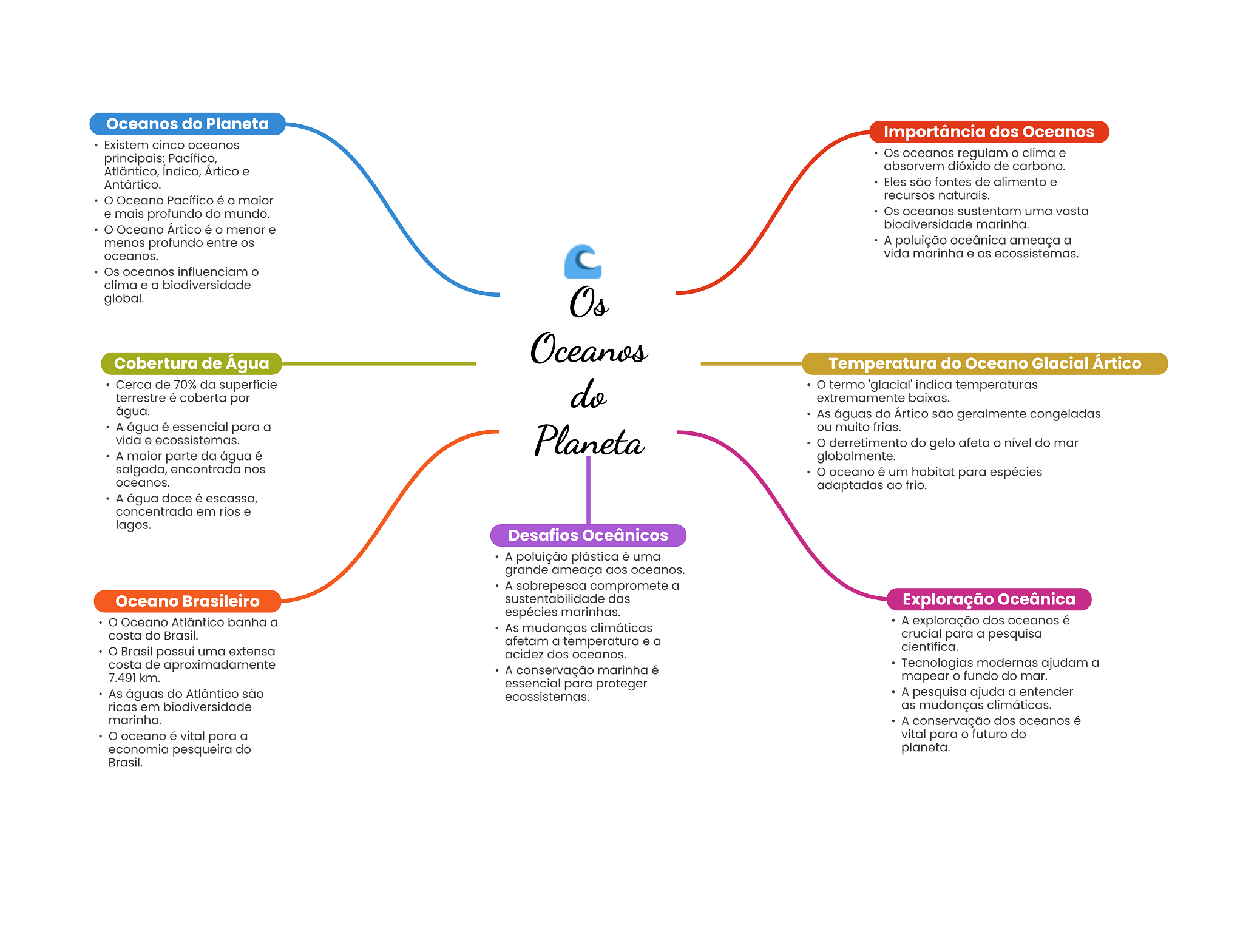 Oceanos do Planeta Importância dos Oceanos Existem cinco oceanos principais: Pacífico, Os oceanos regulam clima e Atlântico, Indico, Ártico e absorvem dióxido de carbono. Antártico. Eles são fontes de alimento e Oceano Pacífico é maior recursos naturais. e mais profundo do mundo. Os oceanos sustentam uma vasta Oceano Ártico é menor e biodiversidade marinha. menos profundo entre A oceânica ameaça a oceanos. vida marinha e ecossistemas. Os oceanos influenciam clima e a biodiversidade global. Os Oceanos Cobertura de Água Temperatura do Oceano Glacial Ártico Cerca de 70% da superfície terrestre é coberta por do termo 'glacial' indica temperaturas extremamente baixas. água. As águas do Ártico são geralmente congeladas A água é essencial para a ou muito frias. vida e ecossistemas. Planeta derretimento do gelo afeta O nível do mar A maior parte da água é globalmente. salgada, encontrada nos oceano é um habitat para espécies oceanos. adaptadas ao frio. A água doce é escassa, concentrada em rios e lagos. Desafios Oceânicos A poluição plástica é uma grande ameaça aos oceanos. A sobrepesca compromete a Oceano Brasileiro das Exploração Oceânica espécies marinhas. Oceano Atlântico banha a A exploração dos oceanos é As mudanças climáticas costa do Brasil. crucial para a pesquisa afetam a temperatura e a Brasil possui uma extensa científica. acidez dos oceanos. costa de aproximadamente Tecnologias modernas ajudam a A conservação marinha é 7.491 km. mapear fundo do mar. essencial para proteger As águas do Atlântico são ecossistemas. A pesquisa ajuda a entender ricas em biodiversidade as mudanças climáticas. marinha. A conservação dos oceanos é oceano é vital para a vital para futuro do economia pesqueira do planeta. Brasil.