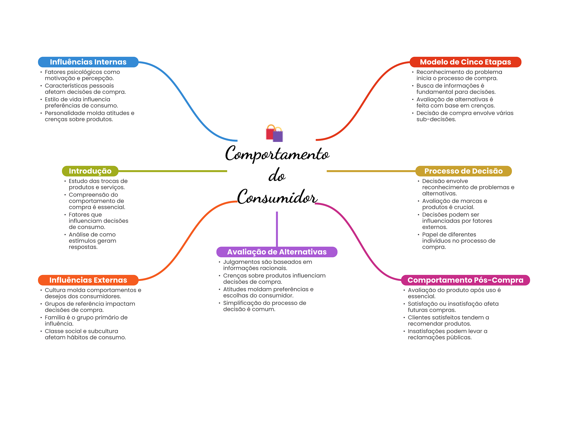 Influências Internas Modelo de Cinco Etapas Fatores psicológicos como Reconhecimento do problema motivação e percepção. inicia processo de compra. Características pessoais Busca de é afetam decisões de compra. fundamental para decisões. Estilo de vida influencia Avaliação de alternativas é preferências de consumo. feita com base em crenças. Personalidade molda atitudes e Decisão de compra envolve várias crenças sobre produtos. sub-decisões. Comportamento Introdução do Processo de Decisão Estudo das trocas de Decisão envolve produtos e serviços. reconhecimento de problemas e Compreensão do comportamento de Consumidor alternativas. Avaliação de marcas e compra é essencial. produtos é crucial. Fatores que Decisões podem ser influenciam decisões influenciadas por fatores de consumo. externos. Análise de como Papel de diferentes estímulos geram indivíduos no processo de respostas. compra. Avaliação de Alternativas Julgamentos são baseados em informações racionais. Crenças sobre produtos influenciam Influências Externas decisões de compra. Comportamento Pós-Compra Cultura molda comportamentos e Atitudes moldam preferências e Avaliação do produto após uso é desejos dos consumidores. escolhas do consumidor. essencial. Grupos de referência impactam Simplificação do processo de Satisfação ou insatisfação afeta decisões de compra. decisão é comum. futuras compras. Família é grupo primário de Clientes satisfeitos tendem a influência. recomendar produtos. Classe social e subcultura Insatisfações podem levar a afetam hábitos de consumo. reclamações públicas.