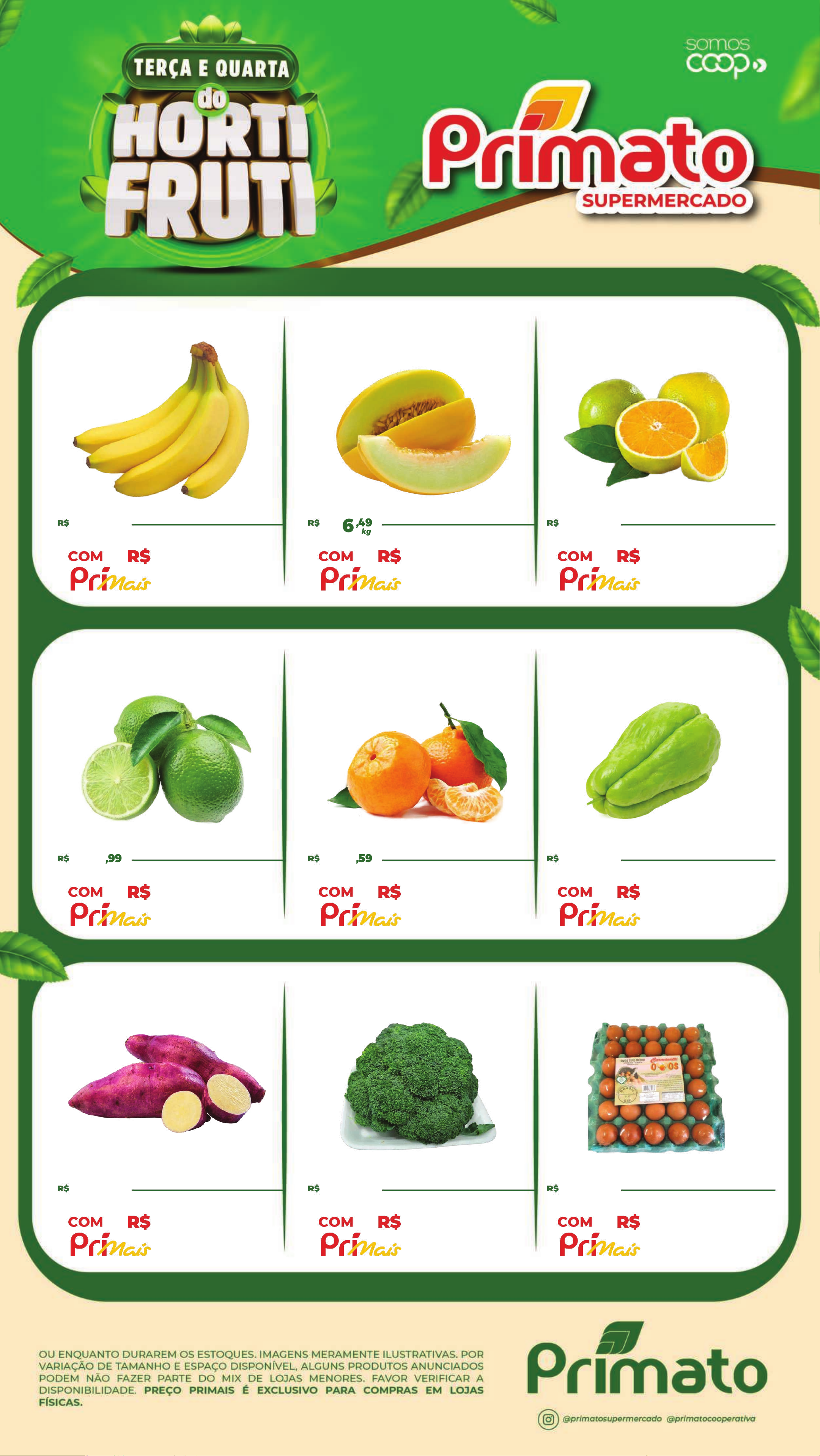 OFERTAS VÁLIDAS PARA OS DIAS 10/03 E 11/03/2026 5 , 99 3 , 99 kg kg BANANA NANICA 6 , 49 4 , 29 kg kg MELÃO 3 , 99 2 , 99 kg kg LARANJA PERA 3 , 99 2 , 19 kg kg LIMÃO TAITI 7 , 59 5 , 99 kg kg PONKAN 5 , 29 3 , 19 kg kg CHUCHU 5 , 89 4 , 29 kg kg BATATA DOCE ROXA 9 , 99 7 , 99 Un Un BANDEJA BRÓCOLIS AMERICANO 23 , 99 19 , 99 Un Un BANDEJA COM 30 OVOS VERMELHO CARMINATTI OFERTAS VÁLIDAS PARA OS DIAS 10/03 E 11/03/2026 37 , 99 32 , 99 kg kg SEM OSSO PONTA DE PEITO BOVINA PRIMATO 18 , 99 13 , 99 kg kg BISTECA SUÍNA PRIMATO COM OU SEM PELE 10 , 99 8 , 99 Un Un IQF FRANGO A PASSARINHO PRIMATO 1KG 9 , 99 7 , 99 Un Un SOLTÍSSIMO MORTADELA SADIA 200G DEFUMADA 4 , 99 4 , 29 Un Un TIPO 01 FEIJÃO PRETO MALÚ 1KG 15 , 99 12 , 99 Un Un AÇÚCAR CRISTAL ALTO ALEGRE 5KG 24 , 99 19 , 99 Un Un PASTA AMENDOIM DR.PEANUT 250G 15 , 99 12 , 99 Un Un GRANOLA JASMINE 250G 62 , 99 52 , 99 KG KG CHIPA TRADICIONAL