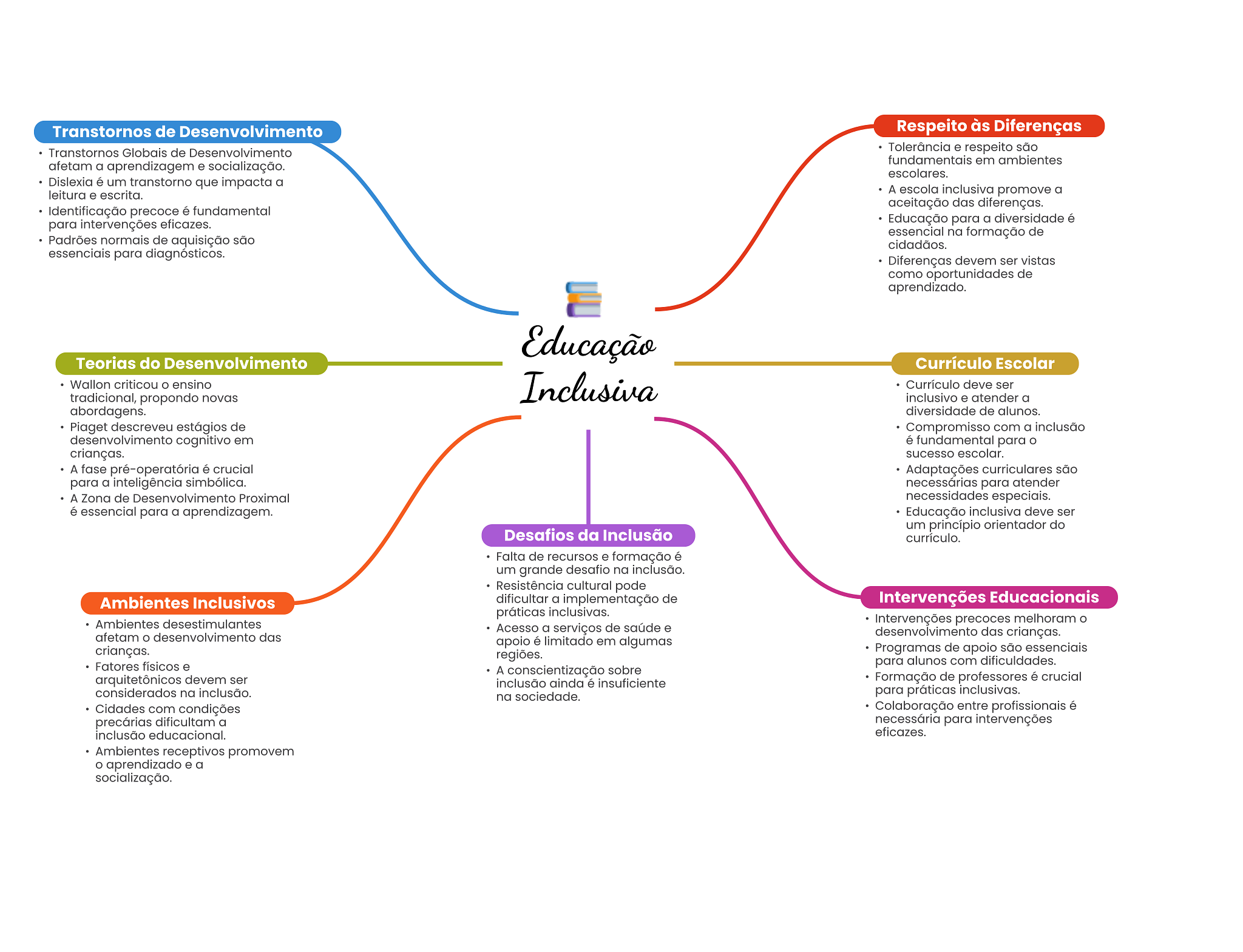 Transtornos de Desenvolvimento Respeito às Diferenças Transtornos Globais de Desenvolvimento Tolerância e respeito são fundamentais em ambientes afetam a aprendizagem e socialização. escolares. Dislexia é um transtorno que impacta a leitura e escrita. A escola inclusiva promove a aceitação das diferenças. Identificação precoce é fundamental para intervenções eficazes. Educação para a diversidade é essencial na formação de Padrões normais de aquisição são cidadãos. essenciais para diagnósticos. Diferenças devem ser vistas como oportunidades de aprendizado. Educação Teorias do Desenvolvimento Currículo Escolar Wallon criticou ensino tradicional, propondo novas Inclusiva Currículo deve ser inclusivo e atender a abordagens. diversidade de alunos. Piaget descreveu estágios de Compromisso com a inclusão desenvolvimento cognitivo em é fundamental para crianças. sucesso escolar. A fase pré-operatória é crucial Adaptações curriculares são para a inteligência simbólica. necessárias para atender A Zona de Desenvolvimento Proximal necessidades especiais. é essencial para a aprendizagem. Educação inclusiva deve ser um princípio orientador do Desafios da Inclusão currículo. Falta de recursos e formação é um grande desafio na inclusão. Resistência cultural pode Ambientes Inclusivos dificultar a implementação de Intervenções Educacionais práticas inclusivas. Ambientes desestimulantes Intervenções precoces melhoram Acesso a serviços de saúde e afetam desenvolvimento das desenvolvimento das crianças. apoio é limitado em algumas crianças. regiões. Programas de apoio são essenciais Fatores físicos e para alunos com dificuldades. A conscientização sobre arquitetônicos devem ser inclusão ainda é insuficiente Formação de professores é crucial considerados na inclusão. na sociedade. para práticas inclusivas. Cidades com condições Colaboração entre profissionais é precárias dificultam a necessária para intervenções inclusão educacional. eficazes. Ambientes receptivos promovem aprendizado e a socialização.