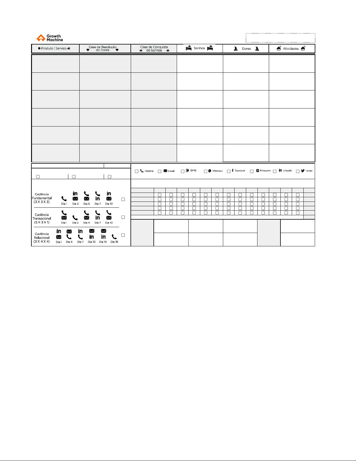 KANBAN PROSPECT [1] 4 5 6 3 2 1 Informe o seu ticket médio ====> R$ 0,00 Irei prospectar meu cliente pelos meios de comunicação abaixo (escolher entre 3 e 4 meios): Marque abaixo o canal de aquisição que será utilizado: Inbound Ativo Inbound Passivo Outbound Dica: Escolha entre 3 e 4 meios de comunicação, pois cadências mistas (contatos por mais de um meio de comunicação) tem maiores chances de sucesso Exemplos de Cadência Outbound Construção de Cadência Insira os dias => 1 ? ? ? ? ? ? ? ? ? ? ? ? Total Pesquisa 0 E-mail 0 Ligação 0 Whatsapp 0 Social Point 0 Critérios e Perguntas de Qualificação Critério 1 Critério 2 Critério 3 Red Flags Red Flag 1 Critério 4 Critério 5 Critério 6 Red Flag 2 KANBAN PROSPECT Serviço; Até 5 vidas; Natal/Mossoró; Unimed - Decisor é o dono [2] 4 5 6 3 2 1 Assistência Médica Cliente com menos de 30 dias de plano adiquirido, funcionário precisou de cirurgia de urgência. [Inserir Empresa] Após a contratação do plano de saúde, toda a equipe fez check-up e aumentou a produtividade Alta produtividade da equipe Afastamento de funcionários por um longo período de tempo por não ter um plano de saúde Gerenciar a empresa toda Coparticipação [Natal Franquias] Utilizava plano do concorrente com custo elevado, se viu na necessidade de procurar um plano com abrangência igual ou superior, que traga custos melhores e menores [Alves e Letelier Advogados Associados] Após a contratação do plano de saúde, conseguimos uma redução de custo de 35% e manutenção da rede credenciada Ter uma equipe bastante motivada que fará com que o resultado financeiro da empresa melhore Equipe desmotivada e baixa produtividade dos funcionários pela falta de benefícios, como o plano de saúde Motivar a equipe Enfermaria [Patrio Consultoria Ltda] O plano existente na empresa não tinha abragência no interior do estado, se vendo na necessidade de buscar um que cobrisse o estado todo [Darlan Diogenes de Araujo] Tranquilidade por está coberto por um dos melhores planos do mercado Aumentar carteira de clientes e fidelizar os clientes atuais devido ao melhor atendimento prestado pelos seus funcionários motivados Problemas com turnover (rotatividade) da equipe por não conseguir reter bons profisisonais que buscam empresas com melhores benefícios Criar meios para reter bons profissionais Rede Fechada [Elevare Comunicação] Devido os aumentos excessivos, sentiu que estava na hora de mudar de plano para algum que atendesse as necessidades e fossem mais barato [Patrio Consultoria Ltda] Tranquilidade por está em uma operadora com rede de atendimento mais abrangente Ter um plano de saúde que atenda aos seus objetivos e planos pessoais Preocupação com o bem estar da família por não ter um plano de saúde e gerar estresse em sua vida pessoal O empresário é o chefe de família e se preocupa com a saúde familiar [S de Medeiros Dantas Marcenaria] Estava na hora de adquirir por medida preventiva Ter um plano de saúde que se encaixe dentro do seu orçamento Ter o dia a dia profissional afetado por problemas médicos de sua família devido a falta de um bom plano de saúde [Darlan Diogenes de Araujo] Se via no risco de utilizar o sistema único de saúde (sus) Ter um relacionamento mais próximo com a corretora e vendedor para solucionar os problemas que surgirem [Se tem plano] - O plano de saúde atual tem um alto valor e isso o impede de contratar outros serviços [Se tem plano] - Dificuldade em emitir uma segunda via de fatura com a corretora atual [Se tem plano] - Dificuldade na indicação de redes para atendimento da especialidade desejada com a corretora atual [Se tem plano] - Dificuldade em falar com o vendedor que fez a venda para reduzir os custos através de um plano mais em conta [Se tem plano] - O plano vigente indicado pela corretora atual não atende suas necessidades Informe o seu ticket médio ====> R$ 0,00 Irei prospectar meu cliente pelos meios de comunicação abaixo (escolher entre 3 e 4 meios): Marque abaixo o canal de aquisição que será utilizado: Inbound Ativo Inbound Passivo Outbound Dica: Escolha entre 3 e 4 meios de comunicação, pois cadências mistas (contatos por mais de um meio de comunicação) tem maiores chances de sucesso Exemplos de Cadência Outbound Construção de Cadência Insira os dias => 1 ? ? ? ? ? ? ? ? ? ? ? ? Total Pesquisa 0 E-mail 0 Ligação 0 Whatsapp 0 Social Point 0 Critérios e Perguntas de Qualificação Critério 1 Critério 2 Critério 3 Red Flags Red Flag 1 Critério 4 Critério 5 Critério 6 Red Flag 2 KANBAN PROSPECT Serviço; Até 5 vidas; Natal/Mossoró; Unimed - Decisor é o dono [2] 4 5 6 3 2 1 * Inbound - O cliente pede para falar com a sua empresa através de um formulário ou ligação telefônica (lead ativo) ou baixa um material rico, como um e-book. (lead reativo) * Outbound - A sua empresa vai atrás do cliente que não conhece a sua marca e que não estava esperando um contato seu. ** Ticket Médio - É calculado dividindo- se a receita total pelo número de vendas ou pelo número de clientes (em negócios recorrentes ) * Inbound Ativo - O cliente pede para falar com a sua empresa através de um formulário ou ligação telefônica (lead ativo) ou baixa um material rico, como um e-book. (lead reativo) * Outbound - A sua empresa vai atrás do cliente que não conhece a sua marca e que não estava esperando um contato seu. ** Ticket Médio - É calculado dividindo- se a receita total pelo número de vendas ou pelo número de clientes (em negócios recorrentes ) Critérios de qualificaçã o: São os critérios necessário s para que um lead e/ou prospect sejam qualificado s, como por exemplo: faturar mais de 2 milhões ao ano, ter mais de 200 funcionário s ou usar um software X. Critérios de Red flags: Uma Red flag ou bandeira vermelha significa um indicador de potenciais problemas para uma venda, ou seja, uma característi ca em potencial que indica que o prospect não tem 