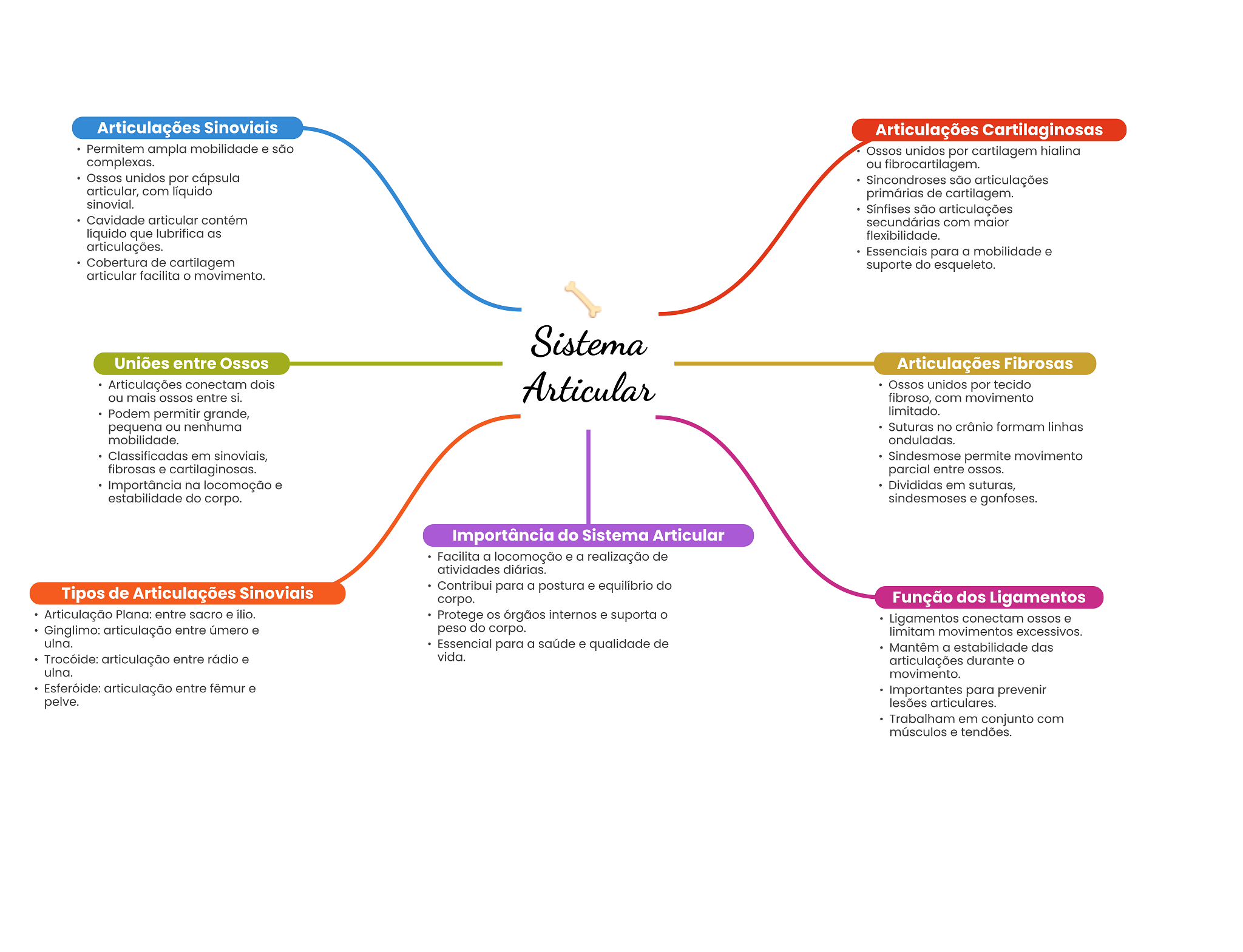 Articulações Sinoviais Articulações Cartilaginosas Permitem ampla mobilidade e são Ossos unidos por cartilagem hialina complexas. ou fibrocartilagem. Ossos unidos por cápsula Sincondroses são articulações articular, com líquido primárias de cartilagem. sinovial. Sínfises são articulações Cavidade articular contém secundárias com maior líquido que lubrifica as flexibilidade. articulações. Essenciais para a mobilidade e Cobertura de cartilagem suporte do esqueleto. articular facilita movimento. Sistema Uniões entre Ossos Articulações Fibrosas Articulações conectam dois ou mais OSSOS entre si. Articular Ossos unidos por tecido fibroso, com movimento Podem permitir grande, limitado. pequena ou nenhuma Suturas no crânio formam linhas mobilidade. onduladas. Classificadas em sinoviais, Sindesmose permite movimento fibrosas e cartilaginosas. parcial entre OSSOS. Importância na locomoção e Divididas em suturas, estabilidade do corpo. sindesmoses e gonfoses. Importância do Sistema Articular Facilita a locomoção e a realização de atividades diárias. Tipos de Articulações Sinoviais Contribui para a postura e equilíbrio do corpo. Função dos Ligamentos Articulação Plana: entre sacro e ílio. Protege os órgãos internos e suporta Ligamentos conectam ossos e Ginglimo: articulação entre úmero e peso do corpo. limitam movimentos excessivos. ulna. Essencial para a saúde e qualidade de Mantêm a estabilidade das Trocóide: articulação entre rádio e vida. articulações durante ulna. movimento. Esferóide: articulação entre fêmur e Importantes para prevenir pelve. lesões articulares. Trabalham em conjunto com músculos e tendões.