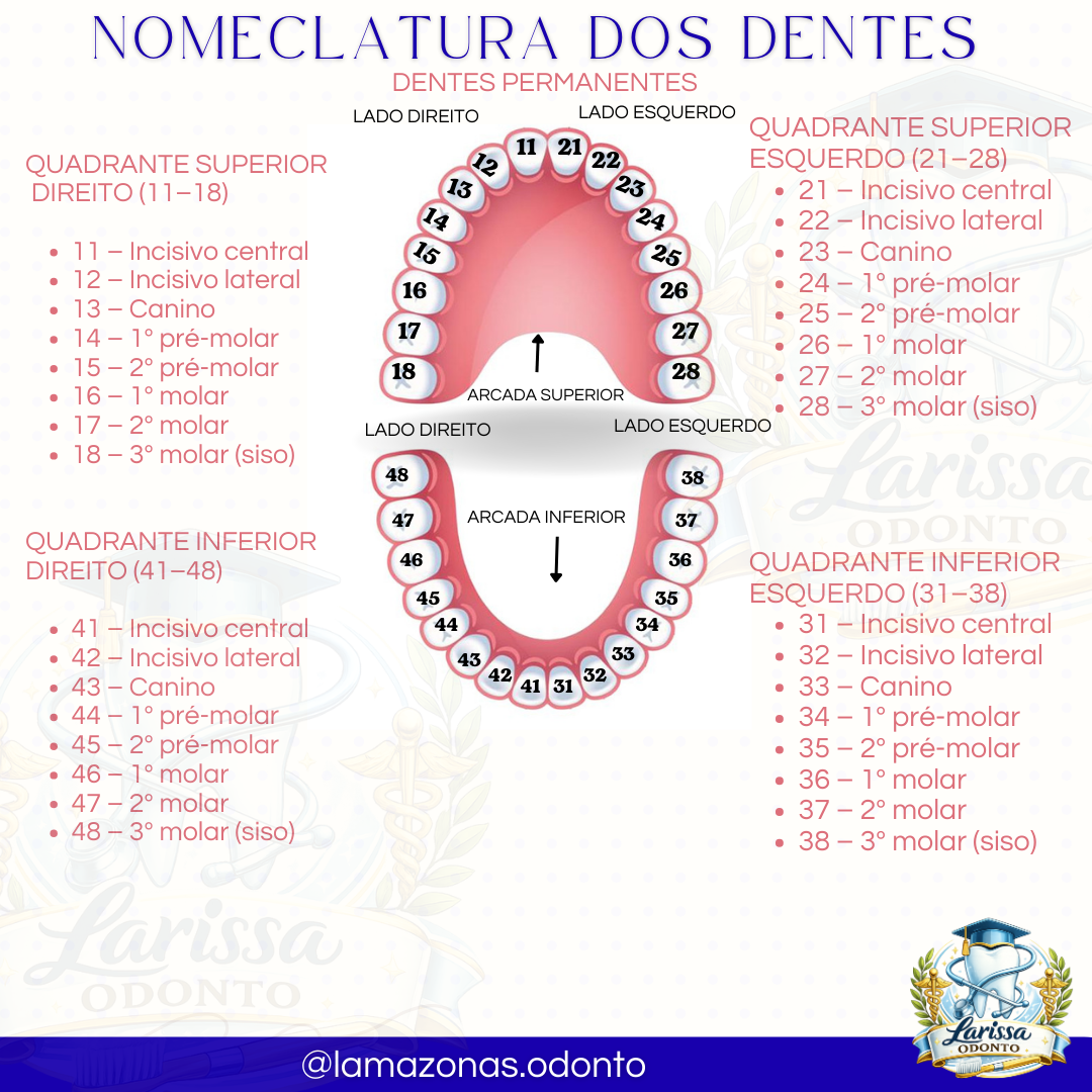 NOMECLATURA DOS DENTES DENTES PERMANENTES LADO DIREITO LADO ESQUERDO QUADRANTE SUPERIOR 11 21 QUADRANTE SUPERIOR 22 ESQUERDO (21-28) DIREITO (11-18) 13 23 21 - Incisivo central 24 22 - Incisivo lateral 11 - Incisivo central 15 25 23 - Canino 12 Incisivo lateral 16 26 24 - 1° pré-molar 13 - Canino 25 - 2° pré-molar 14 - 1° pré-molar 17 27 26 1° molar 15 - 2° pré-molar 18 28 27 - 2° molar 16 1° molar ARCADA SUPERIOR 28 - - 3° molar (siso) 17 2° molar LADO DIREITO LADO ESQUERDO 18 3° molar (siso) 48 38 Larissa 47 ARCADA INFERIOR 37 QUADRANTE INFERIOR 46 36 DIREITO (41-48) QUADRANTE INFERIOR 45 35 ESQUERDO (31-38) 41 - Incisivo central 44 34 31 - Incisivo central 42 - Incisivo lateral 43 33 32 - Incisivo lateral 42 32 43 - Canino 41 31 33 - - Canino 44 - 1° pré-molar 34 - - 1° pré-molar 45 - 2° pré-molar 35 - 2° pré-molar 46 - 1° molar 36 - 1° molar 47 - 2° molar 37 - 2° molar 48 - 3° molar (siso) 38 - 3° molar (siso) arissa ODONTO ODONTO @lamazonas.odonto