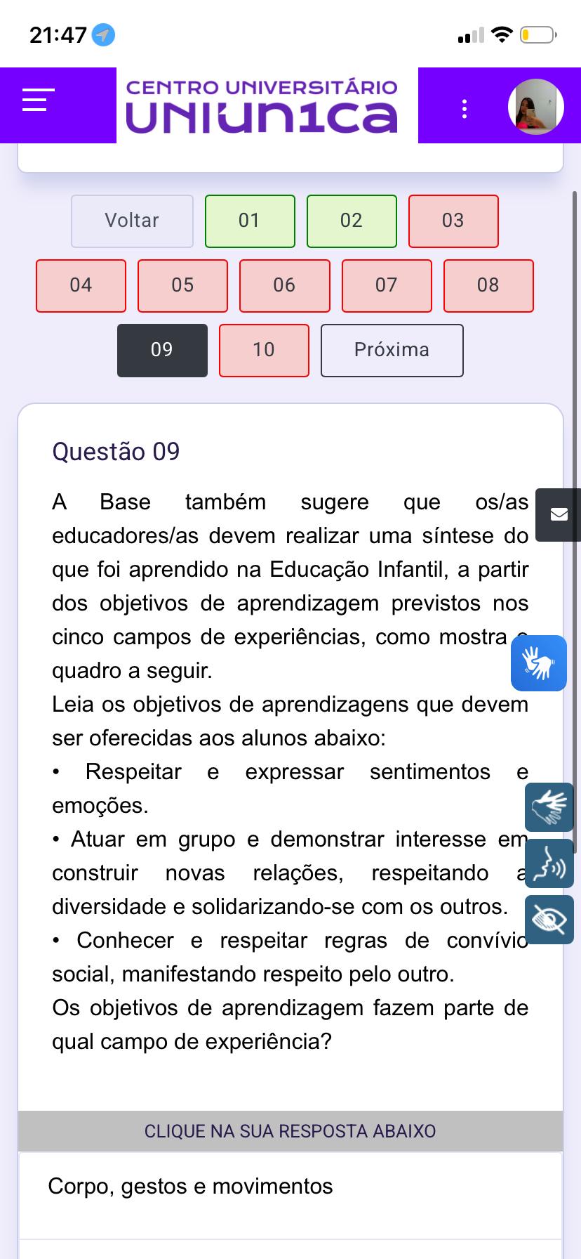 21:47 CENTRO UNIVERSITÁRIO ... Voltar 01 02 03 04 05 06 07 08 09 10 Próxima Questão 09 A Base também sugere que os/as educadores/as devem realizar uma síntese do que foi aprendido na Educação Infantil, a partir dos objetivos de aprendizagem previstos nos cinco campos de experiências, como mostra quadro a seguir. Leia os objetivos de aprendizagens que devem ser oferecidas aos alunos abaixo: Respeitar e expressar sentimentos e emoções. Atuar em grupo e demonstrar interesse em construir novas relações, respeitando a diversidade e solidarizando-se com os outros. Conhecer e respeitar regras de convívio social, manifestando respeito pelo outro. Os objetivos de aprendizagem fazem parte de qual campo de experiência? CLIQUE NA SUA RESPOSTA ABAIXO Corpo, gestos e movimentos