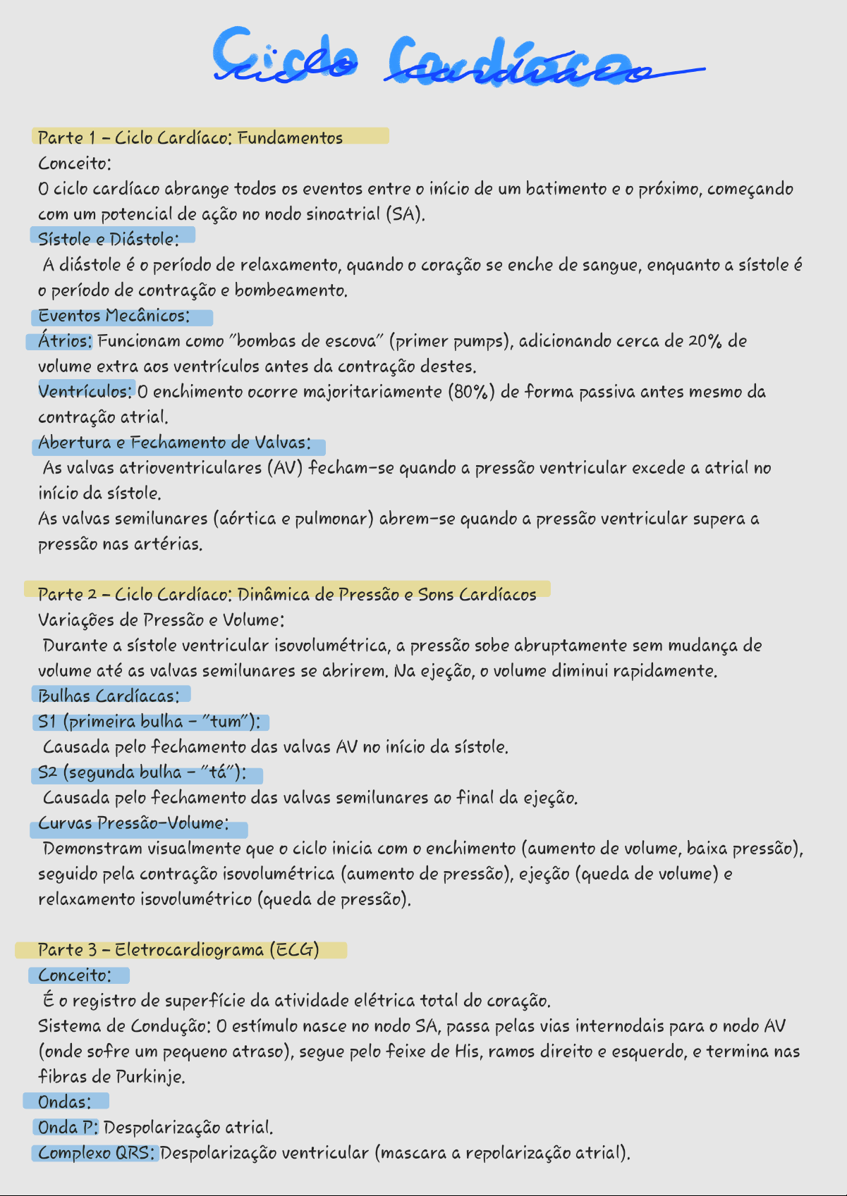 Parte 1 Ciclo Cardíaco: Fundamentos Conceito: ciclo cardíaco abrange todos eventos entre início de um batimento e próximo, começando com um potencial de ação no nodo sinoatrial (SA). Sístole e Diástole: A diástole é período de relaxamento, quando coração se enche de sangue, enquanto a sístole é período de contração e bombeamento. Eventos Mecânicos: Átrios: Funcionam como "bombas de escova" (primer pumps), adicionando cerca de 20% de volume extra ventrículos antes da contração destes. Ventrículos: enchimento ocorre majoritariamente (80%) de forma passiva antes mesmo da contração atrial. Abertura e Fechamento de Valvas: As valvas atrioventriculares (AV) fecham-se quando a pressão ventricular excede a atrial no início da sístole. As valvas semilunares (aórtica e pulmonar) abrem-se quando a pressão ventricular supera a pressão nas artérias. Parte 2 Ciclo Cardíaco: Dinâmica de Pressão e Sons Cardíacos Variações de Pressão e Volume: Durante a sístole ventricular isovolumétrica, a pressão sobe abruptamente sem mudança de volume até as valvas semilunares se abrirem. Na ejeção, volume diminui rapidamente. Bulhas Cardíacas: S1 (primeira bulha "tum"): Causada pelo fechamento das valvas AV no início da sístole. S2 (segunda bulha "tá"): Causada pelo fechamento das valvas semilunares final da ejeção. Curvas Pressão-Volume: Demonstram visualmente que ciclo inicia com enchimento (aumento de volume, baixa pressão), seguido pela contração isovolumétrica (aumento de pressão), ejeção (queda de volume) e relaxamento isovolumétrico (queda de pressão). Parte 3 Eletrocardiograma (ECG) Conceito: É registro de superfície da atividade elétrica total do coração. Sistema de Condução: estímulo nasce no nodo SA, passa pelas vias internodais para nodo AV (onde sofre um pequeno atraso), segue pelo feixe de His, ramos direito e esquerdo, e termina nas fibras de Purkinje. Ondas: Onda P: Despolarização atrial. Complexo QRS: Despolarização ventricular (mascara a repolarização atrial).Onda T: Repolarização ventricular. Intervalos: segmento P-R reflete a condução elétrica através do nodo AV e fascículo AV. Interpretação Simples: ECG fornece informações sobre a frequência, ritmo e a saúde dos tecidos cardíacos. Parte 4 1. que é Débito Cardíaco (DC)? débito cardíaco é a medida do desempenho do coração como uma bomba. Ele representa volume de sangue bombeado por cada ventrículo por minuto. A Fórmula Mestra: cálculo do débito cardíaco é: DC = FC VS. FC (Frequência Cardíaca): número de batimentos por minuto (bpm). VS (Volume Sistólico): A quantidade de sangue ejetada em cada batimento. Valores de Referência: Em uma pessoa média em repouso, DC é de aproximadamente 5 litros por minuto. Durante exercícios intensos, esse valor pode subir para 30 a 35 L/min em atletas, para suprir a alta demanda de oxigênio dos músculos. 2. que é a Frequência Cardíaca (FC)? A frequência cardíaca é a velocidade com que coração bate. Quem manda no ritmo? ritmo básico é determinado pelo nodo sinoatrial (SA), localizado no átrio direito, que atua como marcapasso natural do coração. Faixas Normais: Em adultos sedentários, a FC de repouso costuma ficar entre 60 e 100 bpm. Frequências acima de 100 bpm são chamadas de taquicardia, e abaixo de 60 bpm, bradicardia. 3. Como corpo controla a Frequência Cardíaca? Embora nodo SA inicie batimento, sistema nervoso autônomo ajusta a velocidade conforme necessário através de um controle antagônico: Sistema Parassimpático (Freio): Atua principalmente via nervo vago, liberando acetilcolina. Isso hiperpolariza as células do marcapasso, retardando a taxa de despolarização e, consequentemente, diminuindo a FC. Sistema Simpático (Acelerador): Libera adrenalina e noradrenalina, que se ligam a receptores beta-1 no coração. Isso aumenta fluxo de íons nas células do marcapasso, acelerando a despolarização e aumentando a FC. 4. Papel do Volume Sistólico (VS) Para débito cardíaco estar completo, a FC depende do volume ejetado. é calculado pela diferença entre volume de sangue no ventrículo antes de contrair (Volume Diastólico Final VDF) e que sobra após a contração (Volume Sistólico Final VSF). Exemplo em repouso: Se um ventrículo tem 135 de sangue (VDF) e sobra 65 após bater (VSF), volume sistólico é de 70 por batimento. 5. Diferença no Atleta Um ponto interessante das fontes é que atletas bem treinados apresentam bradicardia de repouso (FC frequentemente abaixo de 60 bpm). Isso não significa que coração deles é fraco; pelo contrário, coração de atleta é tão eficiente e tem um volume sistólico tão grande que ele consegue manter mesmo débito cardíaco batendo menos vezes do que coração de uma pessoasedentária Parte 5 Pré-carga e Pré-carga: É grau de estiramento do miocárdio antes da contração, determinado pelo retorno venoso e pelo volume diastólico final. É a "carga" ou resistência que ventrículo deve vencer para ejetar sangue, fortemente relacionada à pressão arterial média. Desempenho: aumento da pós-carga pode reduzir volume sistólico se coração não aumentar sua força de contração. Parte 6 Lei de Frank-Starling Conceito: Capacidade intrínseca do coração de se adaptar a volumes crescentes de afluxo sanguíneo. Mecanismo: Quanto mais músculo cardíaco é distendido (estirado) durante enchimento, maior será a força de contração e maior a quantidade de sangue bombeada. Fisiologia: estiramento posiciona filamentos de actina e miosina em um grau de superposição ideal para gerar força. Parte 7 Adaptações Cardíacas GO Exercício Físico Respostas Agudas: Aumento rápido do débito cardíaco e melhor distribuição do fluxo sanguíneo para músculos ativos. Adaptações Crônicas (Coração de Atleta): Hipertrofia Fisiológica: Aumento simétrico das paredes ventriculares e da cavidade, mantendo a função sistólica e diast