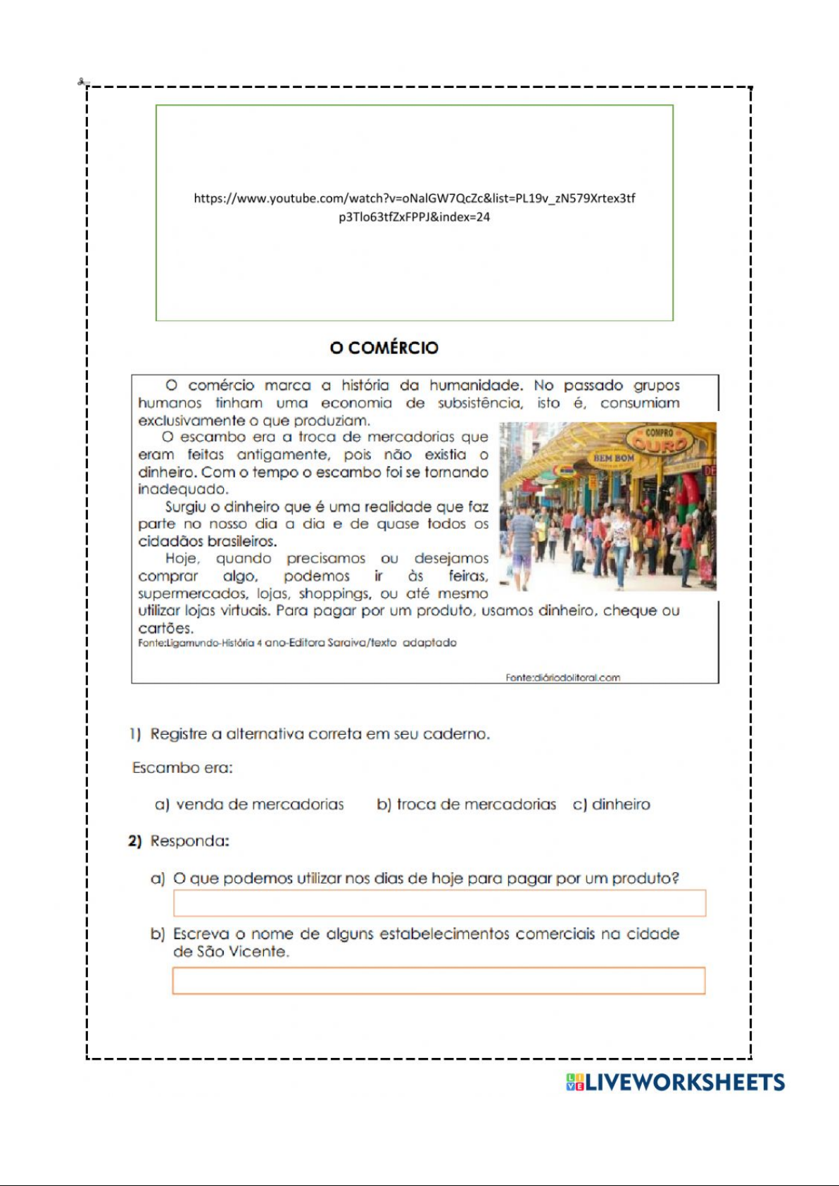 p3Tlo63tfZxFPPJ&index=24 COMÉRCIO comércio marca a história da humanidade. No passado grupos humanos tinham uma economia de subsistência, isto é, consumiam exclusivamente que produziam. escambo era a troca de mercadorias que COMPRO eram feitas antigamente, pois não existia BEM BOM dinheiro. Com tempo o escambo foi se tornando inadequado. Surgiu dinheiro que é uma realidade que faz parte no nosso dia a dia e de quase todos cidadãos brasileiros. Hoje, quando precisamos OU desejamos comprar algo, podemos ir às feiras, supermercados, lojas, shoppings, até mesmo utilizar lojas virtuais. Para pagar por um produto, usamos dinheiro, cheque ou cartões. 4 ano-Editora Saraiva/texto adaptado 1) Registre a alternativa correta em seu caderno. Escambo era: a) venda de mercadorias b) troca de mercadorias c) dinheiro 2) Responda: a) que podemos utilizar nos dias de hoje para pagar por um produto? b) Escreva nome de alguns estabelecimentos comerciais na cidade de São Vicente.