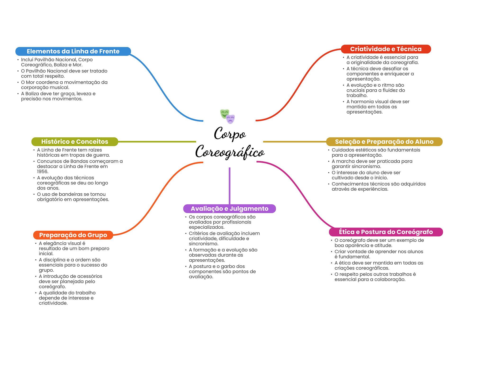 Elementos da Linha de Frente Criatividade e Técnica Inclui Pavilhão Nacional, Corpo A criatividade é essencial para Coreográfico, Baliza e Mor. a originalidade da coreografia. A técnica deve desafiar os Pavilhão Nacional deve ser tratado com total respeito. componentes e enriquecer a apresentação. Mor coordena a movimentação da corporação musical. A evolução e ritmo são cruciais para a fluidez do A Baliza deve ter graça, leveza e trabalho. precisão nos movimentos. A harmonia visual deve ser mantida em todas as apresentações. Corpo Histórico e Conceitos Seleção e Preparação do Aluno A Linha de Frente tem raízes Coreográfico Cuidados estéticos são fundamentais históricas em tropas de guerra. para a apresentação. Concursos de Bandas começaram a A marcha deve ser praticada para destacar a Linha de Frente em garantir sincronismo. 1956. O interesse do aluno deve ser A evolução das técnicas cultivado desde início. coreográficas se deu ao longo Conhecimentos técnicos são adquiridos dos anos. através de experiências. uso de bandeiras se tornou obrigatório em apresentações. Avaliação e Julgamento Os corpos coreográficos são avaliados por profissionais especializados. Preparação do Grupo Critérios de avaliação incluem Ética e Postura do Coreógrafo criatividade, dificuldade e coreógrafo deve ser um exemplo de A elegância visual é sincronismo. boa aparência e atitude. resultado de um bom preparo A formação e a evolução são inicial. Criar vontade de aprender nos alunos observadas durante as é fundamental. A disciplina e a ordem são apresentações. essenciais para sucesso do A ética deve ser mantida em todas as A postura e garbo dos grupo. criações coreográficas. componentes são pontos de A introdução de acessórios avaliação. respeito pelos outros trabalhos é deve ser planejada pelo essencial para a colaboração. coreógrafo. A qualidade do trabalho depende de interesse e criatividade.