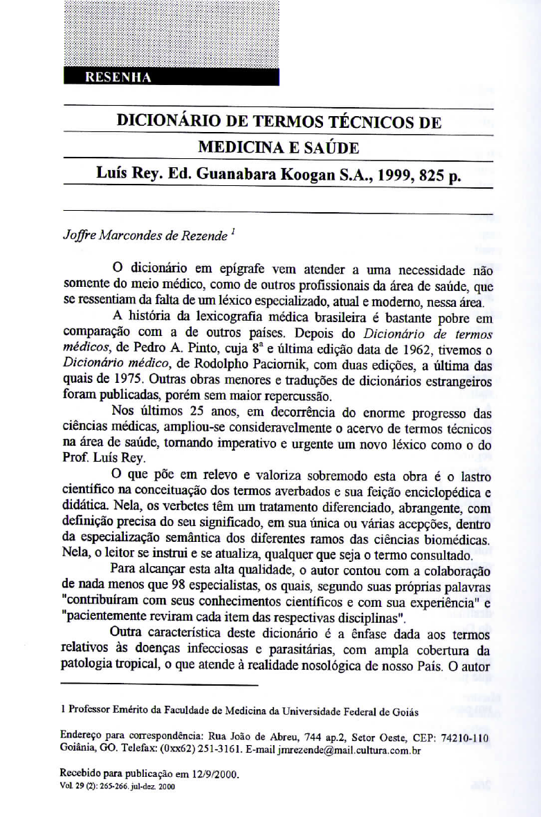 RESENHA DICIONÁRIO DE TERMOS TÉCNICOS DE MEDICINA E SAÚDE Luís Rey. Ed. Guanabara Koogan S.A., 1999, 825 p. Joffre Marcondes de Rezende! O dicionário em epígrafe vem atender a uma necessidade não somente do meio médico, como de outros profissionais da área de saúde, que se ressentiam da falta de um léxico especializado, atual e moderno, nessa área. A história da lexicografia médica brasileira é bastante pobre em comparação com a de outros países. Depois do Dicionário fie termos médicos, de Pedro A. Pinto, cuja 8a e última edição data de 1962, tivemos o Dicionário médico, de Rodolpho Paciornik, com duas edições, a última das quais de 1975. Outras obras menores e traduções de dicionários estrangeiros foram publicadas, porém sem maior repercussão. Nos últimos 25 anos, em decorrência do enorme progresso das ciências médicas, ampliou-se consideravelmente o acervo de termos técnicos na área de saúde, tornando imperativo e urgente um novo léxico como o do Prof. Luís Rey. O que põe em relevo e valoriza sobremodo esta obra é o lastro científico na conceituação dos termos averbados e sua feição enciclopédica e didática. Nela, os verbetes têm um tratamento diferenciado, abrangente, com definição precisa do seu significado, em sua única ou várias acepções, dentro da especialização semântica dos diferentes ramos das ciências biomédicas. Nela, o leitor se instrui e se atualiza, qualquer que seja o termo consultado. Para alcançar esta alta qualidade, o autor contou com a colaboração de nada menos que 98 especialistas, os quais, segundo suas próprias palavras "contribuíram com seus conhecimentos científicos e com sua experiência" c "pacientemente reviram cada item das respectivas disciplinas". Outra característica deste dicionário é a ênfase dada aos termos relativos às doenças infecciosas e parasitárias, com ampla cobertura da patologia tropical, o que atende à realidade nosológica de nosso País. O autor l Professor Emérito da Faculdade de Medicina da Universidade Federa] de Goiás Endereço para correspondência: Rua João de Abreu, 744 ap.2, Setor Oeste, CEP: 74210-110 Goiânia, GO. Telefax: (Oxx62) 251-3161. E-matljmrezende@maiI.cultura.com.br Recebido para publicação em 12/9/2000. Vol 29 (2): 265-266. jul-dez. 2000 seguiu a Nomenclatura Internacional das Doenças do CIOMS/OMS, embora registre os sinónimos mais usados, com remissão para o termo que deve prevalecer. Ao final de cada verbete encontra-se o termo equivalente em inglês, o que é muito importante na época atual de hegemonia da língua inglesa nas comunicações científicas e contribui para evitar os falsos cognatos que infestam as traduções de livros técnicos no Brasil. O dicionário do Prof. Rey prima ainda pela clareza e correção da linguagem, perfeito domínio do idioma pátrio e cuidadosa revisão tipográfica. As questões linguisticas mais polémicas foram tratadas com sabedoria e bom senso, sem as amarras do puritanismo vernáculo e atentando para a tradição da linguagem técnica usada em biologia e medicina. Citamos como exemplos as opções adotadas para as palavras acalásia, amilase, anquilose, autópsia, catéter, colecistocinina, crassa, dengue (s.m.), diabetes (s.m.), dissecção, espinhal, estádio, hemácia, lipídio, má-absorção, óptico, parasito, peritônio, retardo, entre outras. Discordamos do Prof. Rey somente em duas de suas opções. A primeira delas se refere às palavras formadas com o determinado grego -soma, tais como cromossoma, desmossoma, ribossoma etc, em que este radical foi modificado para -somo. cromossomo, desmossomo, ribossomo etc. A razão é'simples: as palavras derivadas do grego com a terminação em ma já são do género masculino (ex.: edema, eczema, mioma, sintoma, toxoplasma etc.), não se justificando a descaracterização do radical. A segunda diz respeito à tireóide e seus cognatos, em que foi adotada a raiz -tireo, em lugar de tiro, em desacordo com a Nomina Anatómica. Retiraríamos também o termo enfarte como sinónimo de infario e consideraríamos cólera, doença, somente do género masculino, tal como dengue. Com estas poucas ressalvas, o dicionário do Prof. Rey nos liberta da tutela dos dicionários gerais, cujos autores, embora conhecedores da língua portuguesa, ignoram as peculiaridades e a tradição da terminologia científica. Consideramos o trabalho do Prof. Rey um marco na história da lexicografia biomédica, nivelado aos melhores léxicos internacionais e destinado a sobreviver em muitas edições futuras, a exemplo do Stedman's e do Dorland's, em inglês. É óbvio que nenhuma obra desse porte nasce perfeita e acabada e por isso deve ser revista, aprimorada e atualizada em cada nova edição, para que possa firmar-se como obra de referência ao longo do tempo. Do ponto de vista da editoração, nas próximas edições poderia ser usado um papel de menor gramatura, o que tornaria o dicionário de mais fácil manuseio. Recomendamos o dicionário do Prof. Rey como a melhor obra do género existente atualmente em língua portuguesa. 266 REVISTA DE PATOLOGIA TROPICAL