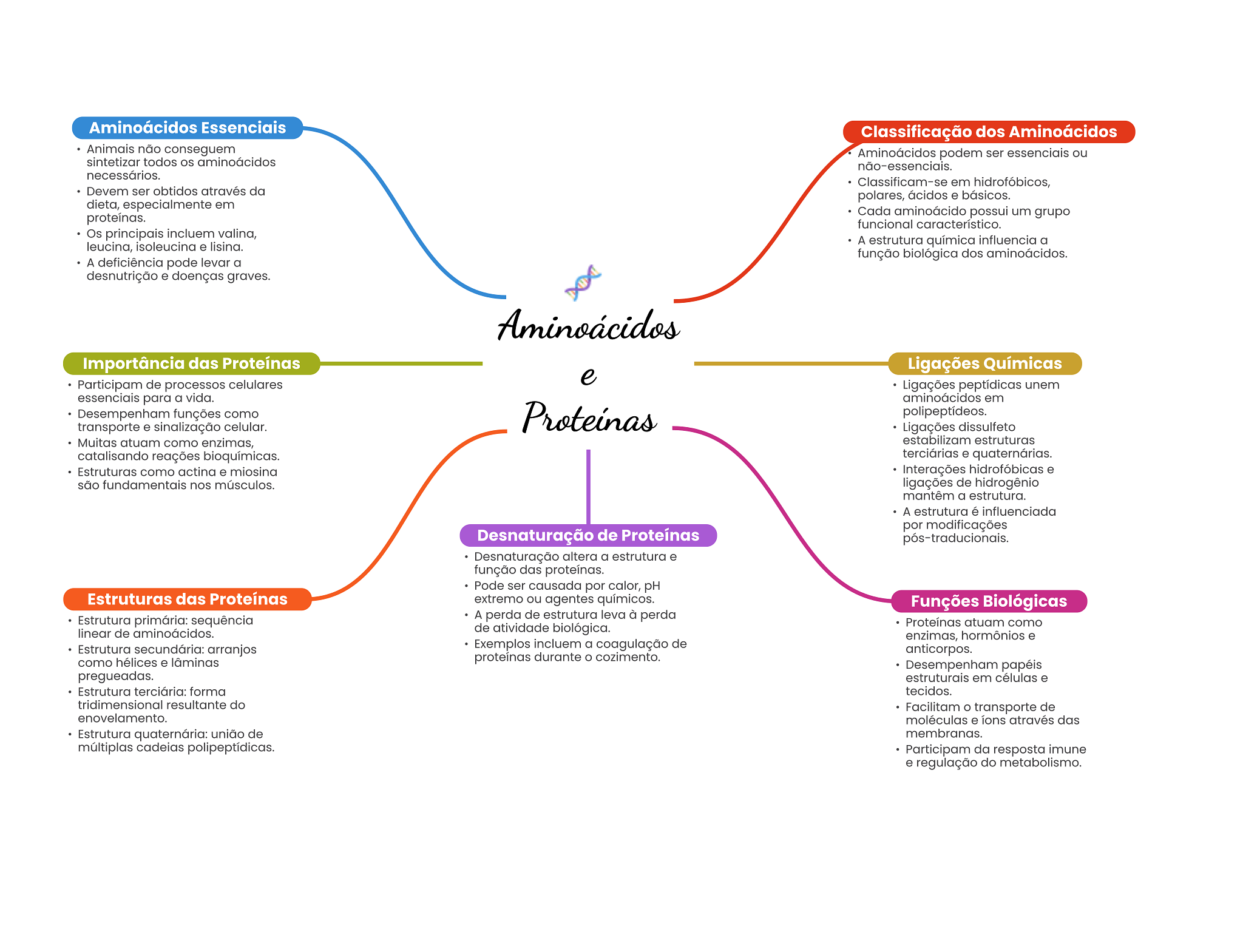 Aminoácidos Essenciais Classificação dos Aminoácidos Animais não conseguem Aminoácidos podem ser essenciais ou sintetizar todos OS aminoácidos não-essenciais. necessários. Classificam-se em hidrofóbicos, Devem ser obtidos através da polares, ácidos e básicos. dieta, especialmente em proteínas. Cada aminoácido possui um grupo funcional característico. Os principais incluem valina, leucina, isoleucina e lisina. A estrutura química influencia a função biológica dos aminoácidos. A deficiência pode levar a desnutrição e doenças graves. Aminoácidos Importância das Proteínas Ligações Químicas e Participam de processos celulares Ligações peptídicas unem essenciais para a vida. aminoácidos em Desempenham funções como Proteínas polipeptídeos. transporte e sinalização celular. Ligações dissulfeto Muitas atuam como enzimas, estabilizam estruturas catalisando reações bioquímicas. terciárias e quaternárias. Estruturas como actina e miosina Interações hidrofóbicas e são fundamentais nos músculos. ligações de hidrogênio mantêm a estrutura. A estrutura é influenciada por modificações Desnaturação de Proteínas pós-traducionais. Desnaturação altera a estrutura e função das proteínas. Pode ser causada por calor, pH Estruturas das Proteínas extremo ou agentes químicos. Funções Biológicas Estrutura primária: sequência A perda de estrutura leva à perda Proteínas atuam como linear de aminoácidos. de atividade biológica. enzimas, hormônios e Estrutura secundária: arranjos Exemplos incluem a coagulação de anticorpos. como hélices e lâminas proteínas durante o cozimento. Desempenham papéis pregueadas. estruturais em células e Estrutura terciária: forma tecidos. tridimensional resultante do Facilitam transporte de enovelamento. moléculas e íons através das Estrutura quaternária: união de membranas. múltiplas cadeias polipeptídicas. Participam da resposta imune e regulação do metabolismo.